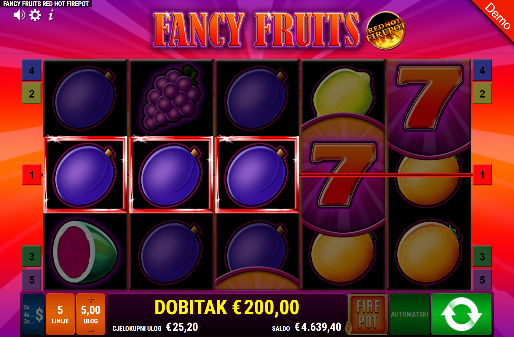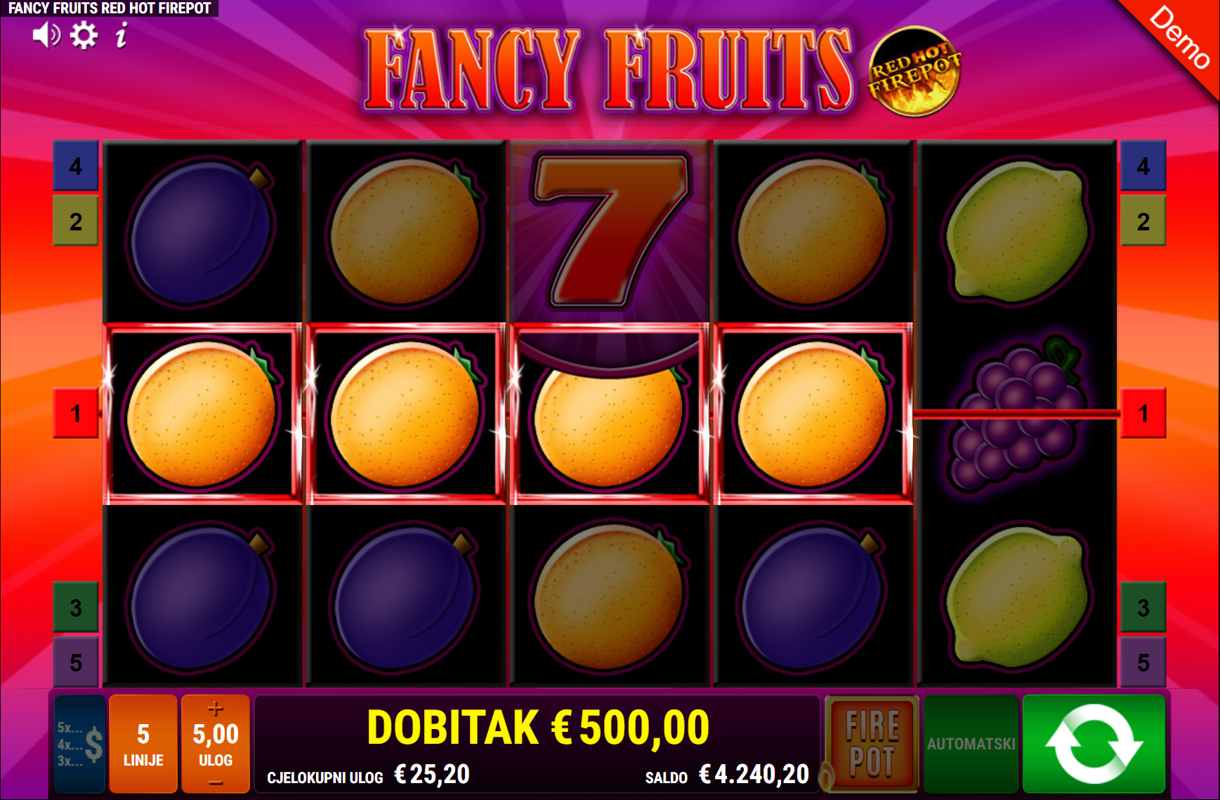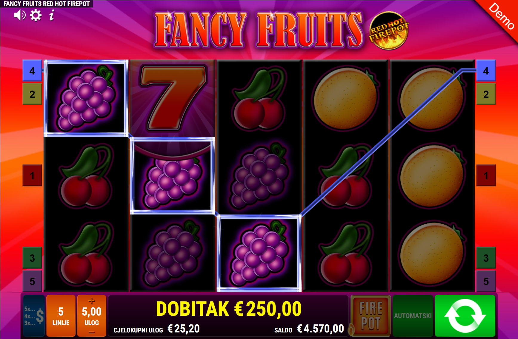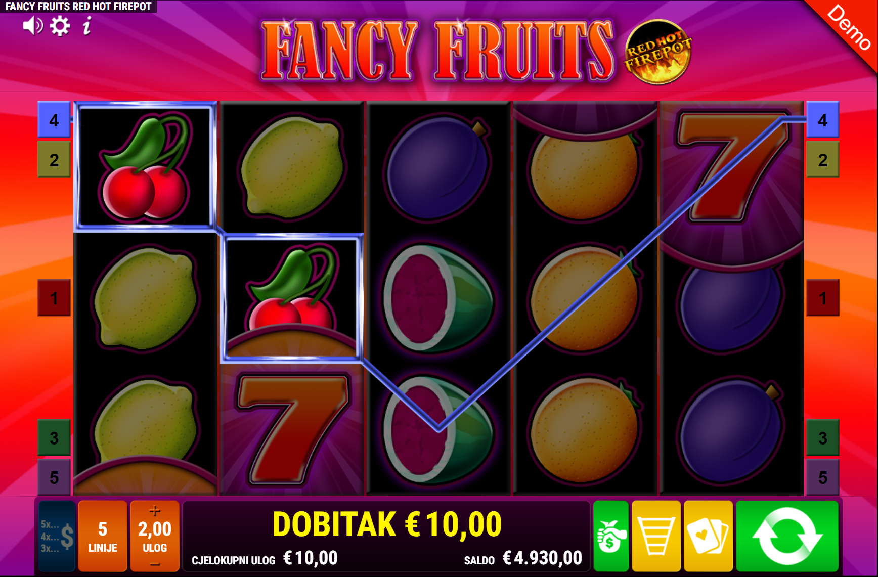 Fancy Fruits RHFP vodi svoje igrače kroz zabavnu avanturu obogaćenu pažljivo ilustriranim voćnim simbolima uz dodatak zlatnih efekata. Super jednostavan način igranja omogučiti će igračima dugotrajnu zabavu, a kako bi ona također bila i uzbudljiva pobrinuti će se Fancy Fruits RHFP simboli sedmice i jackpot igra koji će tvoje dobitke pretvoriti u veće i učestalije. Ako voliš igre koje ti pružaju izvrstan omjer rizika i dobitaka došao si na pravo mjesto! Prepusti se zabavi i užitku te sa sobom odnesi velike dobitke!