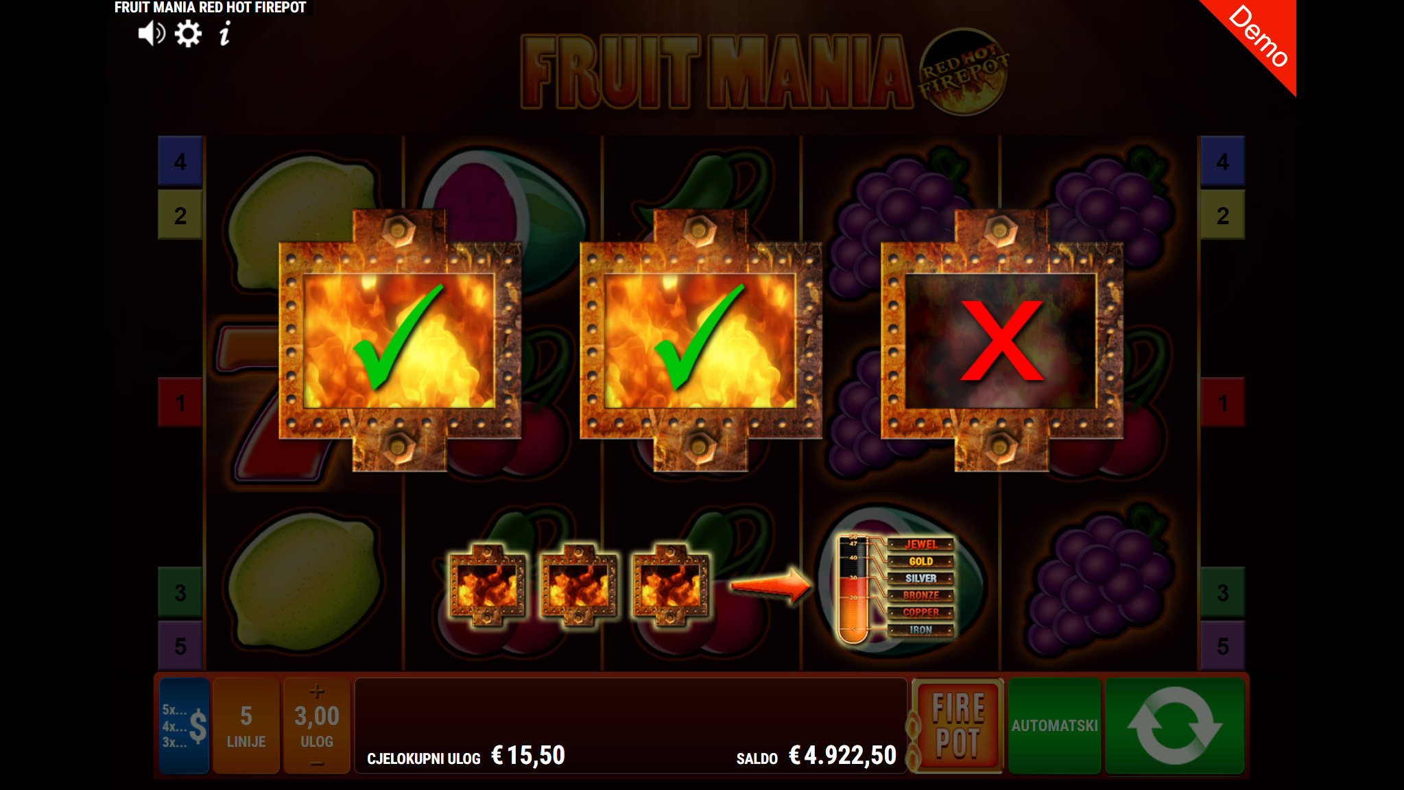 Fruit Mania RHFP slot bubanj sastoji se od pet koluta i tri reda. Igrači na raspolaganju imaju sedam različitih simbola. Fruit Mania RHFP igra ne sadrži wild simbole. Uz dodatni ulog, aktivira se značajka Red Hot Firepot koja može aktivirati bonus jackpot igru sa svakim okretajem. Igračima je dostupno pet dobitnih linija.