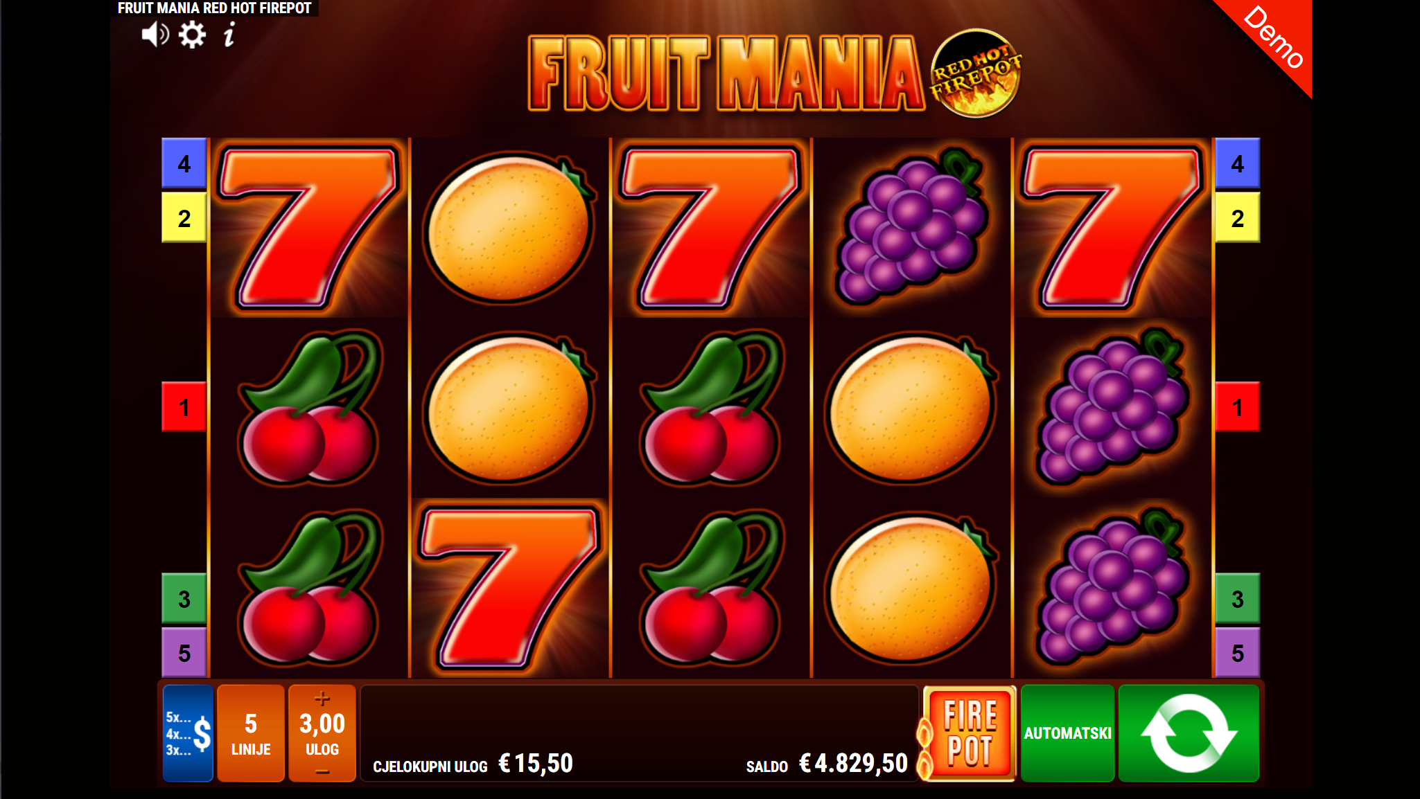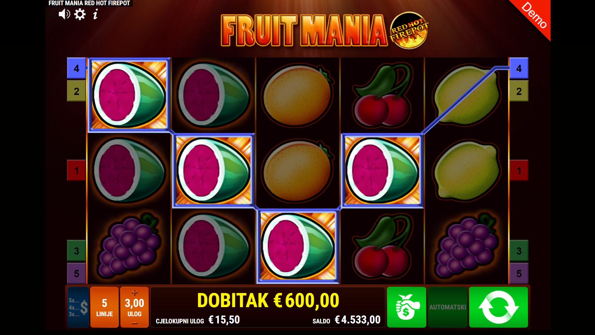 Fruit Mania RHFP vodi svoje igrače kroz zabavnu avanturu obogaćenu pažljivo ilustriranim voćnim simbolima uz dodatak zlatnih efekata. Super jednostavan način igranja omogučiti će igračima dugotrajnu zabavu, a kako bi ona također bila i uzbudljiva pobrinuti će se Fruit Mania RHFP simboli sedmice koji će tvoje dobitke pretvoriti u veće i učestalije. Ako voliš igre koje ti pružaju izvrstan omjer rizika i dobitaka došao si na pravo mjesto! Prepusti se zabavi i užitku te sa sobom odnesi velike dobitke!