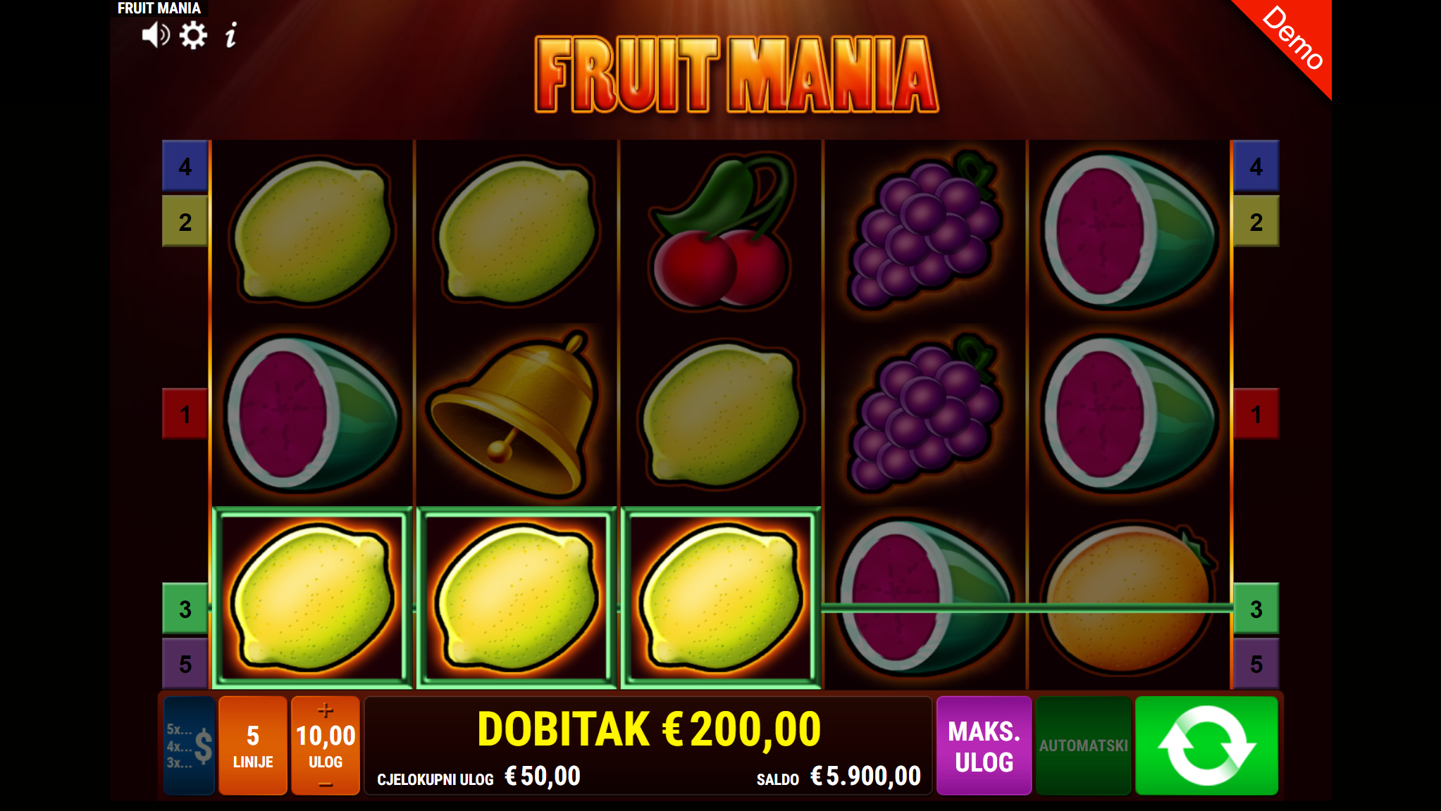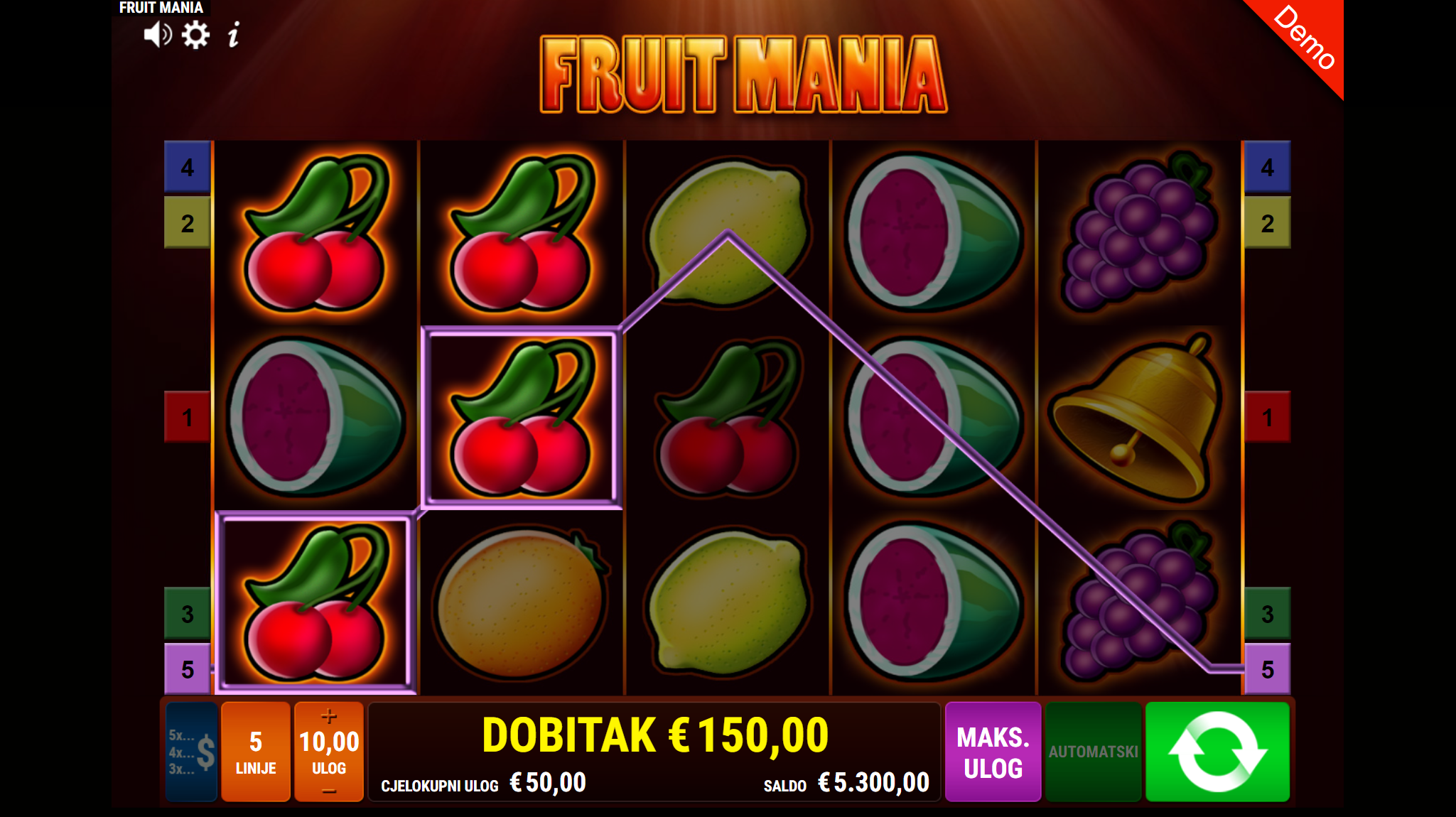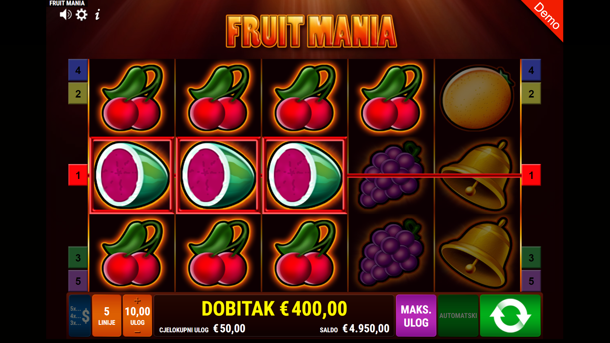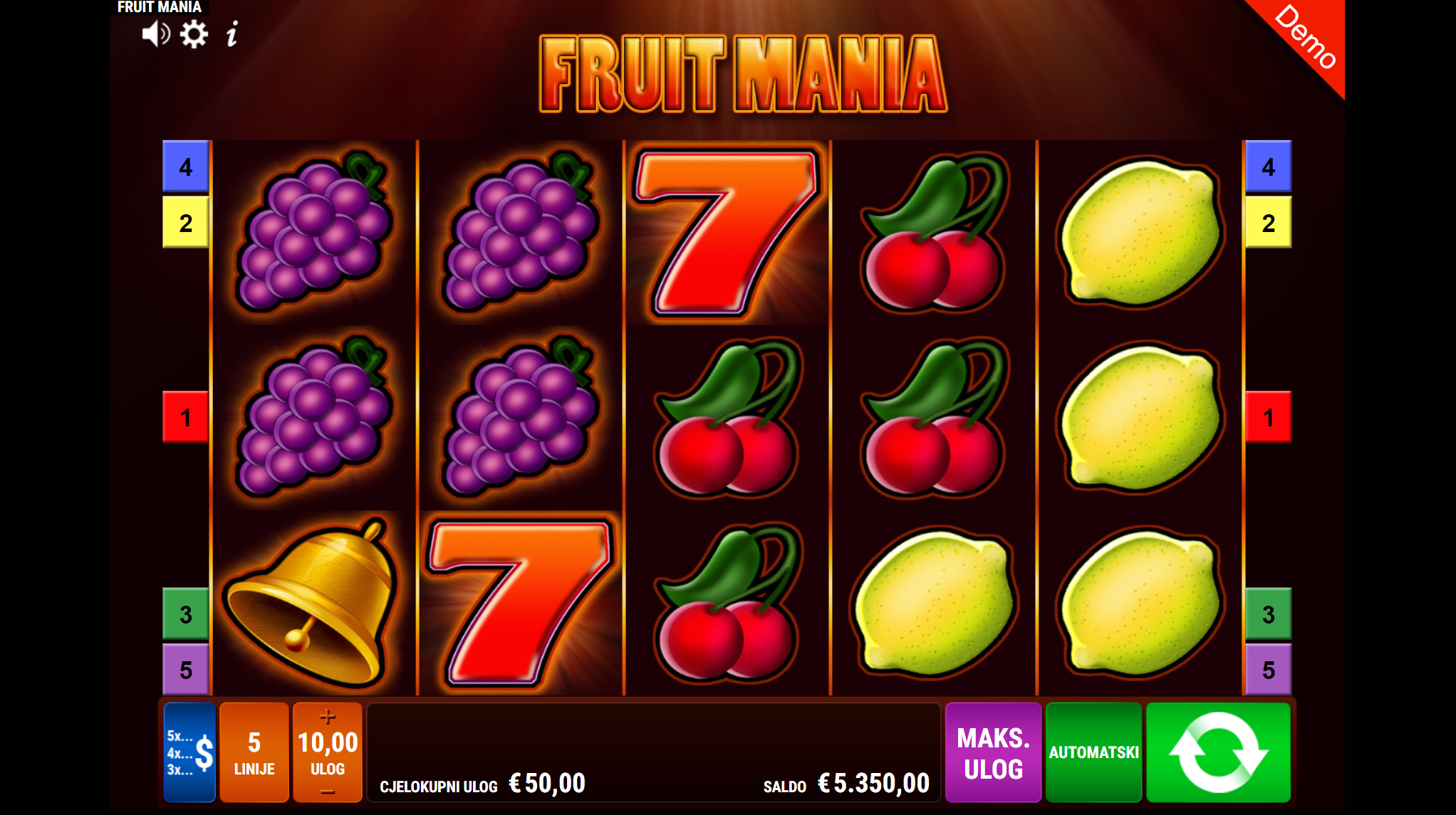 Fruit Mania vodi svoje igrače kroz zabavnu avanturu obogaćenu pažljivo ilustriranim voćnim simbolima uz dodatak zlatnih efekata. Super jednostavan način igranja omogučiti će igračima dugotrajnu zabavu, a kako bi ona također bila i uzbudljiva pobrinuti će se Fruit Mania sedmice koje će tvoje dobitke pretvoriti u veće i učestalije. Ako voliš igre koje ti pružaju izvrstan omjer rizika i dobitaka došao si na pravo mjesto! Prepusti se zabavi i užitku te sa sobom odnesi velike dobitke!
