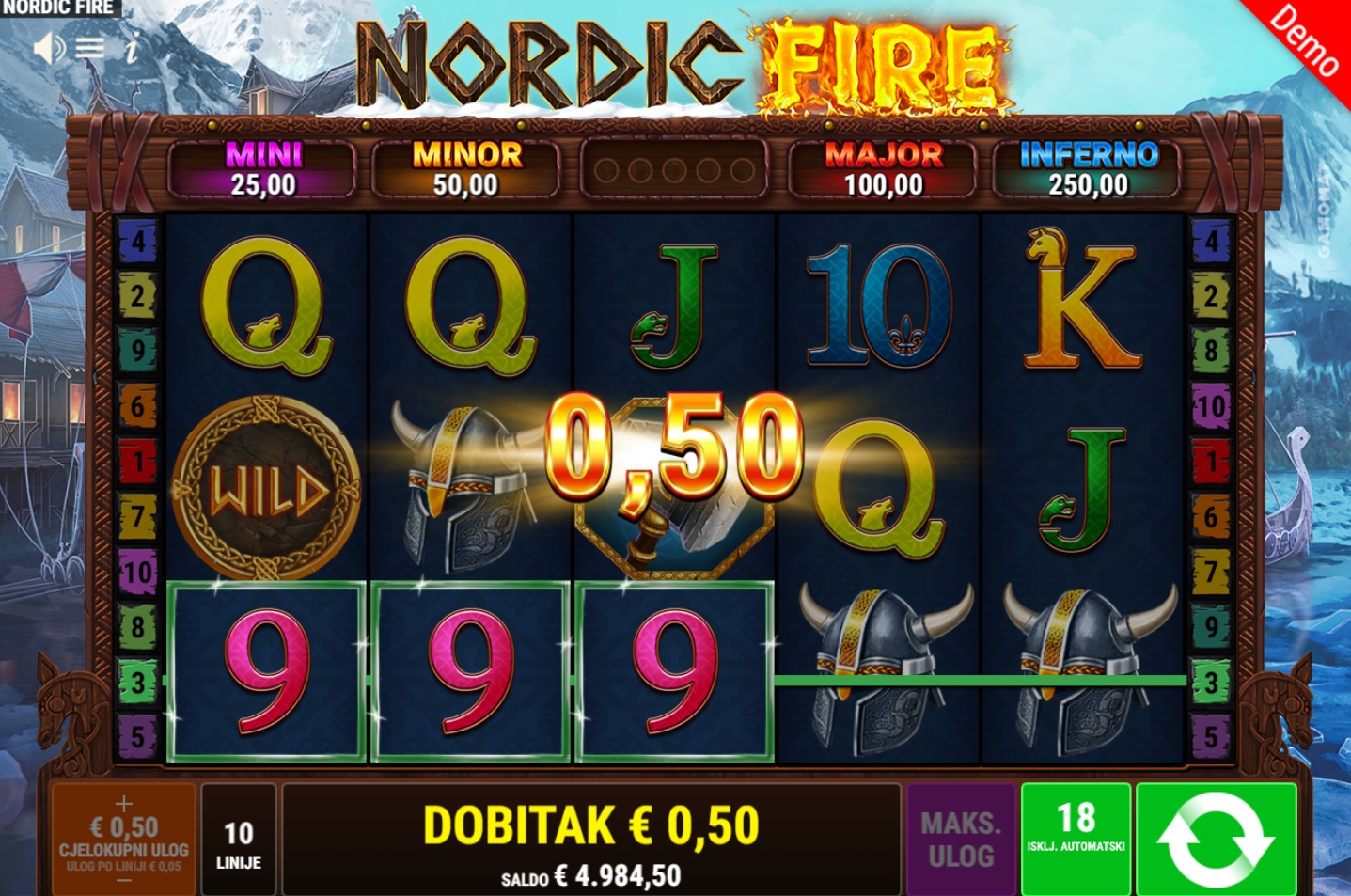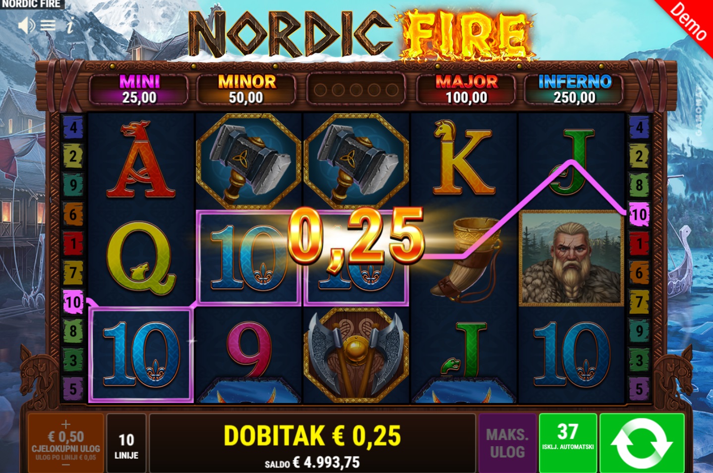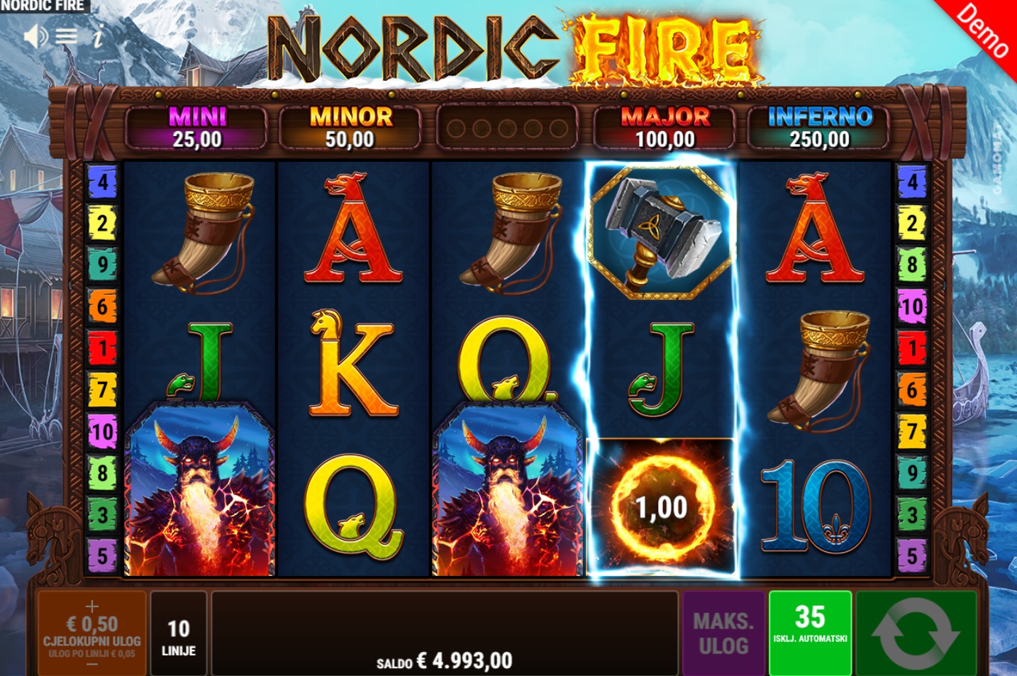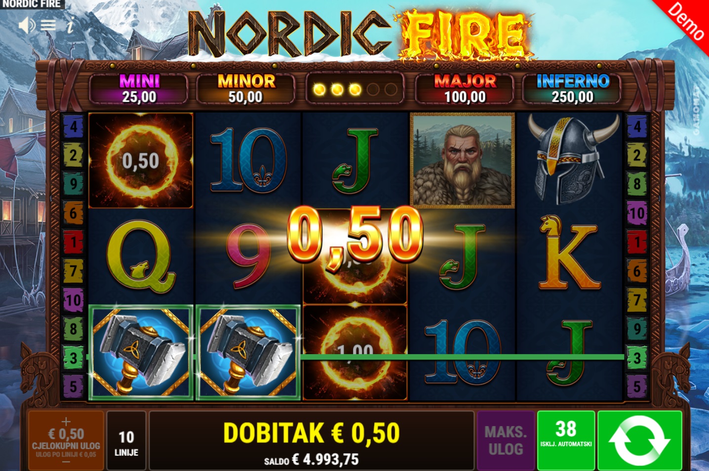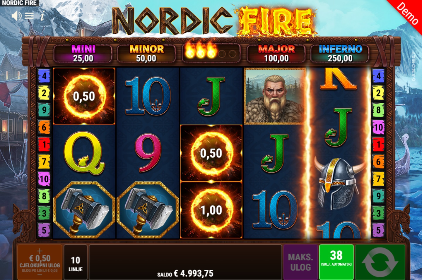 Nordic Fire je uzbudljiva video slot igra s 5 valjaka i 10 dobitnih linija, gdje te očekuju vatrene bonus značajke i besplatne igre. U igri se pojavljuju različiti simboli, uključujući zamjenski simbol Pokreni štit, koji zamjenjuje sve osim Scatter i bonus simbola. Scatter simboli Surtr (veliki) i Surtr (mali) aktiviraju besplatne igre, dok bonus simboli pokreću Fire Respins, pružajući dodatne prilike za dobitak.