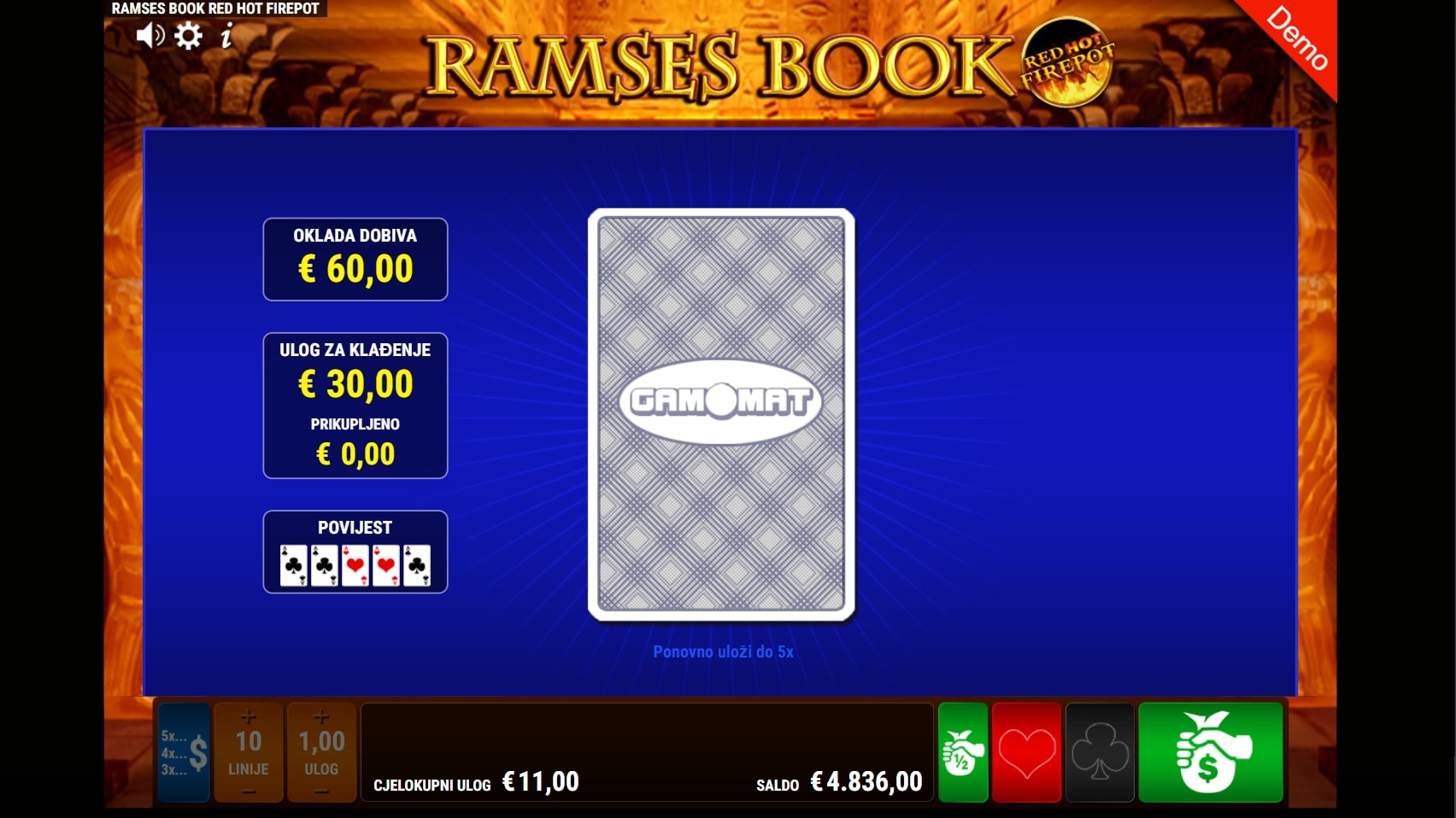 Gameplay slota Ramses Book RHFP dinamičan je i zanimljiv. Odvija se u 5x3 gridu, a sadrži 10 isplatnih linija što isplaćuju s lijeva na desno. Simbol knjige obnaša Wild i Scatter funkcije - ona pojavom na tri ili više koluta pokreće 10 besplatnih vrtnji, a uz to može zamijeniti druge simbole u potrazi za isplatnim linijama. U slučaju dobitka, igrač ga može pokušati 'poduplati' pogađanjem boje karte okrenute licem prema dolje.