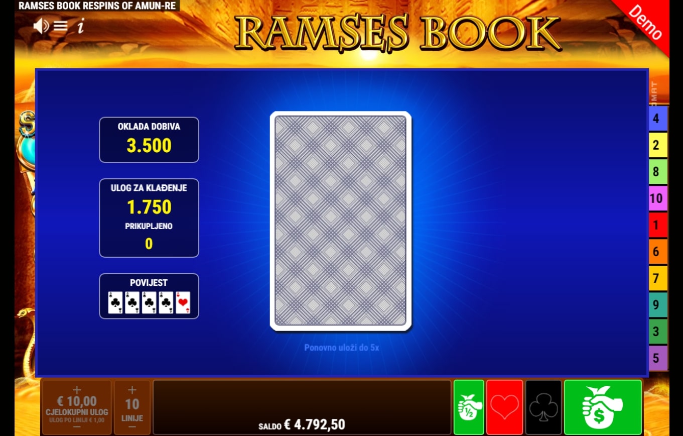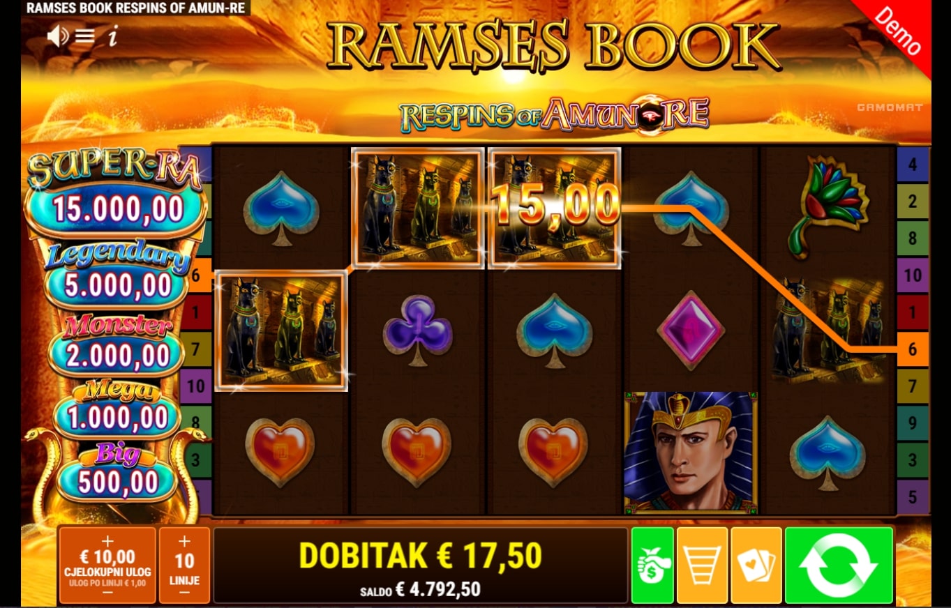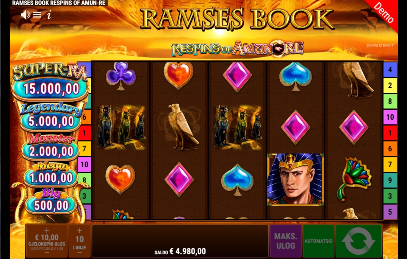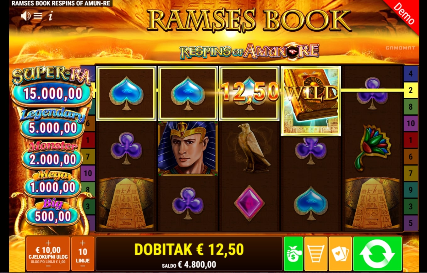 Ramses Book ROAR slot je igra povijesne tematike koja igrača vodi u nezaboravnu avanturu egipatskim piramidama i hramovima. Igra je dio Ramses Book svemira igara, a tradicionalno najviše isplaćuju simboli faraona Ramzesa i relikata povezanih uz egipatsku mitologiju. Simbol knjige djeluje kao alfa i omega, a ono što igru čini posebnom je značajka Respin of Amun-Re. U slučaju dobitka, igrač ga može pokušati 'poduplati' pogađanjem boje karte okrenute licem prema dolje. Zaigraj Ramses Book ROAR te osvoji vrhunske nagrade!