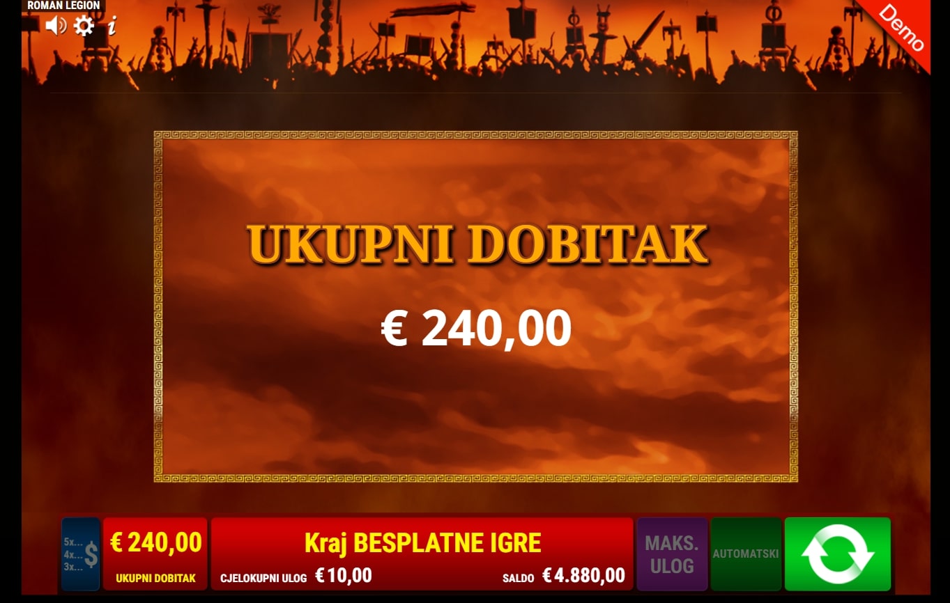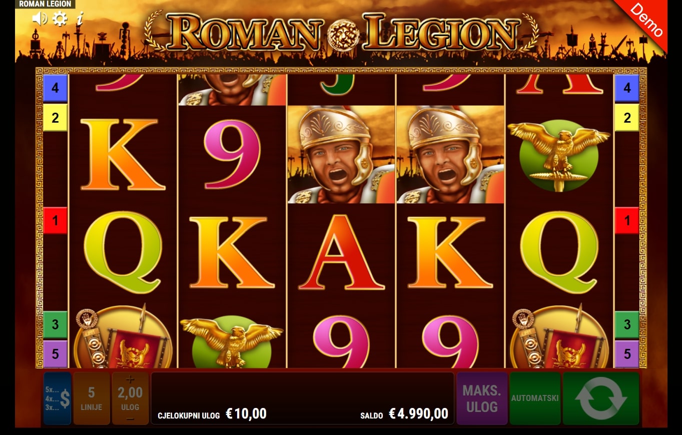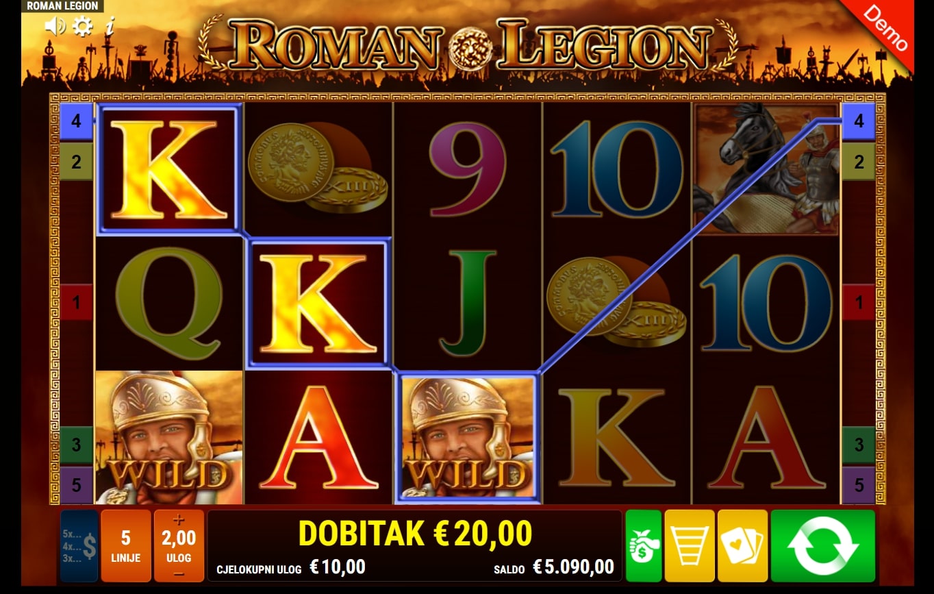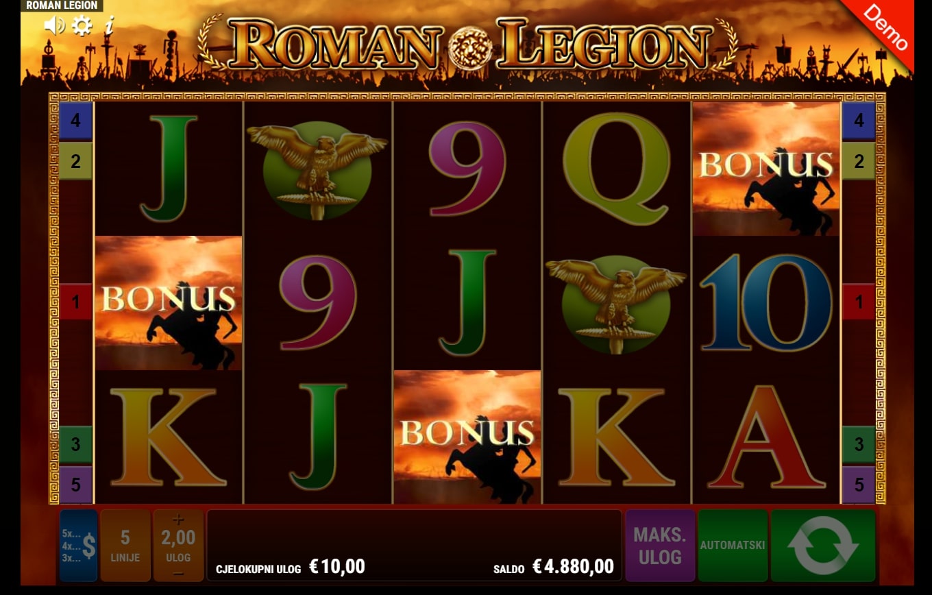 Roman Legion slot je igra povijesnog karaktera koja vodi igrača u Rimsko Carstvo u avanturu života gdje vladaju vrhunski dobici. Najviše isplaćuju simboli sinonimni uz rimsku čast i hrabrost, a igra uz to sadrži simbole vojnika i jahača koji mijenjaju druge simbole, odnosno vode igrača u svijet besplatnih vrtnji. U slučaju dobitka, igrač ga može udvostručiti pogađanjem boje karte okrenute licem prema dolje. Zaigraj Roman Legion te osvoji legendarne nagrade!