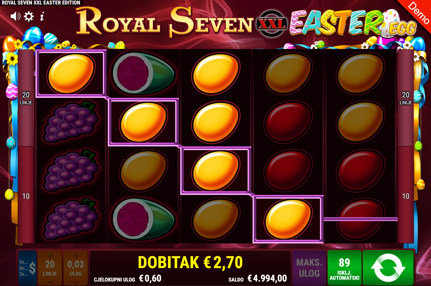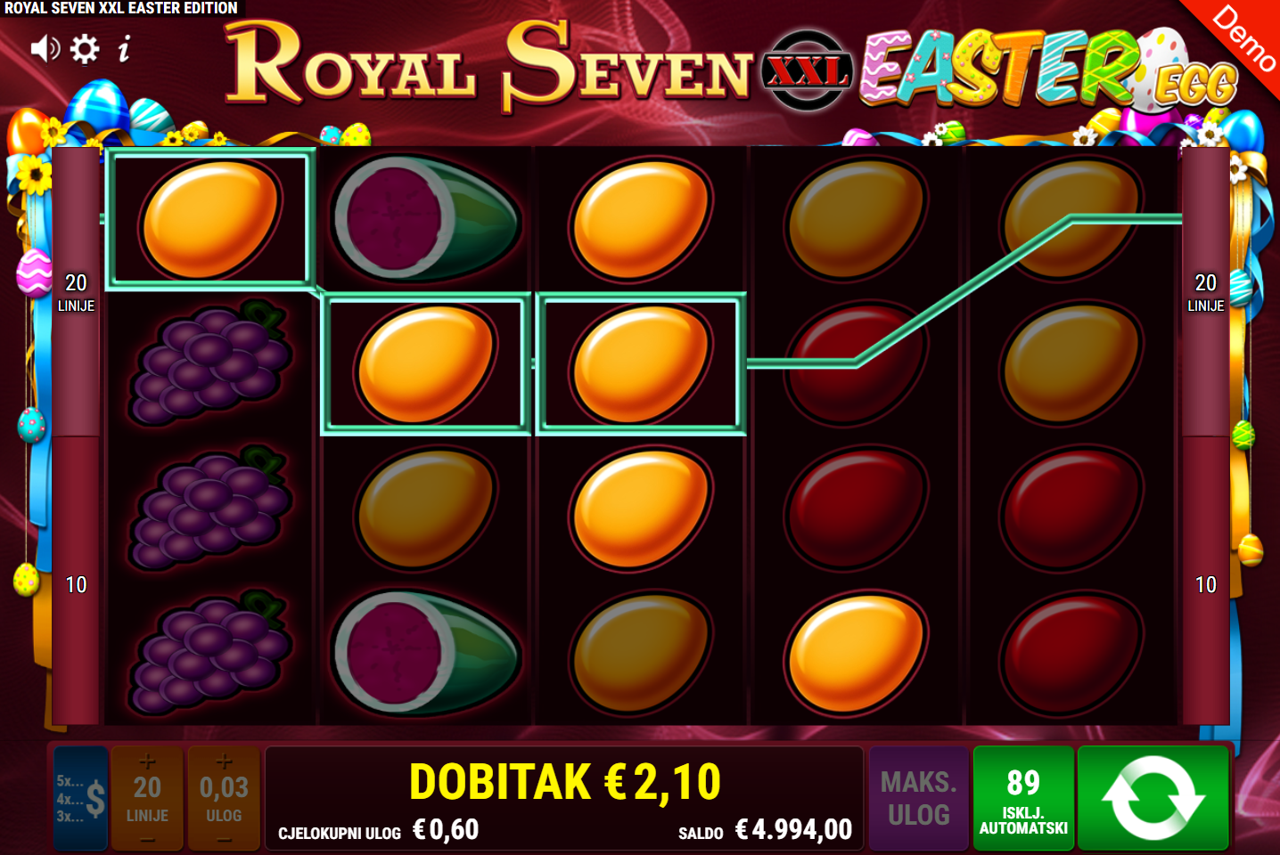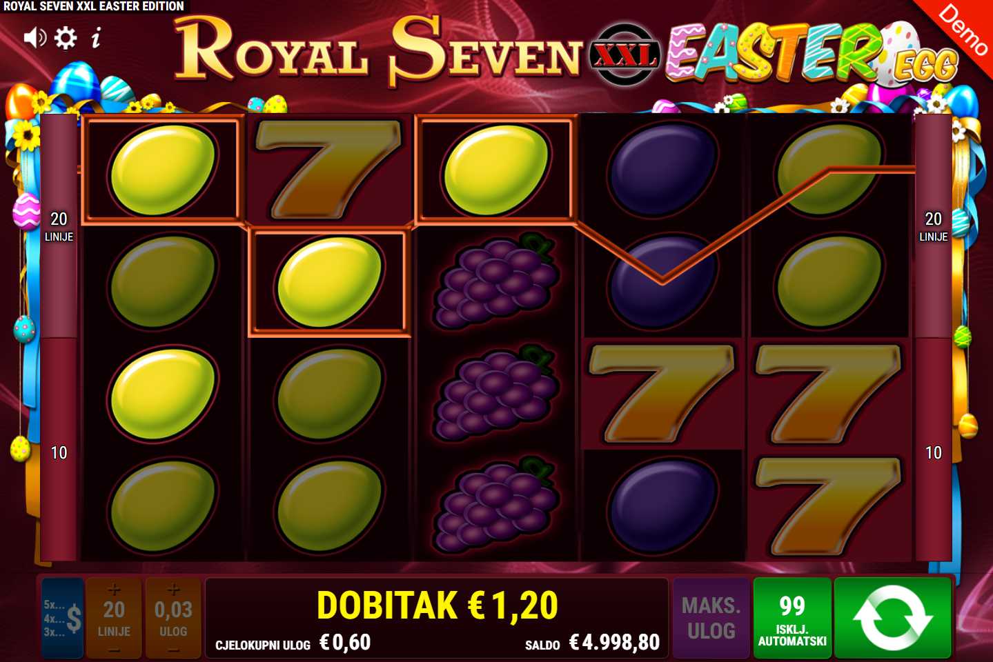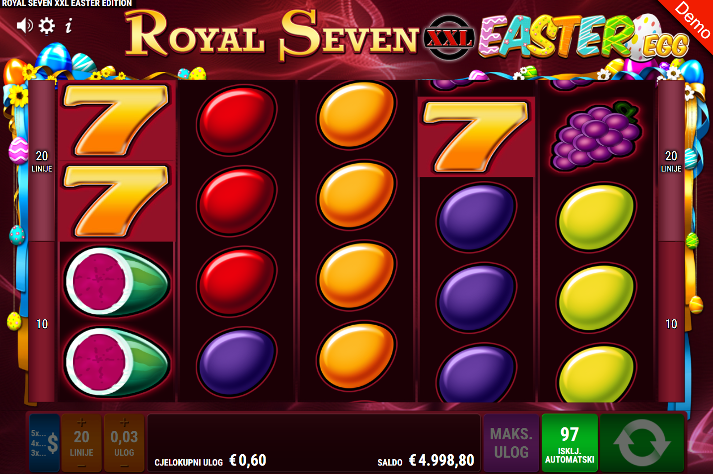 Voliš klasiku, ali i da se nešto događa? Royal Seven XXL EE savršen je spoj tradicionalne voćne tematike i svježeg, dinamičnog gameplaya. Na pet valjaka možeš birati između 10 ili 20 isplatnih linija, ovisno o tome koliko želiš akcije. Grafika je čista, animacije glatke, a simbol sedmice donosi najviše dobitke. Idealno za sve koji vole klasičan izgled s modernim twistom!