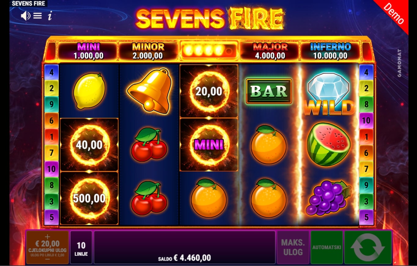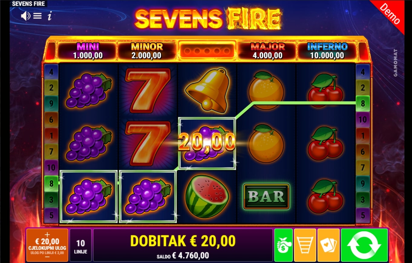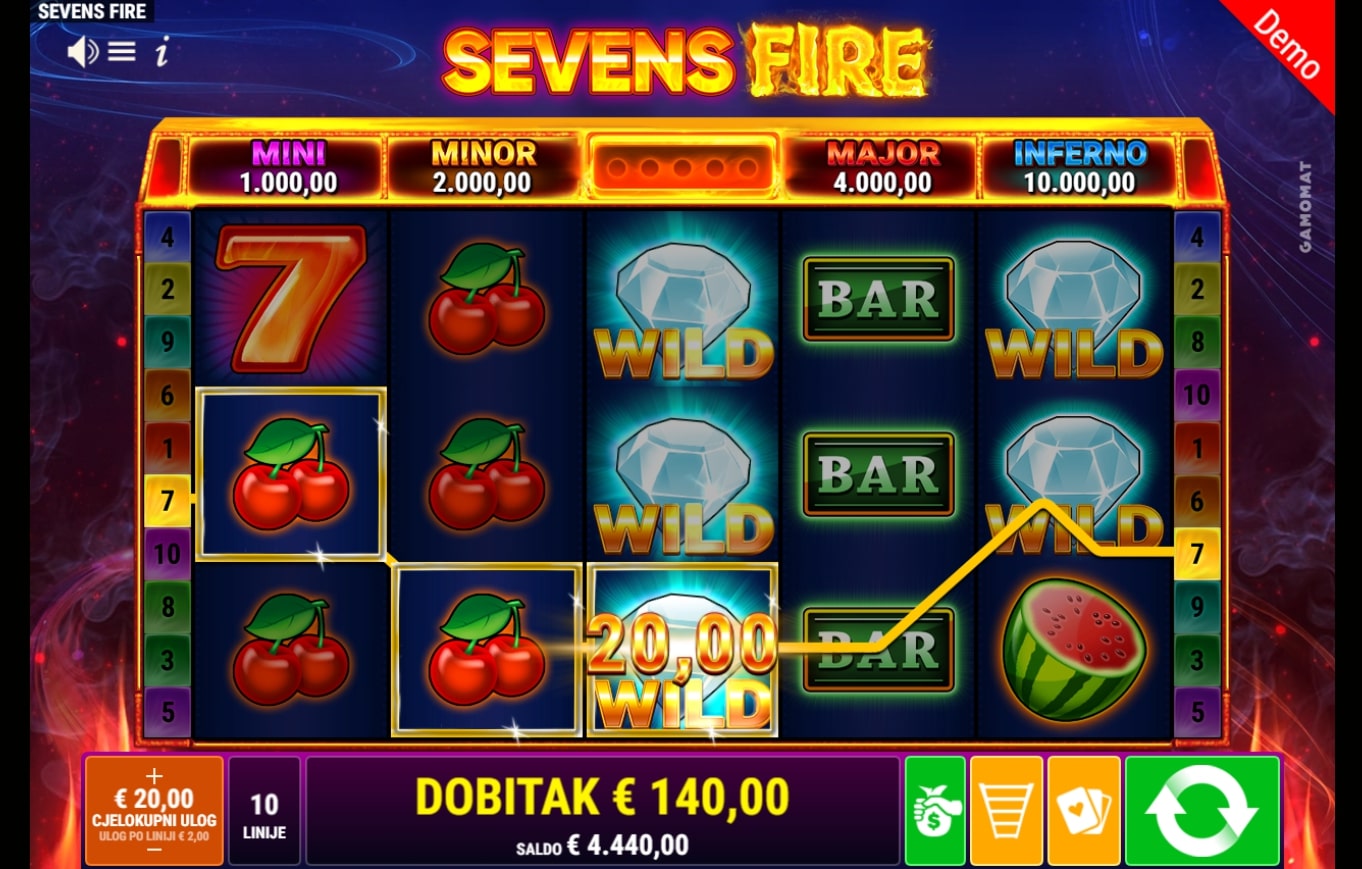 Sevens Fire klasična je slot igra koja vodi igrača u svijet voća i vatrenih dobitaka. Igra je inspirirana retro igrama na sreću, a najviše isplaćuju sedmice, poluge i zvona. Simbol dijamanta služi kao zamjenski simbol u potrazi za dobitnim linijama, dok simboli vatrene kugle mogu aktivirati Fire Respin funkciju koja šalje dobitke u novu dimenziju. Zaigraj Sevens Fire te osvoji sočne nagrade!