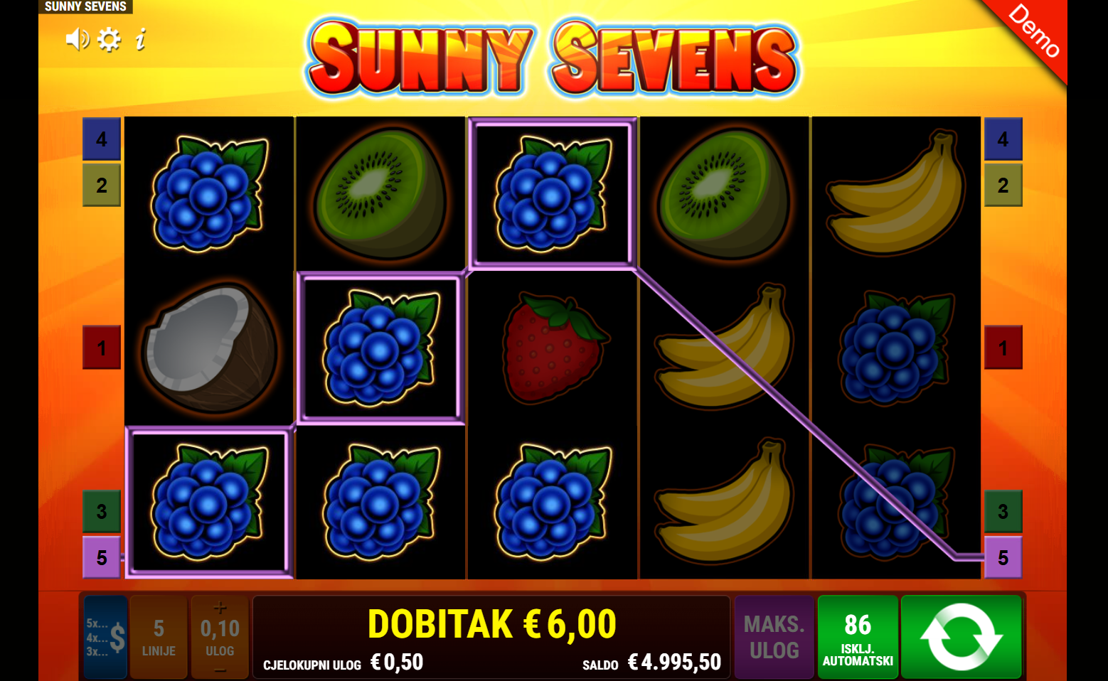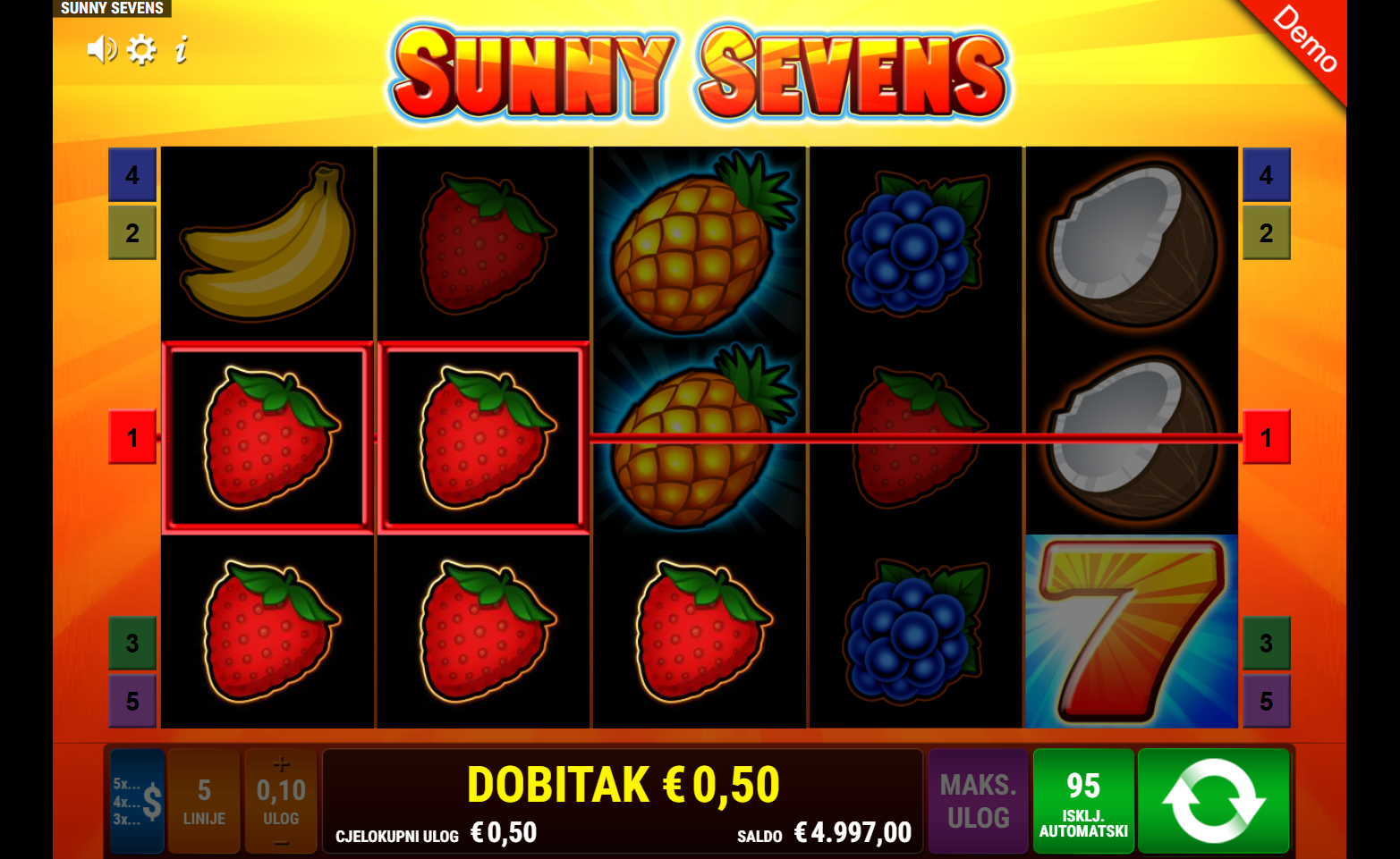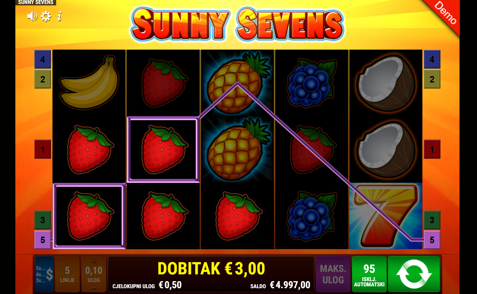 Sunny Sevens ima RTP od 96.12%, što znači da nudi prilično poštene izglede za povrat uloga tijekom vremena. Volatilnost je srednja, pa se možeš nadati razmjerno čestim isplatama. Igra je idealna za one koji vole ravnotežu između dinamike i stabilnosti!
