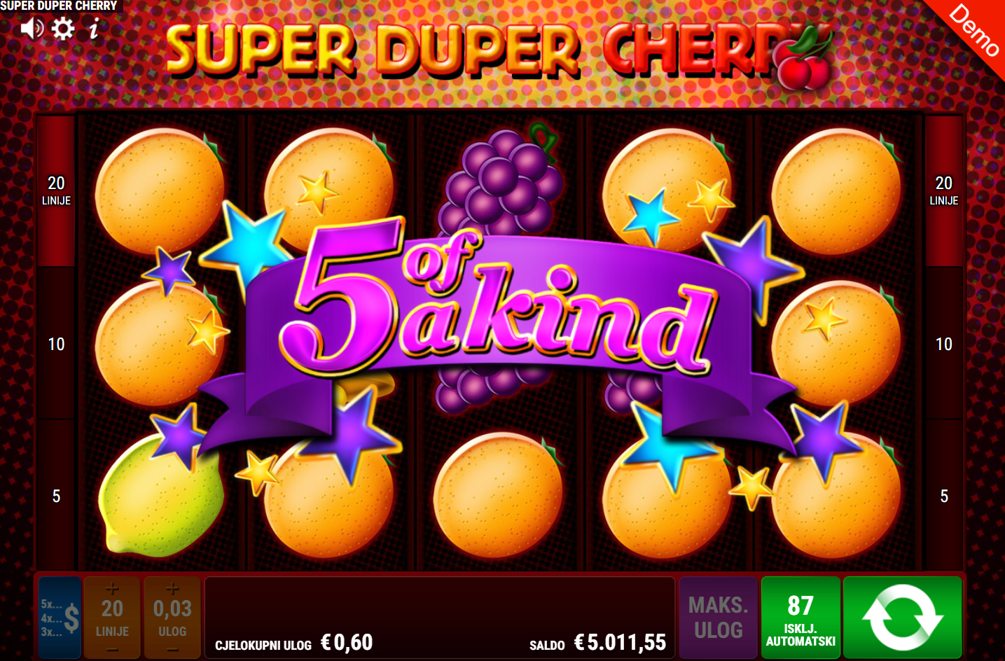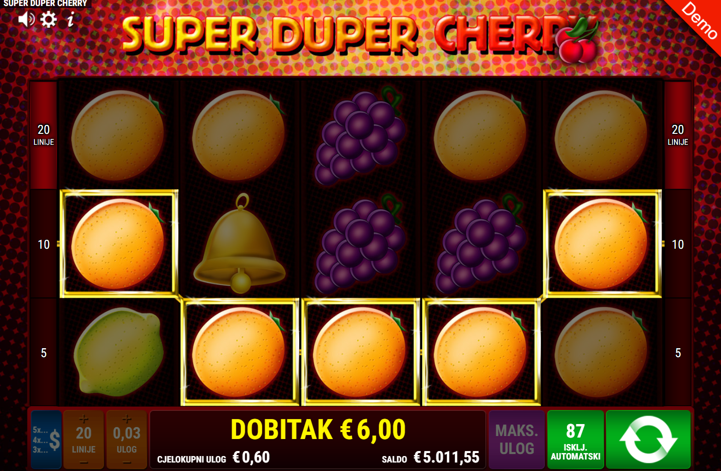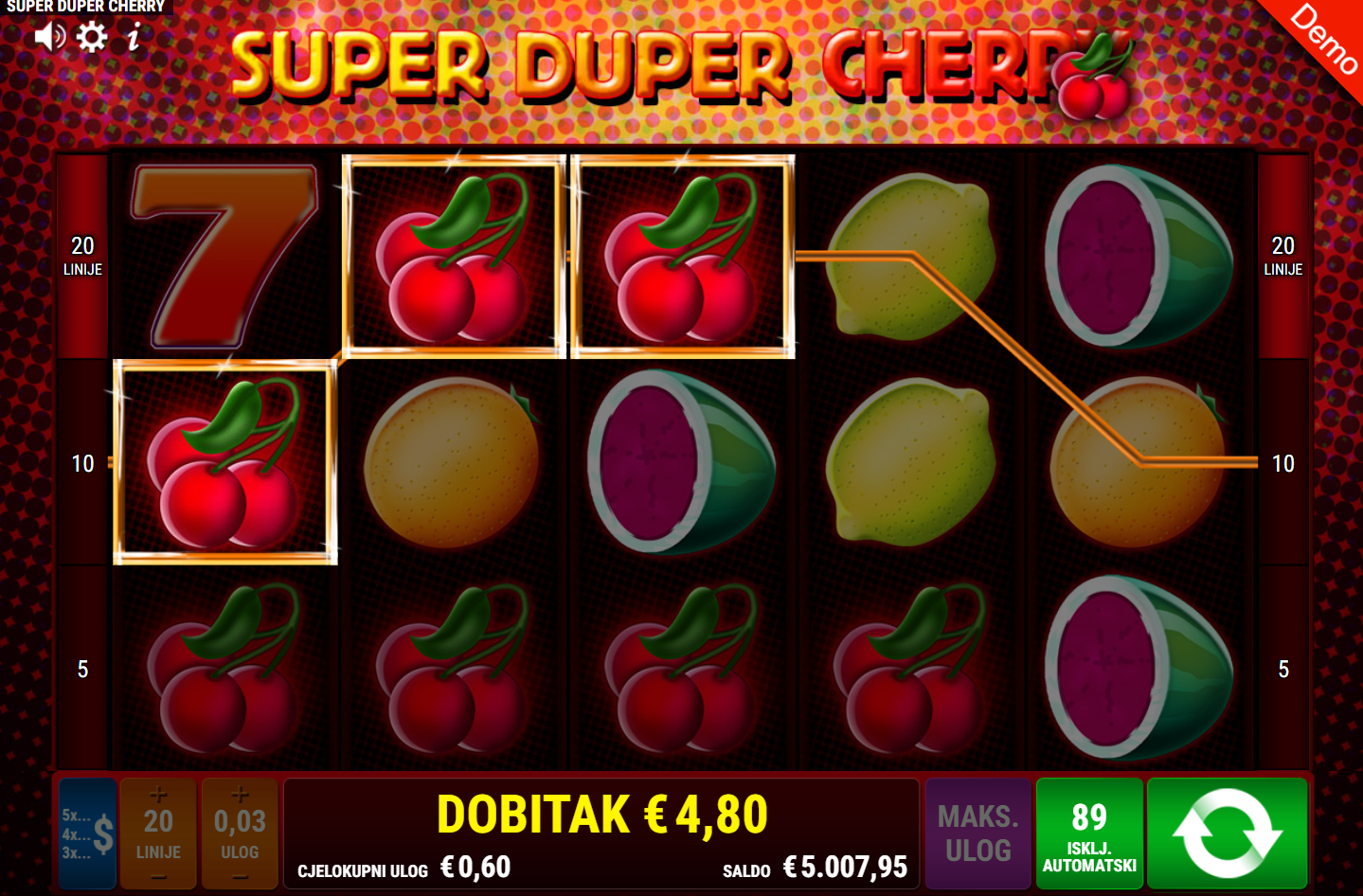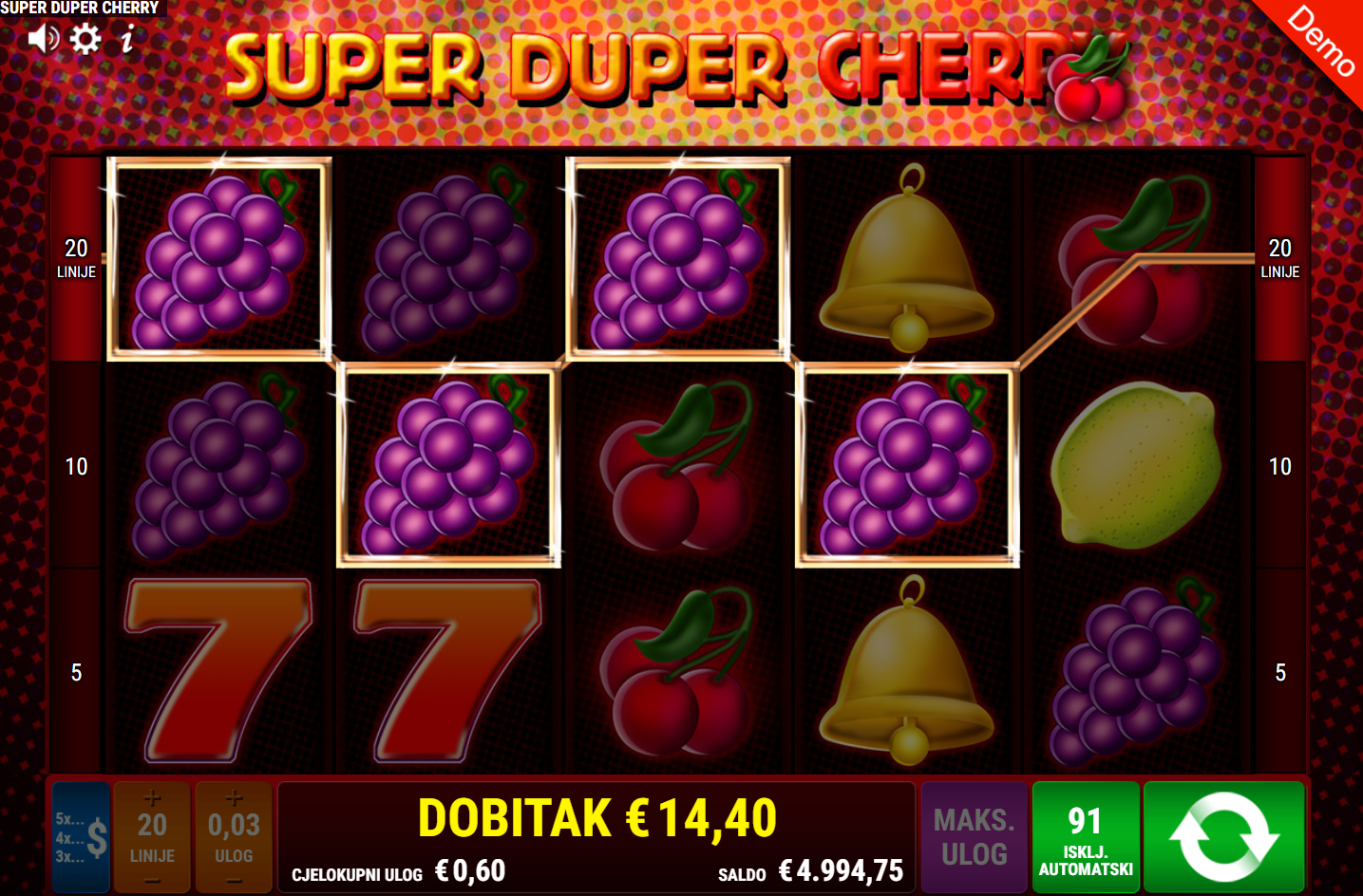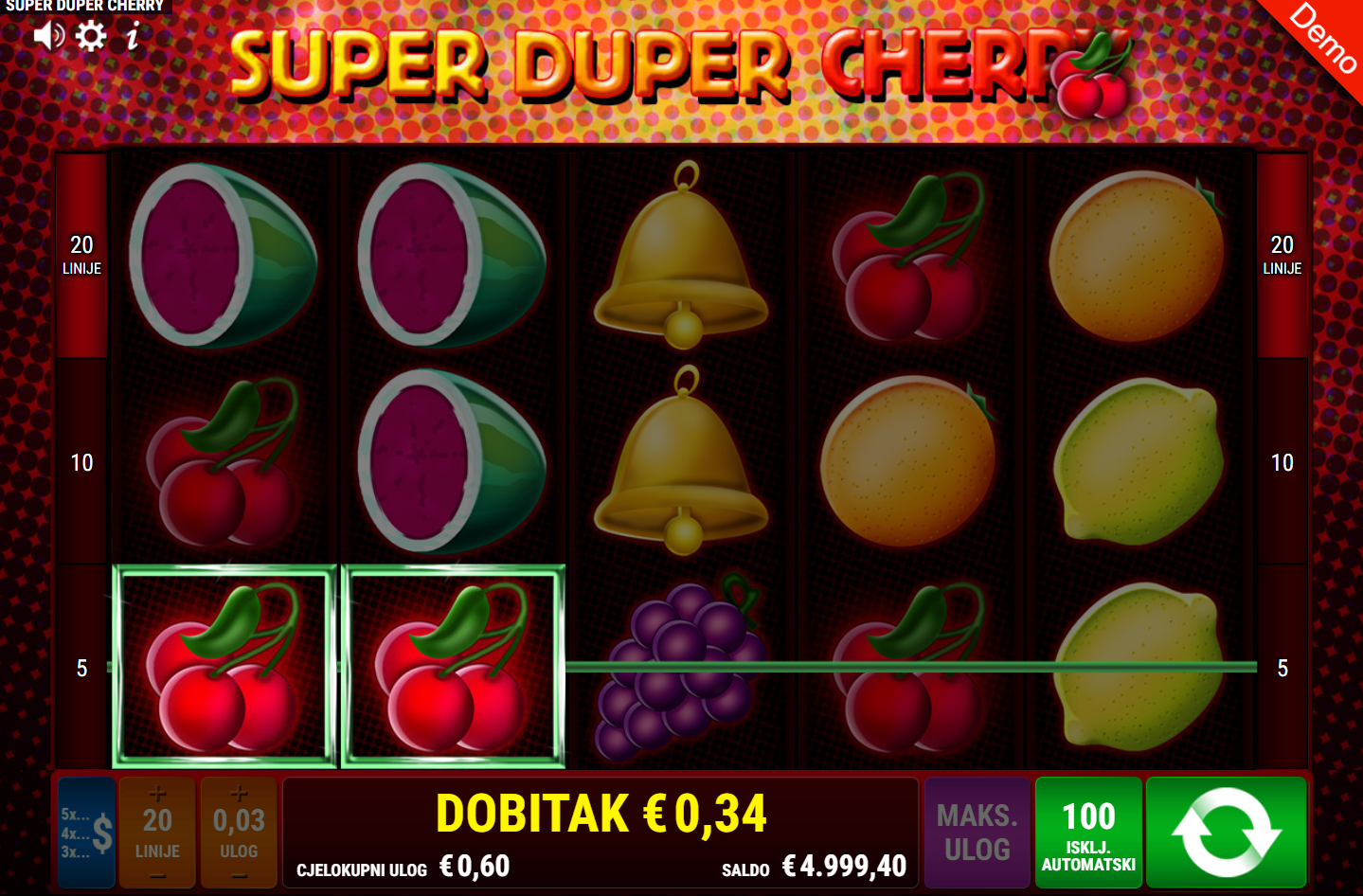 Super Duper Cherry je uzbudljiva slot igra s pet valjaka i mogućnošću biranja između 5, 10 ili 20 isplatnih linija. Igra je posebna po svojoj značajci transformacije trešanja, koja se aktivira kada spojiš kombinaciju od pet trešanja. Sve trešnje na valjcima tada se pretvaraju u visoko vrijedne simbole, dajući ti priliku za veće dobitke. S klasičnim izgledom i modernim mehanikama, ova igra nudi sjajno iskustvo igranja uz mogućnost ulaganja na karte.