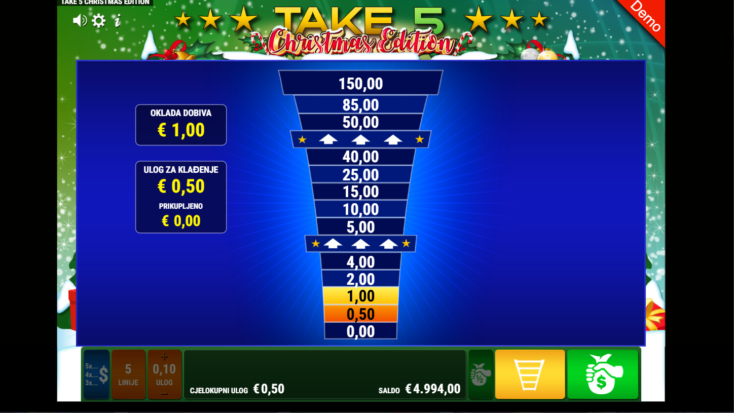 4. Koji su minimalni i maksimalni ulozi u igri Take 5 Christmas Edition?