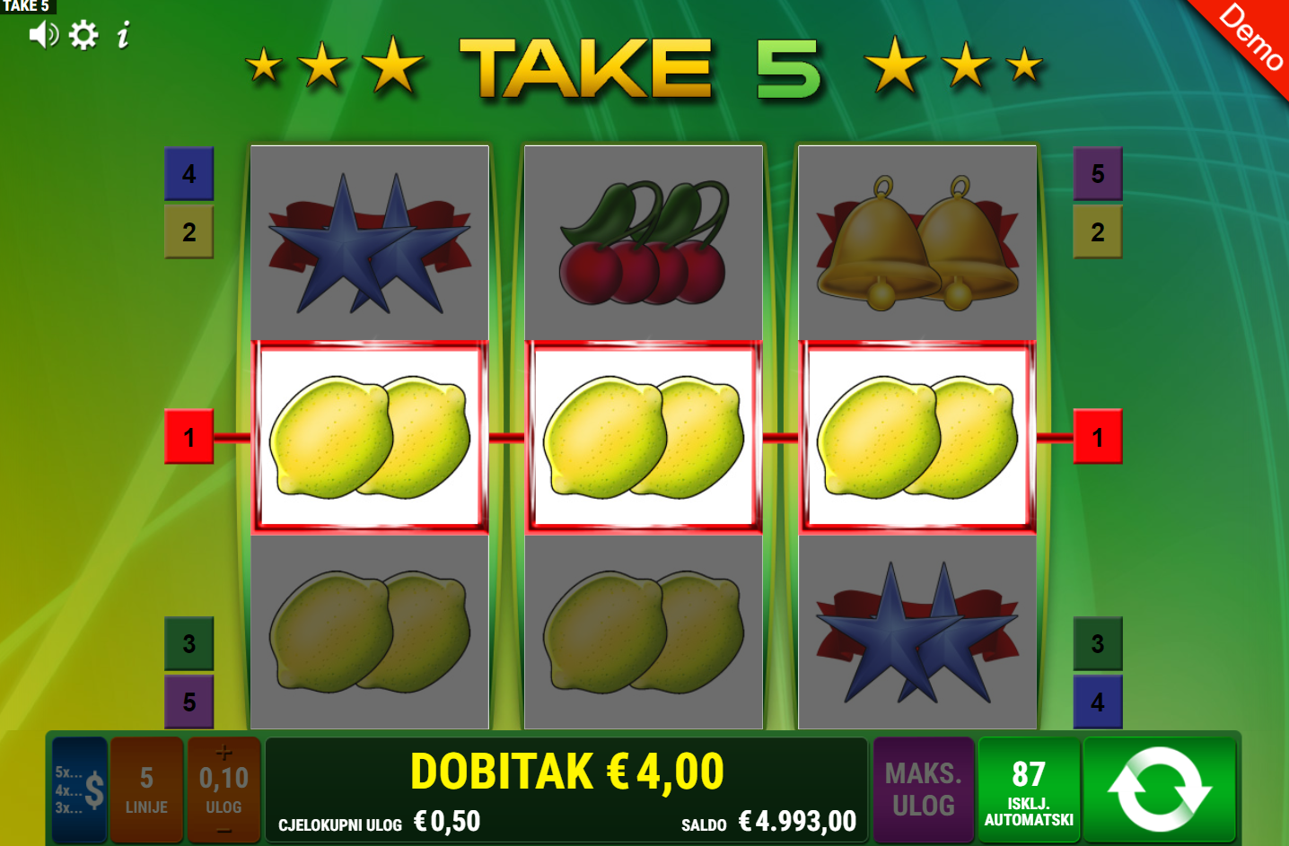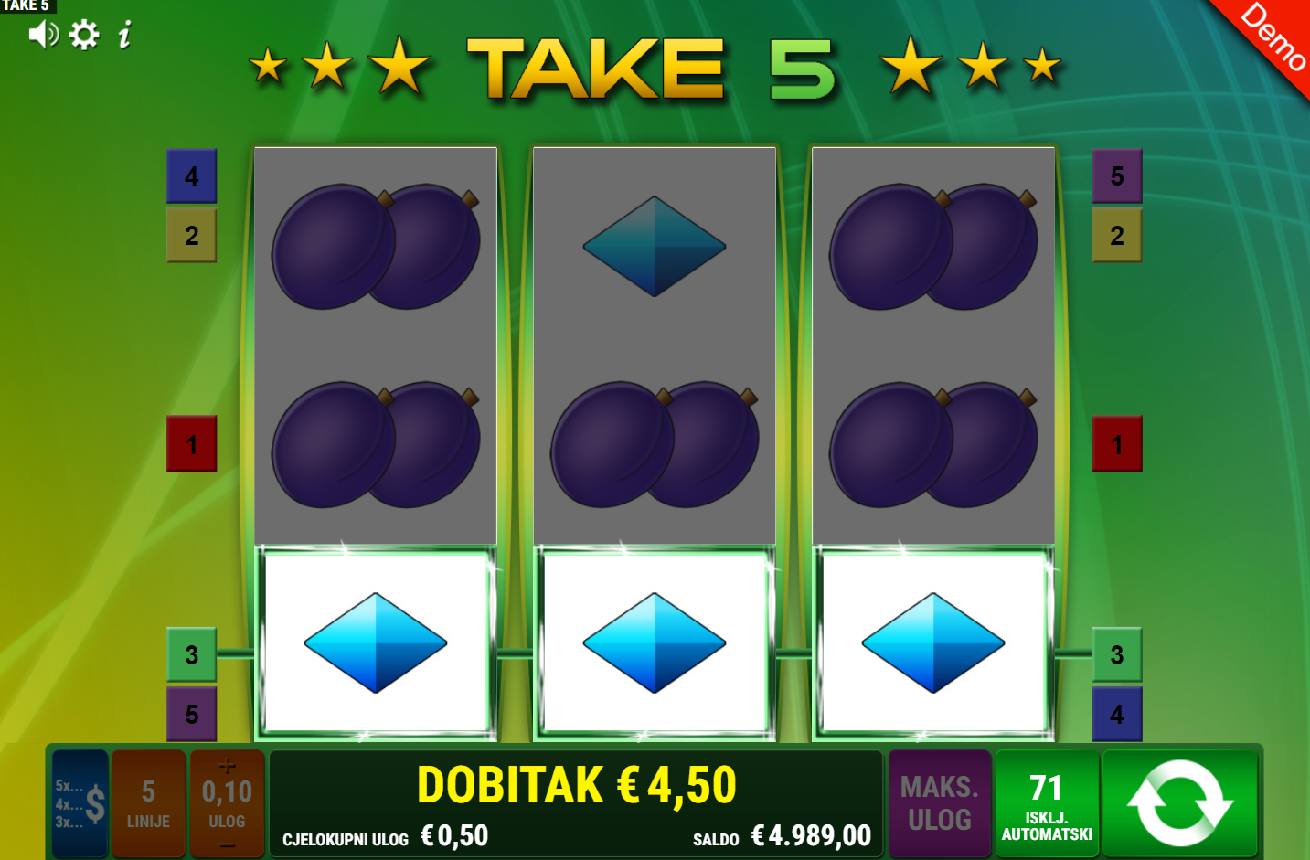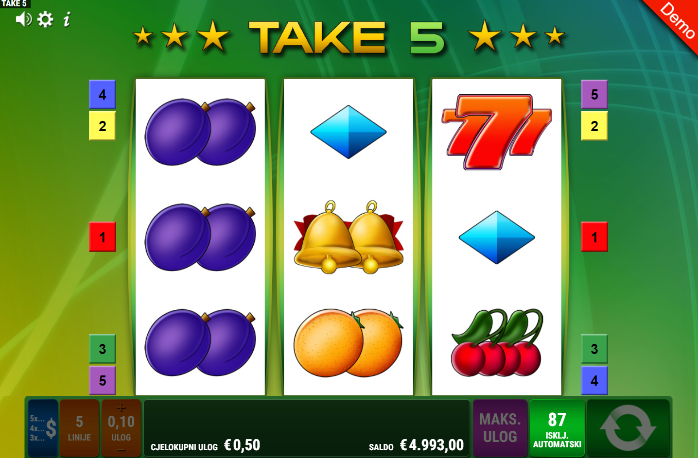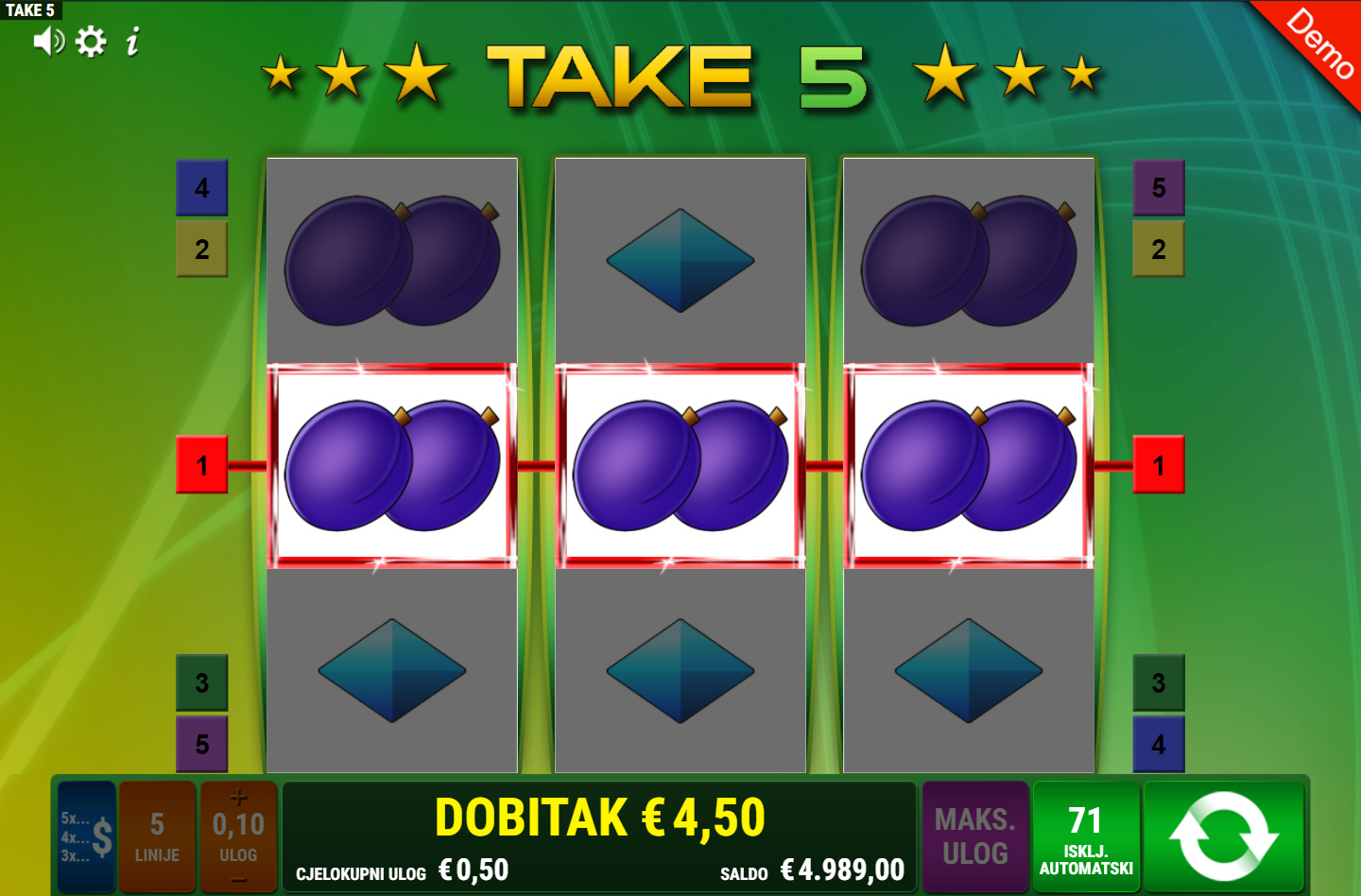 Take 5 je klasična slot igra s 3 valjka i 5 dobitnih linija koja donosi jednostavnost i uzbuđenje starih slotova. Cilj igre je ostvariti dobitne kombinacije simbola na susjednim valjcima, a svaki dobitak može aktivirati posebnu značajku Win Repeater. Ova značajka omogućuje da se trenutačni dobitak ponovno izbroji do četiri puta putem kola sreće, povećavajući tvoje nagrade. S intuitivnim pravilima i klasičnim izgledom, Take 5 je savršen izbor za ljubitelje retro slotova.