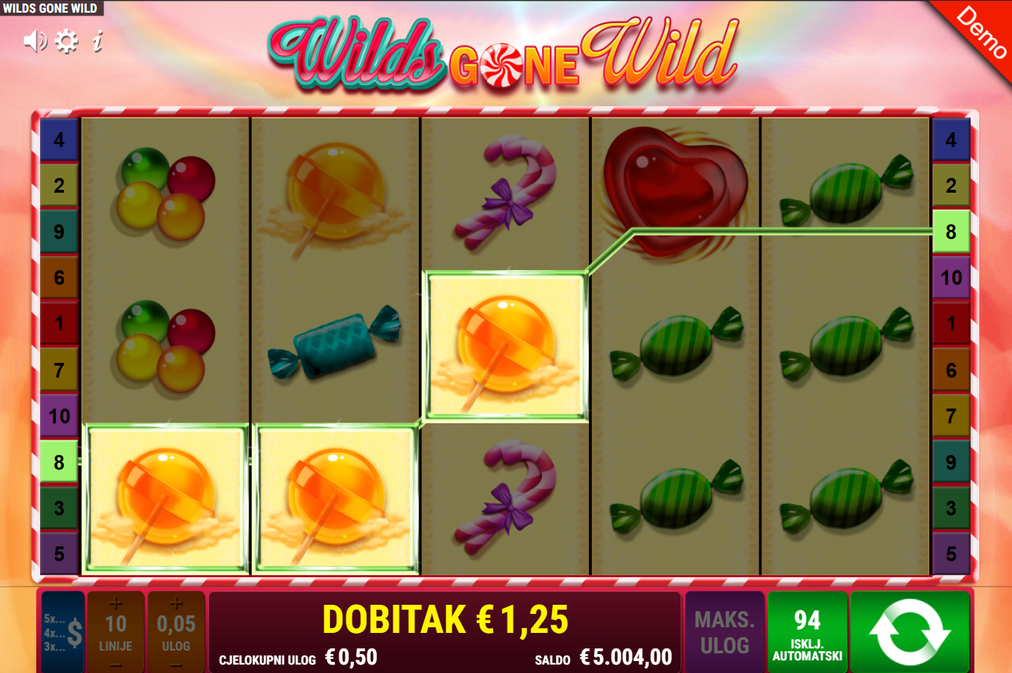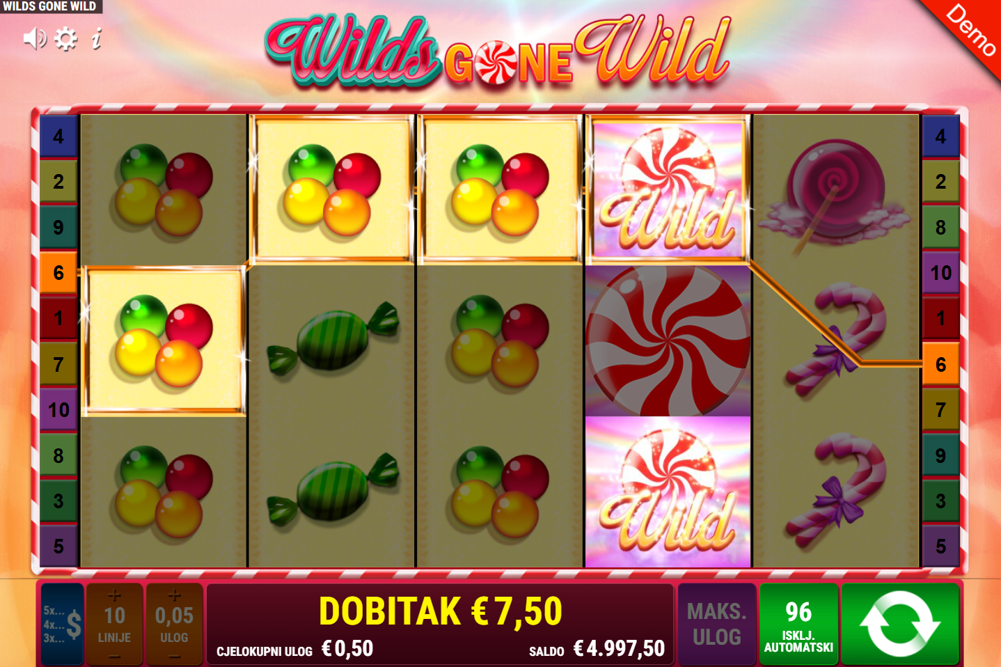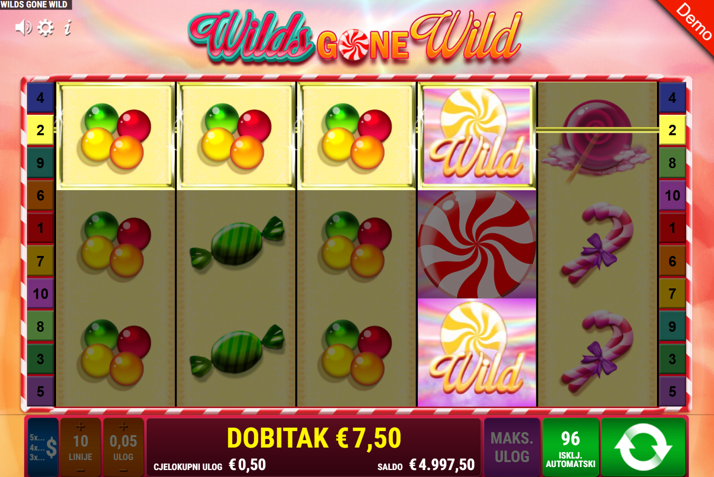 Ako voliš jednostavne, a opet živopisne slot igre koje znaju iznenaditi usred vrtnje – Wilds Gone Wild je idealna za tebe! Na pet valjaka i uz mogućnost izbora između 5 ili 10 isplatnih linija, ova igra nudi dinamičan i klasičan gameplay u modernom ruhu. Fokus je na Wild simbolima – koji ne samo da zamjenjuju ostale simbole, već se mogu i proširiti preko cijelog valjka, povećavajući tako šanse za dobre kombinacije. Igra vizualno podsjeća na voćne klasike, ali uz dodatne značajke koje je čine zanimljivom svakim okretajem.
