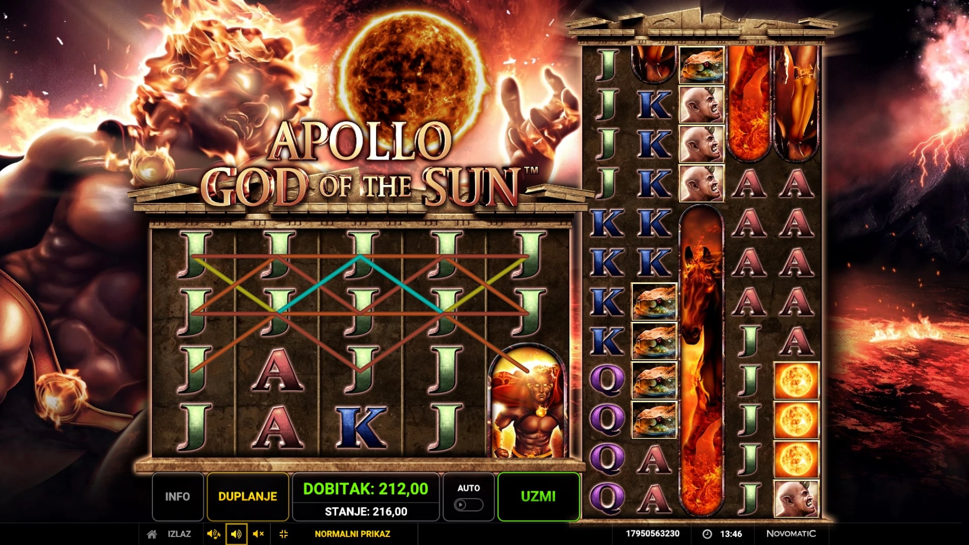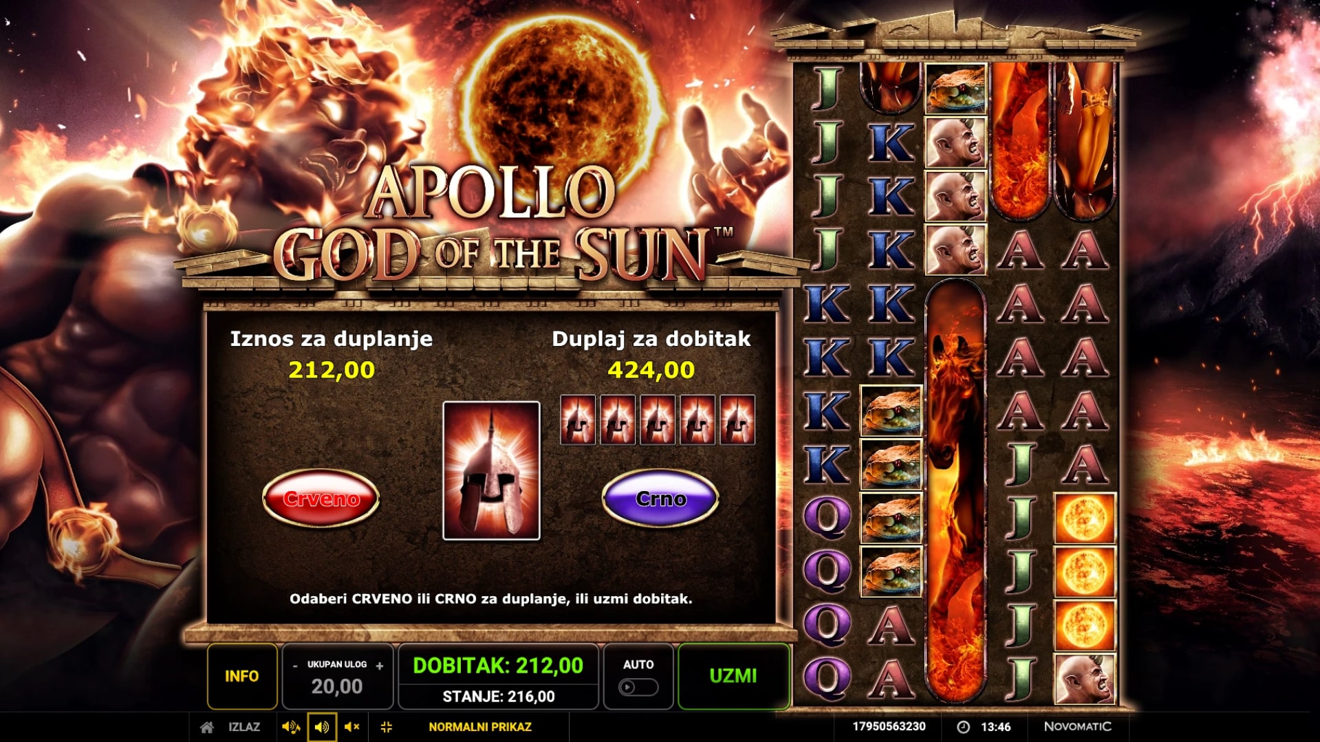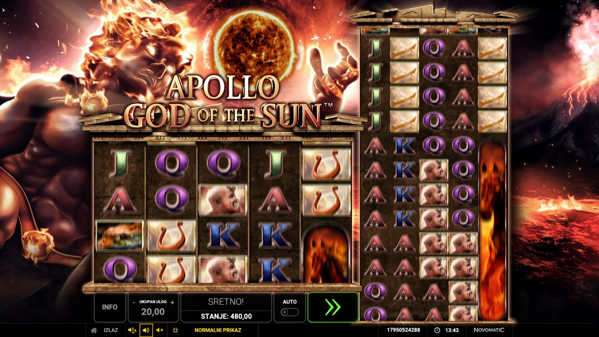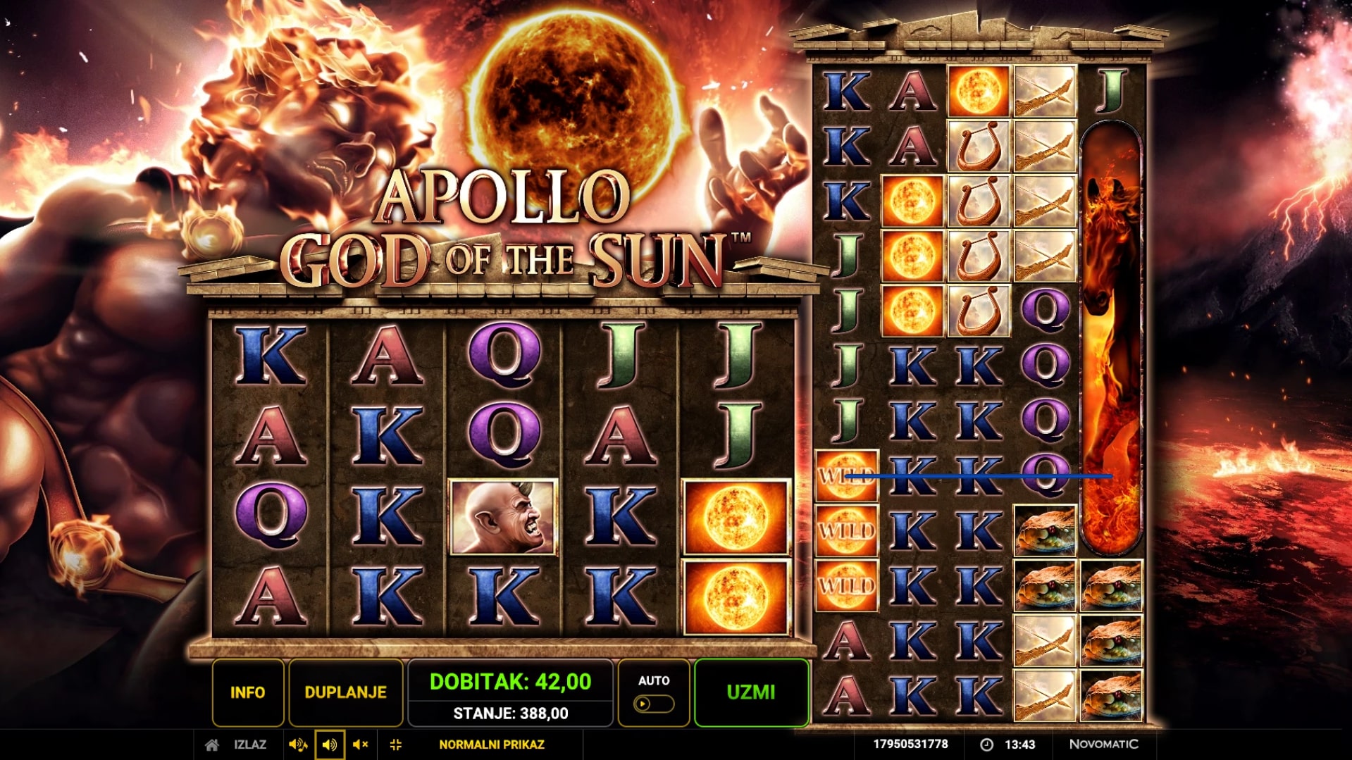 Apollo God of the Sun slot je igra koja vodi igrača u svijet vulkana i užarenih dobitaka koje omogućuje grčki bog sunca. Najviše isplaćuju okomiti simboli konja i ratnika, dok simbol užarene kugle mijenja druge simbole u potrazi za dobicima. Kako bi se san o besplatnim vrtnjama pretvorio u stvarnost, porebno je nanizati simbole ratnika s grčkom kacigom. U slučaju dobitka, igrač ga može pokušati udvostručiti pogađanjem boje karte okrenute licem prema dolje. Zaigraj Apollo God of the Sun te osvoji epske nagrade!