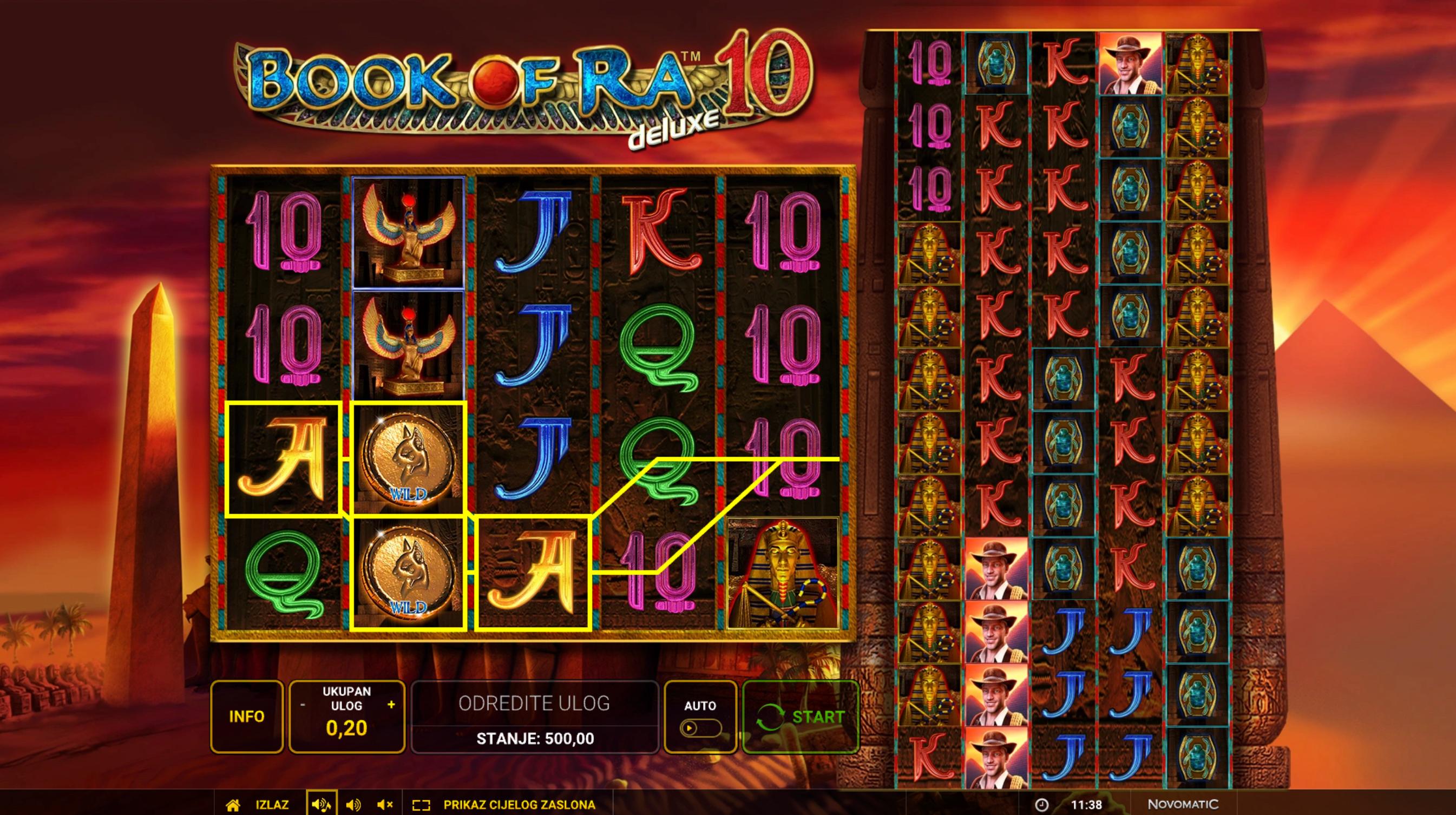 Odaberite ulog između 0,20 € i 40,00 €, pritisnite Spin i zavrtite kolute. Pritom tražite kombinacije simbola istraživača, artefakata i „Book of Ra“ simbola. Tri ili više scatter simbola „Book“ pokreću rundu besplatnih vrtnji, u kojoj jedan simbol postaje proširujući i može pokriti cijeli kolut za veće isplate.