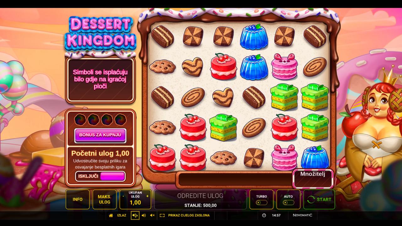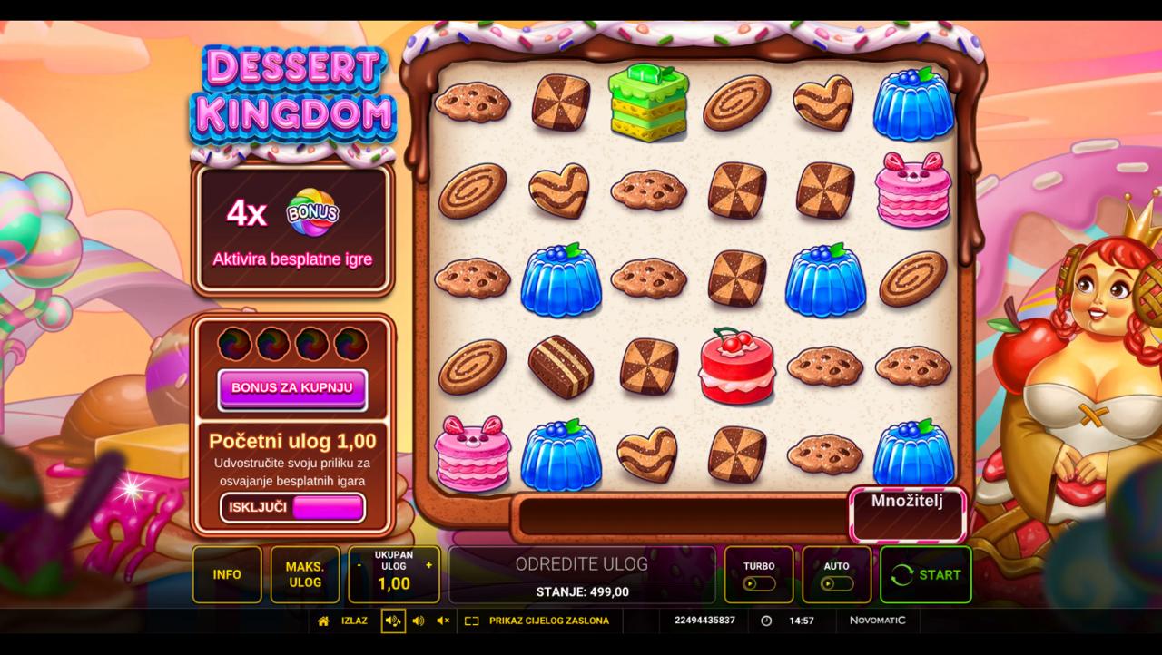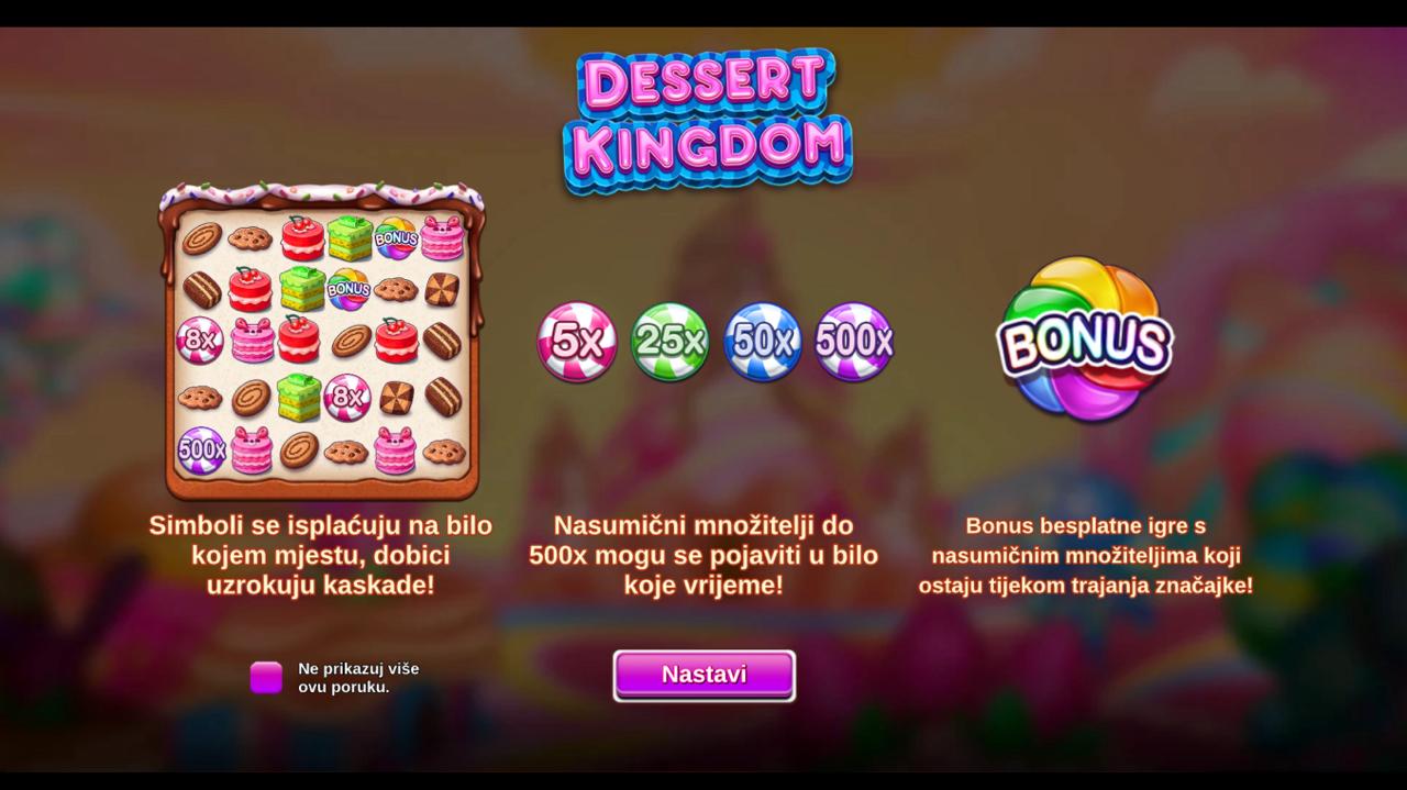Zakorači u svijet slastica uz Dessert Kingdom Ante Bet Buy Bonus, slot igru providera Greentube koja donosi zabavno i vizualno privlačno iskustvo igranja. Igra je puna simbola kolača, torti i drugih slatkiša koji stvaraju šareni i primamljiv ugođaj. Bonus funkcije i posebni simboli omogućuju dodatne dobitke i multiplikatore, čineći svaki spin uzbudljivim i slatkim. Iako igra nema jackpot, nudi brojne prilike za osvajanje nagrada kroz mehanike Ante Bet i bonus runde.