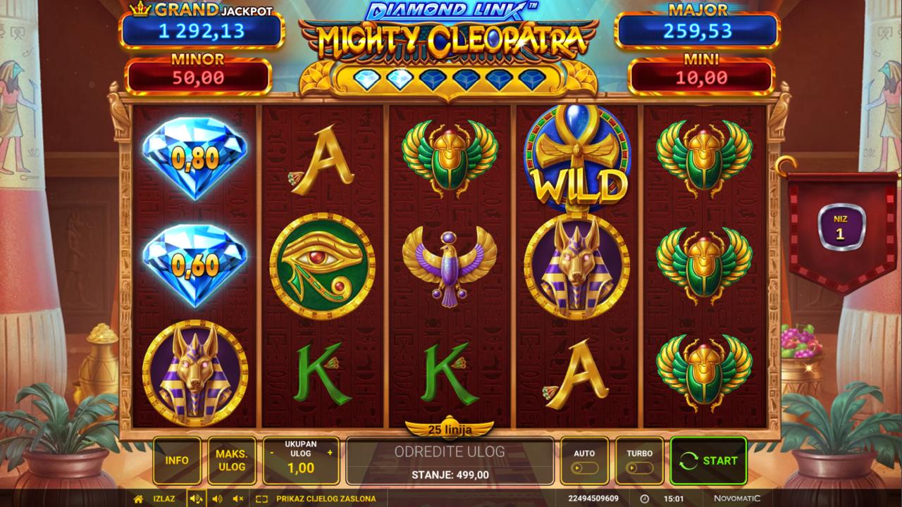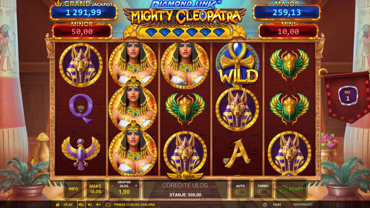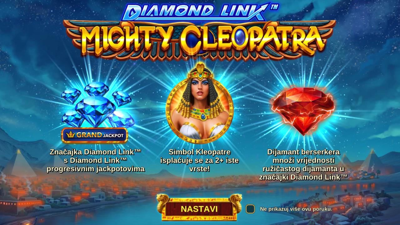 Zakorači u svijet egipatske kraljice i skrivenih blaga uz Diamond Link Mighty Cleopatra, slot igru providera Greentube koja nudi vizualno impresivno iskustvo s simbolima drevnog Egipta. Igra kombinira klasične mehanike slota s modernim bonus funkcijama i progresivnim jackpotom, čineći svaki spin napetim i uzbudljivim. Posebni simboli i bonus značajke omogućuju dodatne nagrade i multiplikatore, dok jackpot daje šansu za impresivne dobitke.