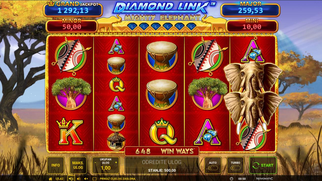 Zakorači u afričku savanu uz Diamond Link Mighty Elephant Win Ways, slot igru providera Greentube koja donosi egzotičnu atmosferu, moćne simbole i uzbudljive mogućnosti osvajanja jackpota. Inspirirana prirodom i divljim životinjama, igra te vodi među slonove, plemenske simbole i dragocjene dijamante koji kriju velike nagrade. Ono što ovu igru čini posebnom je Win Ways sustav s tisućama načina za pobjedu te poznata Diamond Link bonus značajka koja otključava jackpotove i dodatne nagrade.