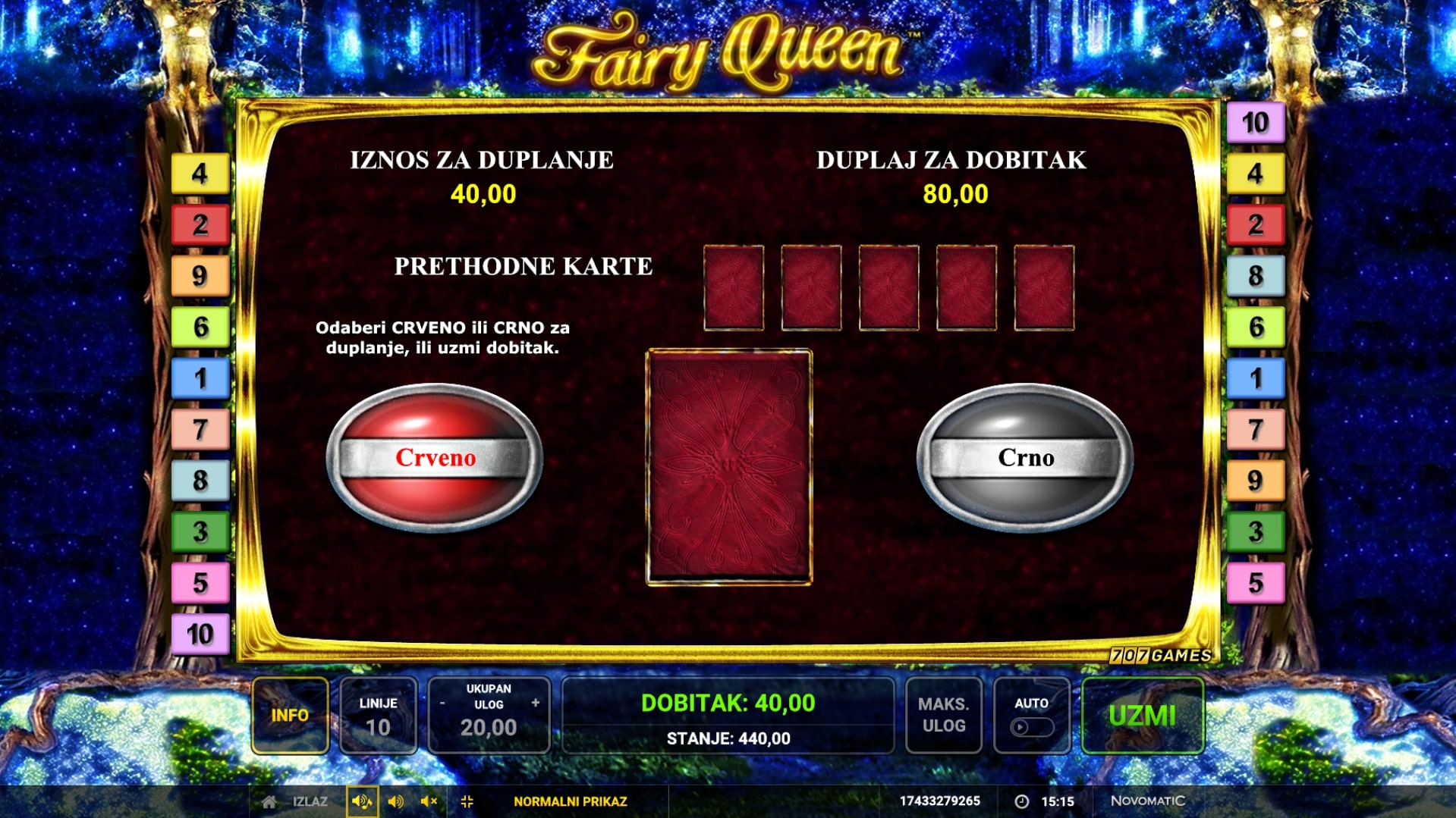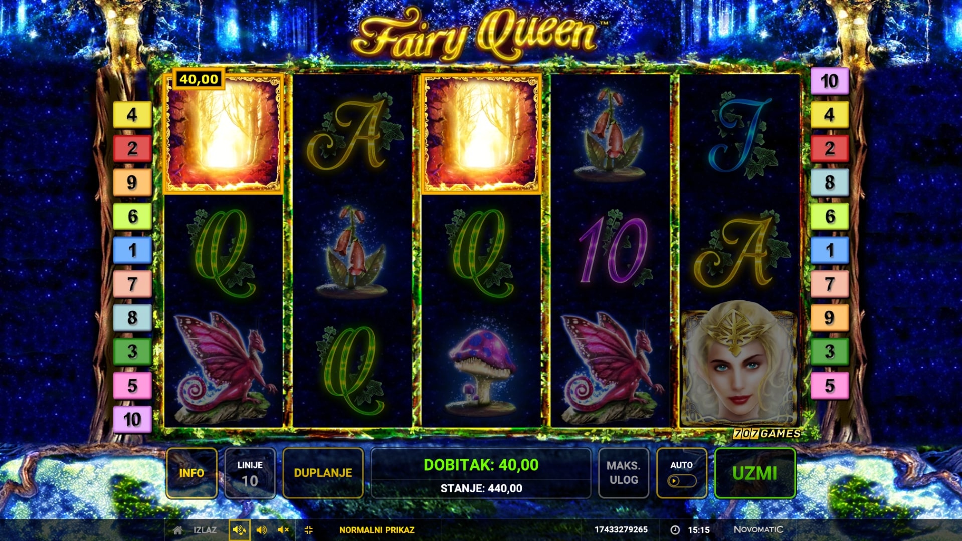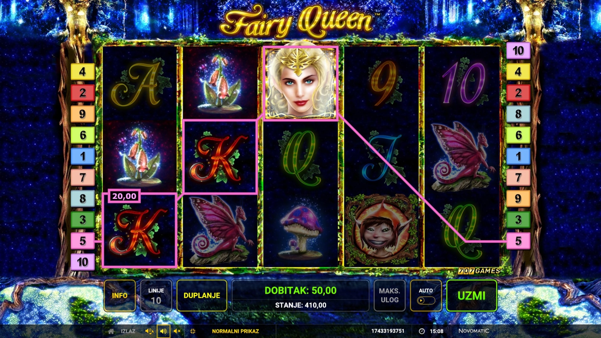 Fairy Queen slot je igra čarobnog karaktera koja vodi igrača u svijet vila i vilenjaka. Simboli su inspirirani čarobnim bićima i šumskim životom, a najviše isplaćuju nadnaravni simboli Wilda i Scattera. Wild služi kao zamjena za druge simbole, dok simbol Scattera može igraču osigurati putovanje u paralelni svijet besplatnih vrtnji. U slučaju dobitka, igrač može pokušati udvostručiti dobitke pogađanjem boje karte okrenute licem prema dolje. Zaigraj Fairy Queen te osvoji vrhunske nagrade!
