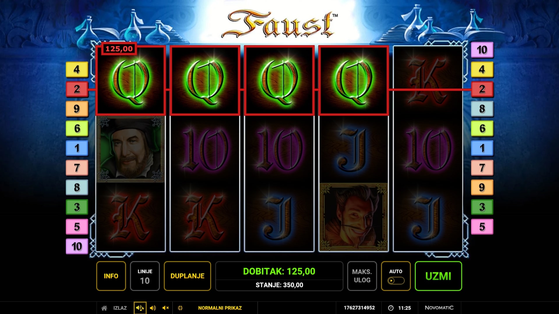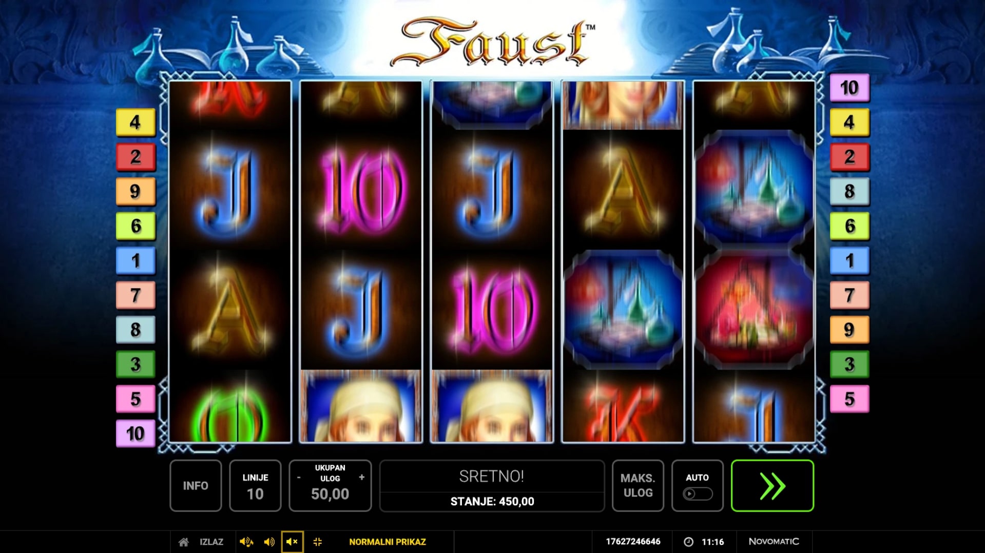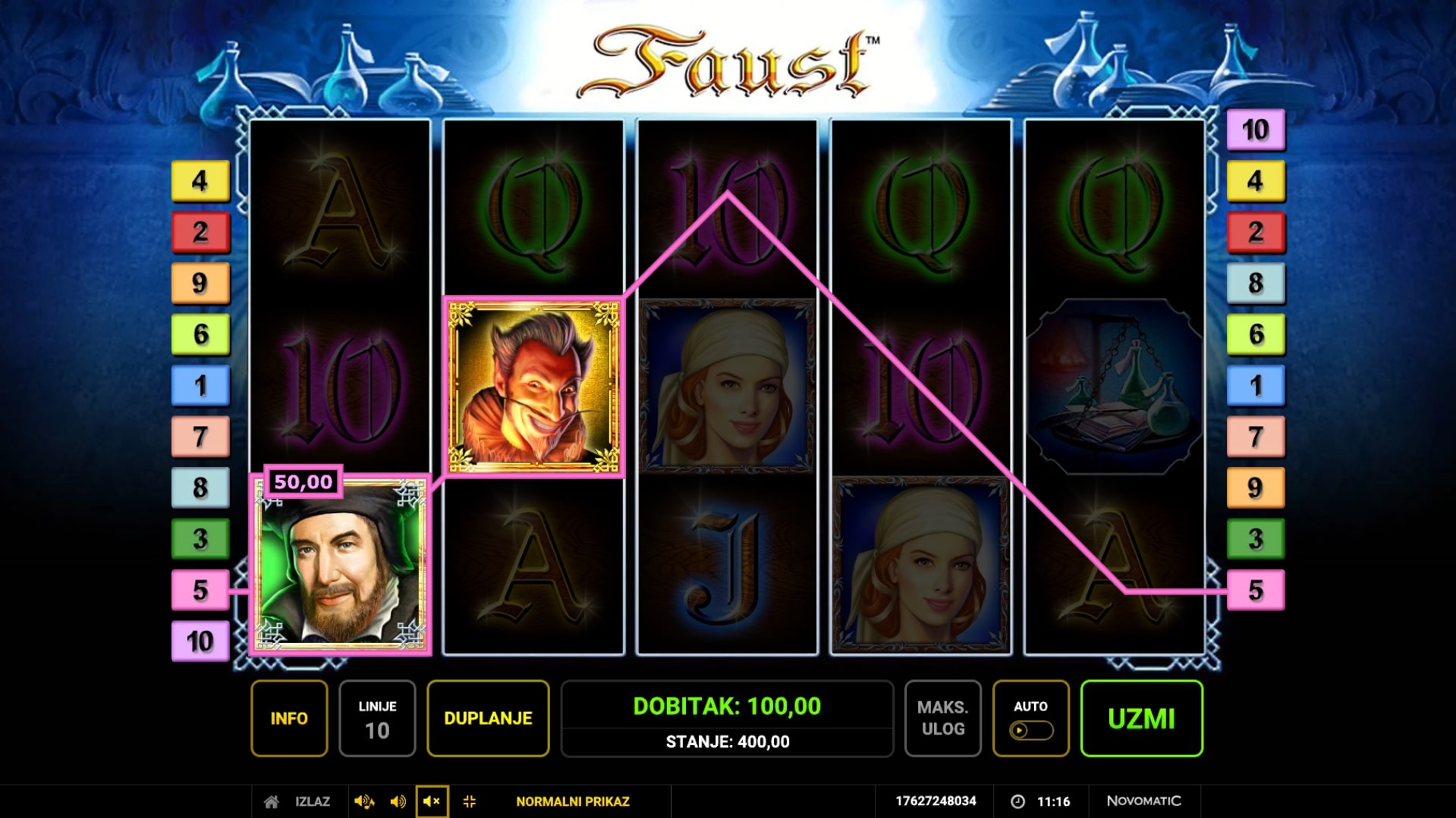 Faust je fantastična slot igra koja vodi igrača u misteriozni svijet tajni i čarolije. Igra je inspirirana njemačkom legendom o astrologu koji je prodao svoju dušu vragu za svu moć i znanje svijeta, a najviše vrijede upravo simboli s ilustracijama likova iz legende. Posebnu vrijednost ima Scatter simbol koji može zamijeniti druge simbole, ali i osvojiti igraču besplatne vrtnje. Unutar igre dobitke je moguće i udvostručiti pogađanjem boje karte okrenute licem prema dolje. Zaigraj slot Faust i ostvari fantastične dobitke!