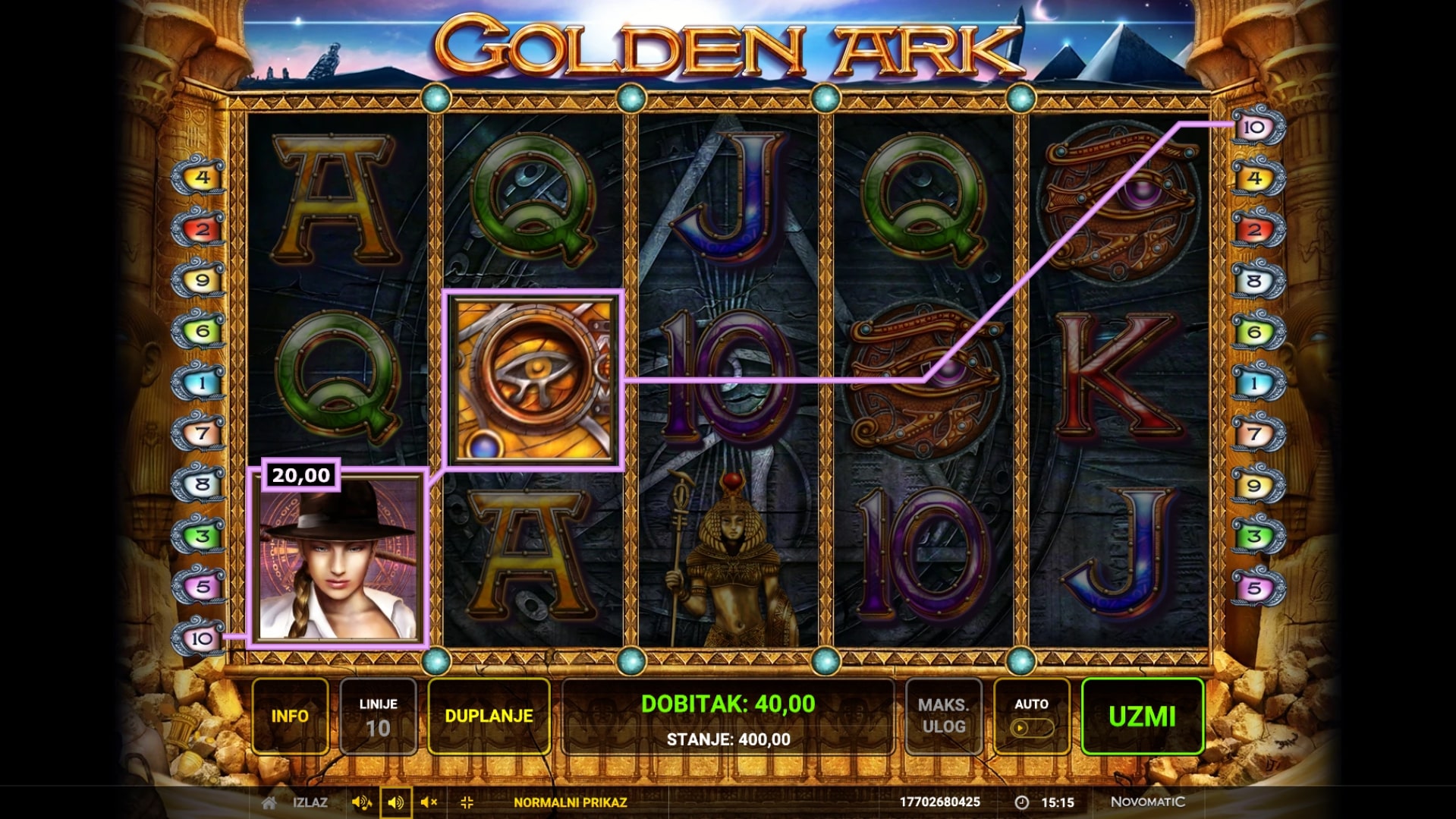 Golden Ark slot je igra povijesnog karaktera koja vodi igrača unutar egipatskih piramida u potrazi tajnama i blagima drevne civilizacije. Najviše isplaćuju simboli istraživačice i raznih staroegipatskih relikta, dok je simbol knjige najdominantniji simbol igre. Uz vrhunske dobitke, on može zamijeniti druge simbole, ali i odvesti igrača do besplatnih vrtnji. U slučaju dobitka, igrač ga može poduplati pogađanjem boje karte okrenute licem prema dolje. Zaigraj Golden Ark te osvoji mitske nagrade!