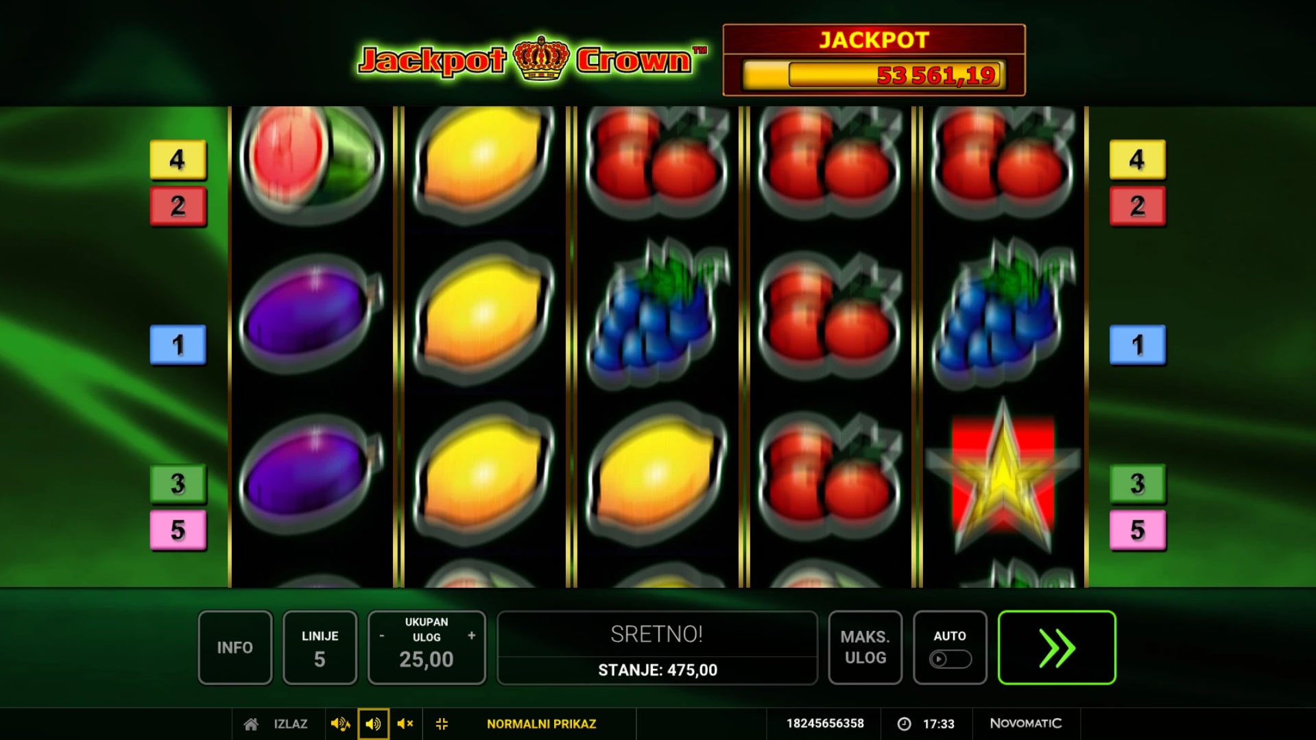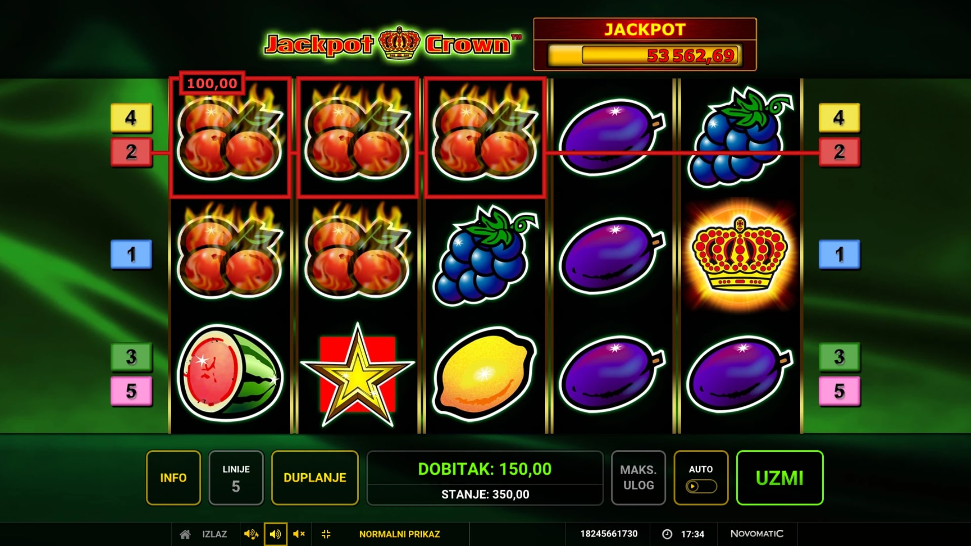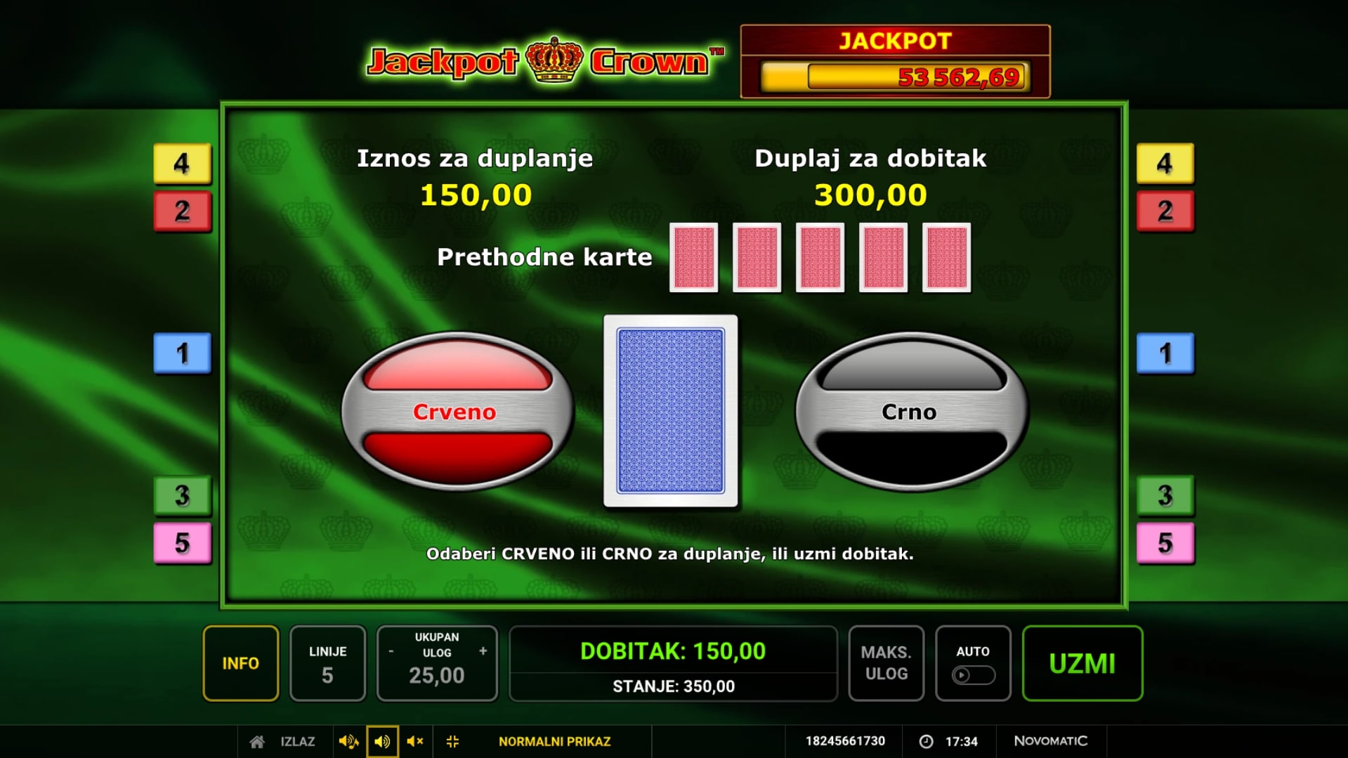 Jackpot Crown slot je igra klasičnog karaktera što vodi igrača u svijet voća i fantastičnih dobitaka. Igra je inspirirana retro slotovima na sreću, a najviše isplaćuju krune, lubenice i grožđe. Simbol krune može osigurati igraču Jackpot, dok igra sadrži i simbol zvijezde koji isplaćuje neovisno o isplatnim linijama. U slučaju dobitka, igrač ga može udvostručiti pogađanjem boje karte okrenute licem prema dolje. Zaigraj Jackpot Crown te ulovi fantastične nagrade!