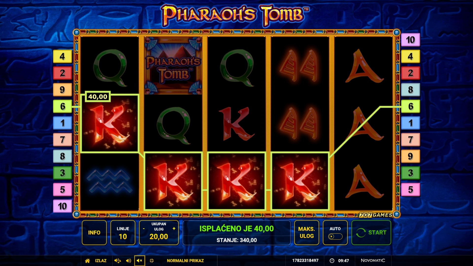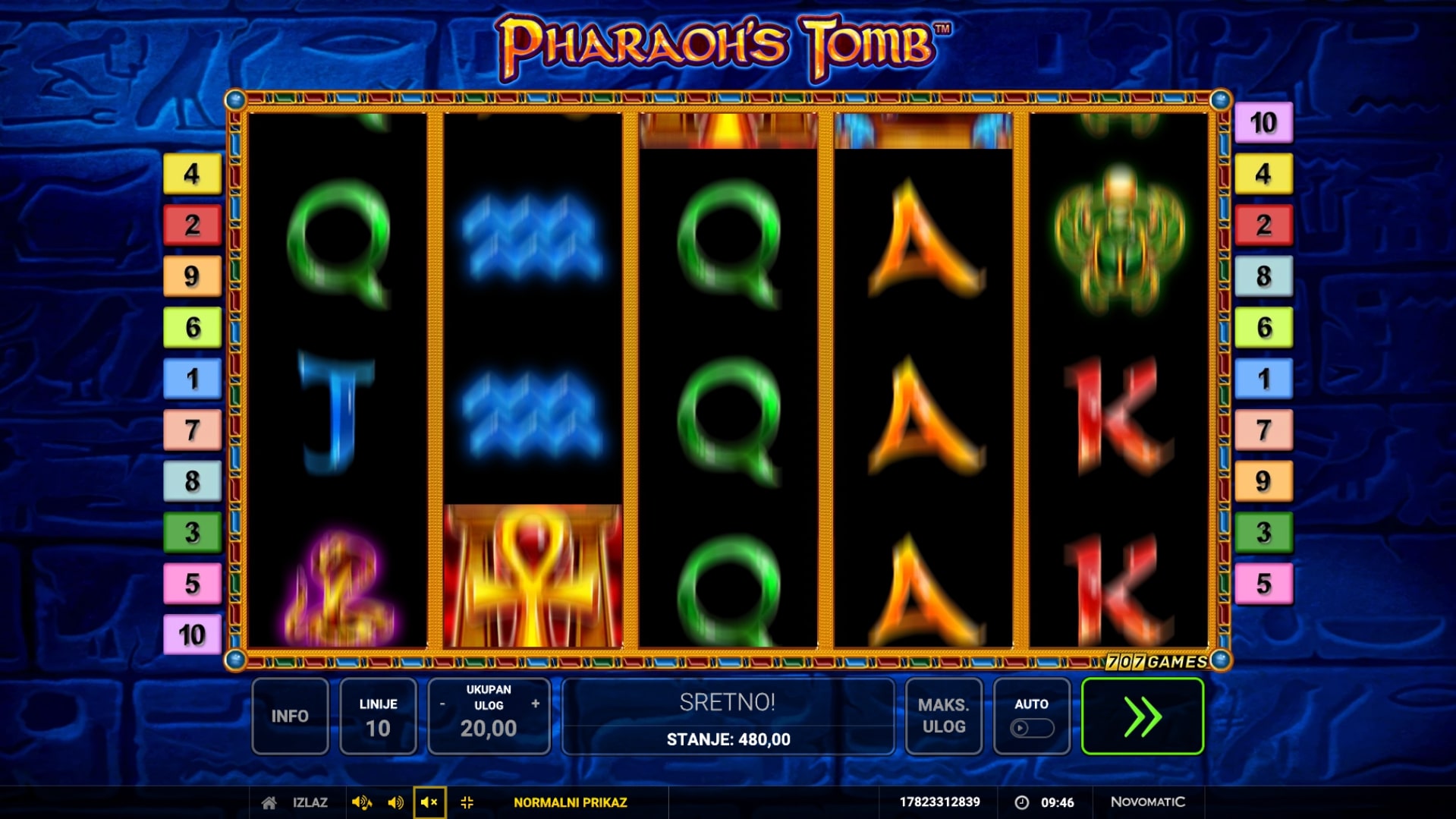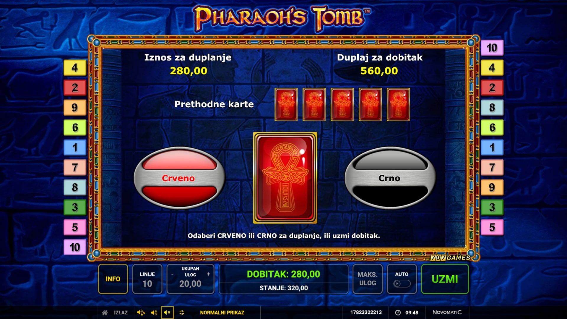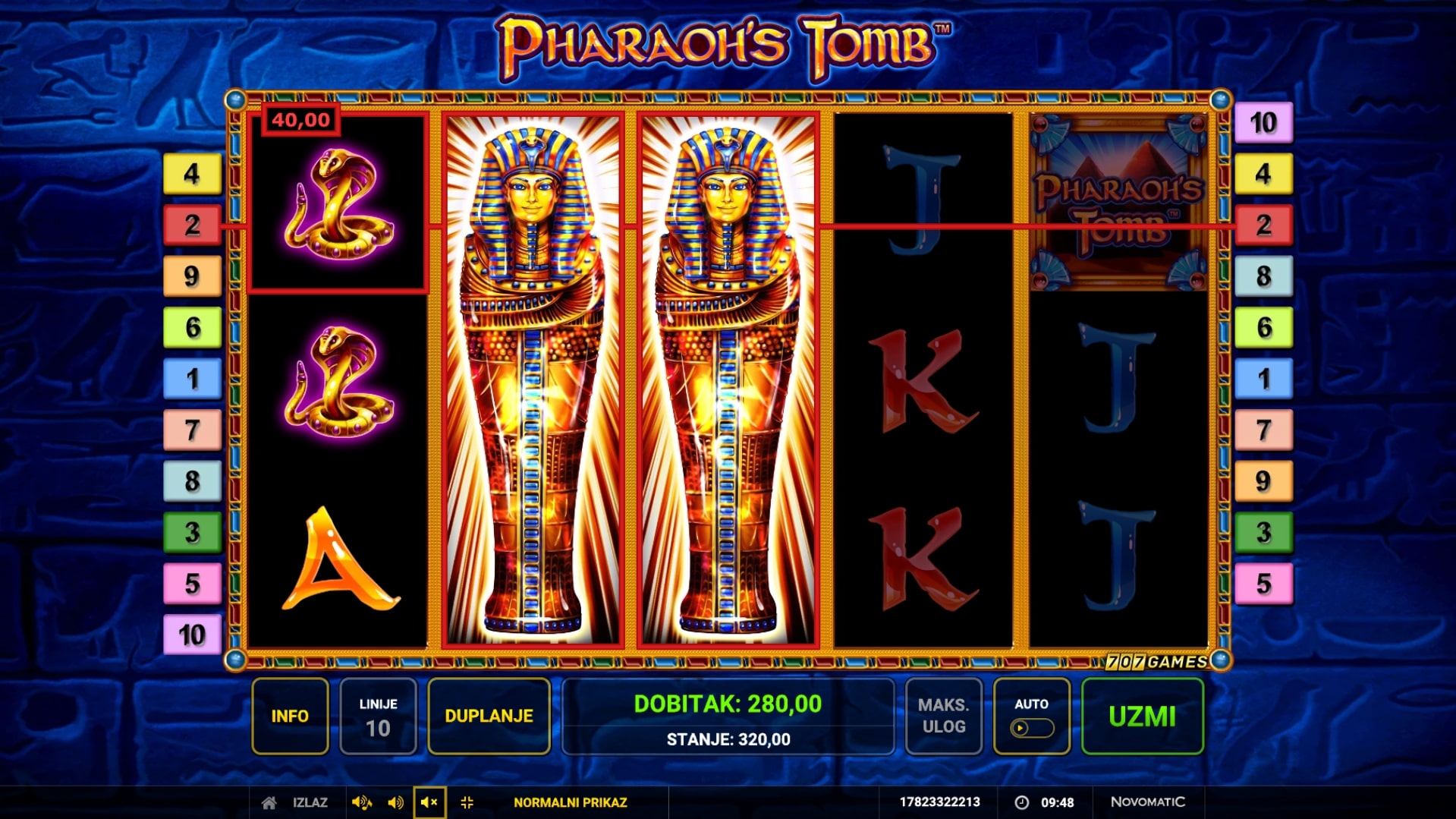 Pharaoh's Tomb slot je igra povijesne tematike koja vodi igrača u svijet tajni koje skrivaju zidovi piramida i grobnica u potrazi za najboljim dobicima. Najviše isplaćuju simboli inspirirani egipatskom mitologijom, dok simbol faraona pomaže u stvaranju dobitaka zamjenom drugih simbola. Uz to, igrač može ostvariti besplatne vrtnje javljanjem simbola piramida. U slučaju dobitka, igrač ga može udvostručiti pogađanjem boje karte okrenute licem prema dolje. Zaigraj Pharaoh's Tomb te osvoji vrhunske nagrade!