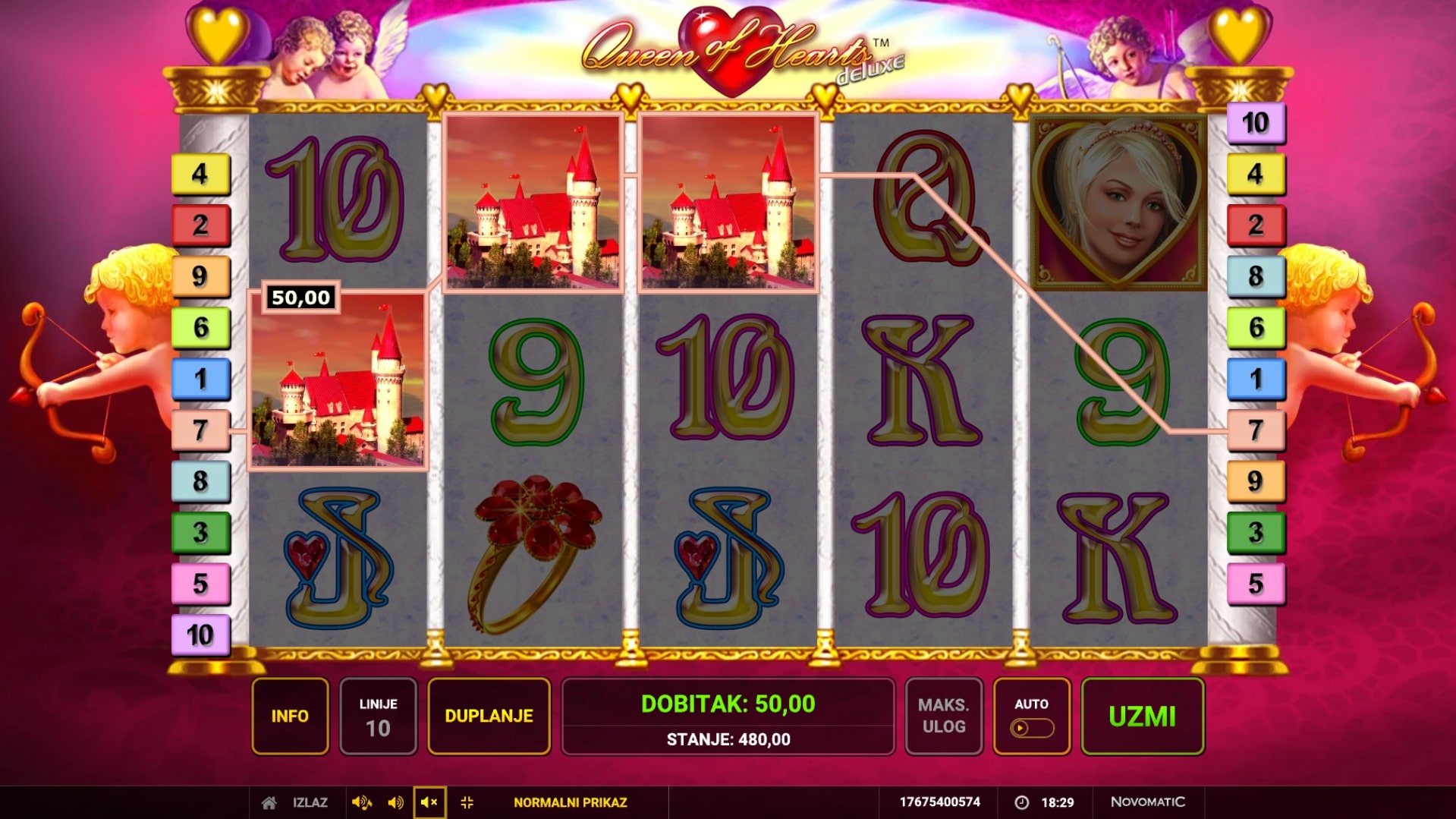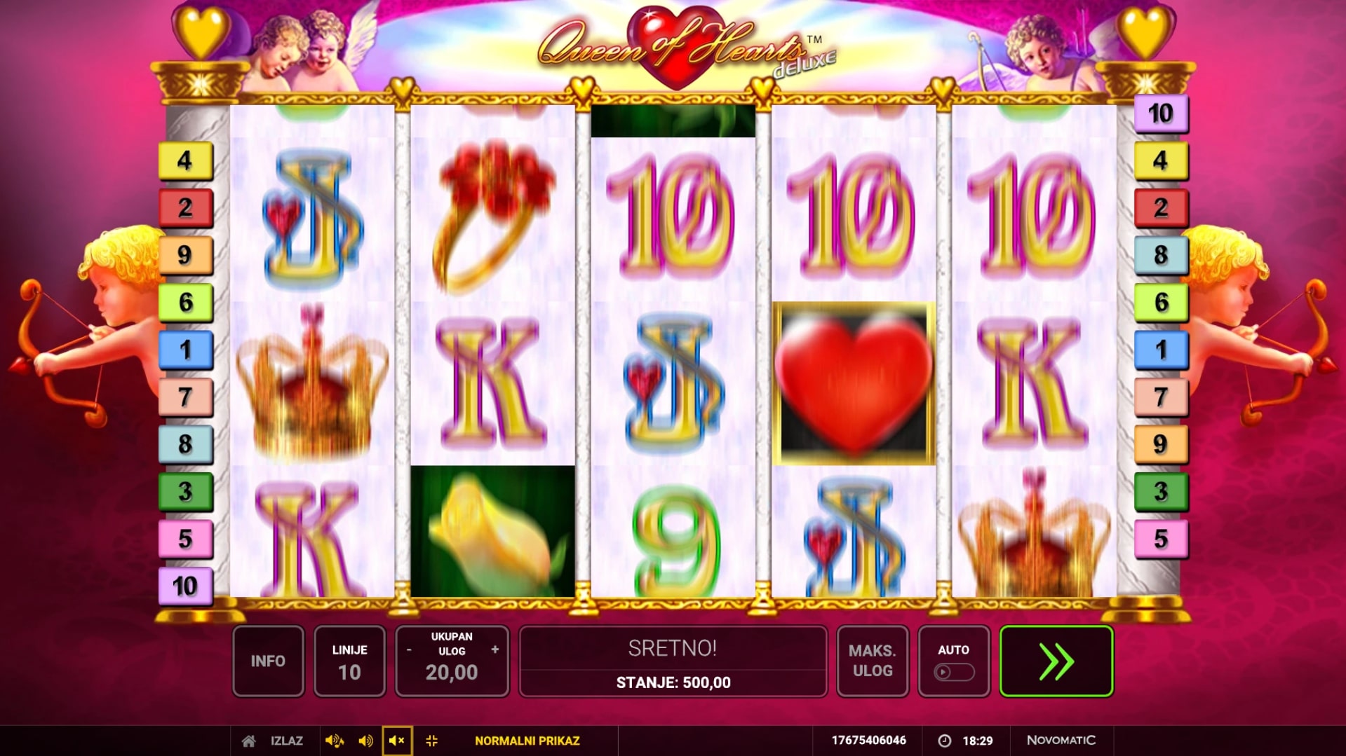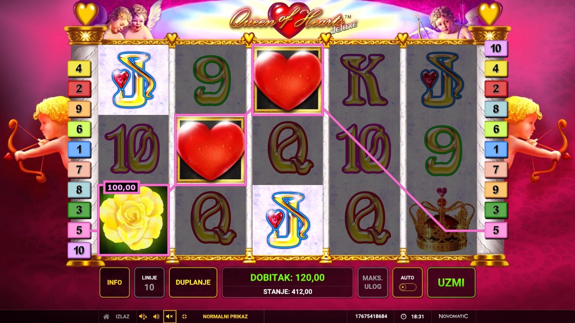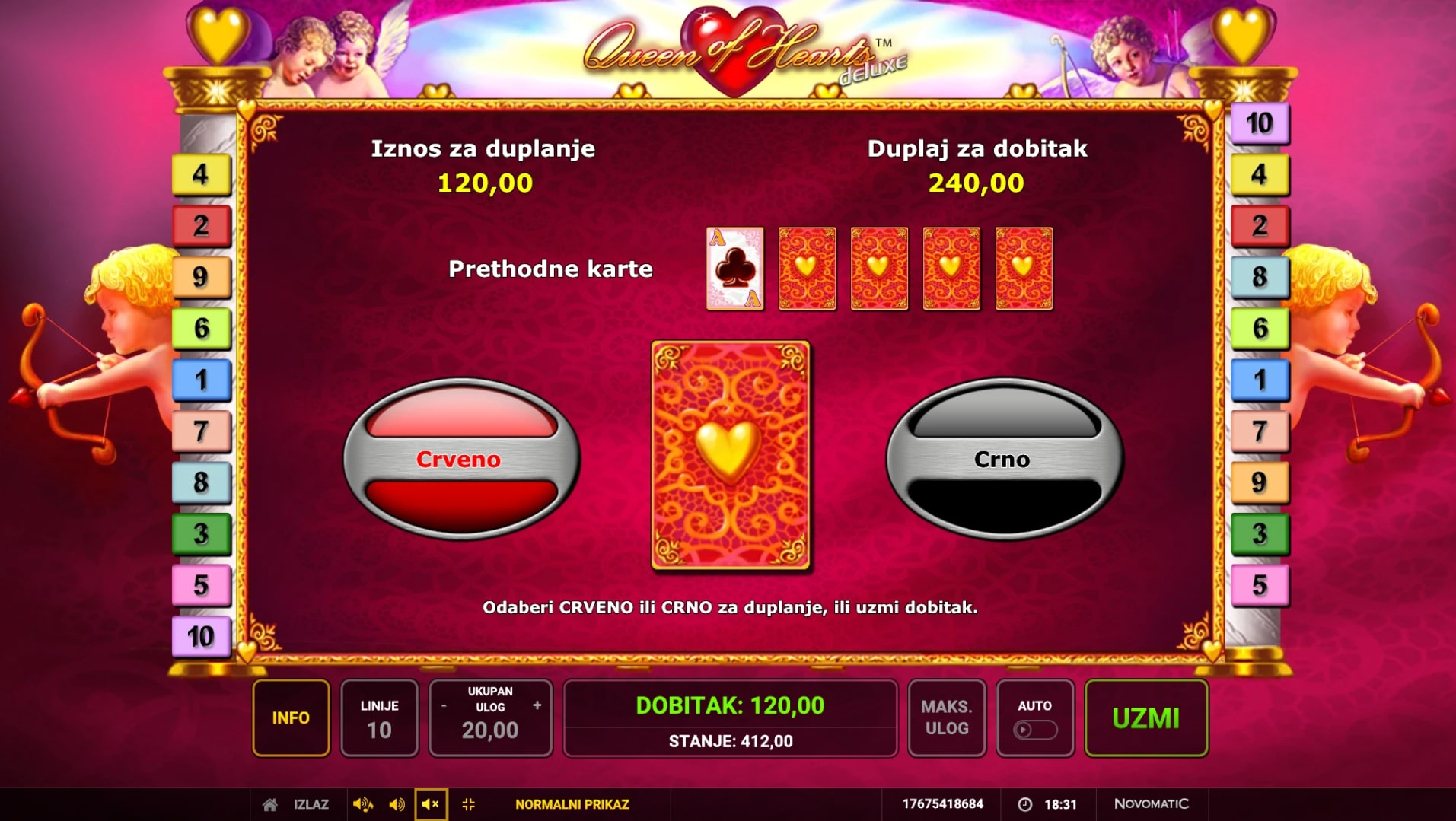 Queen of Hearts Deluxe slot je igra ljubavne tematike koja igraču može ostvariti i najvatrenije želje. Simboli su inspirirani svijetom romantike i zabave, a najviše isplaćuju ruže, srca i kraljice. Simboli srca i kraljice također imaju posebne uloge Wilda i Scattera što znači kako mogu služiti kao zamjena za druge simbole, odnosno osvojiti igraču besplatne vrtnje. Uz to, igrač dobitke može pokušati samostalno udvostručiti pogađanjem boje karte okrenute licem prema dolje. Zaigraj Queen of Hearts Deluxe te osvoji vatrene nagrade!