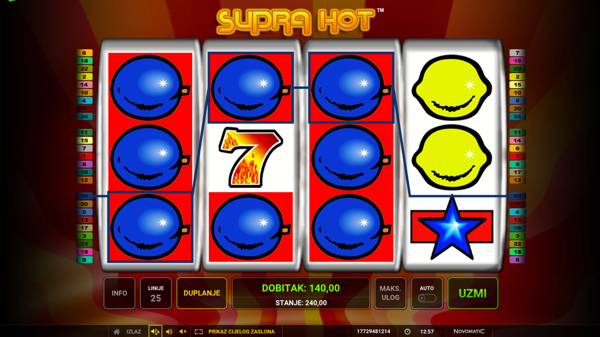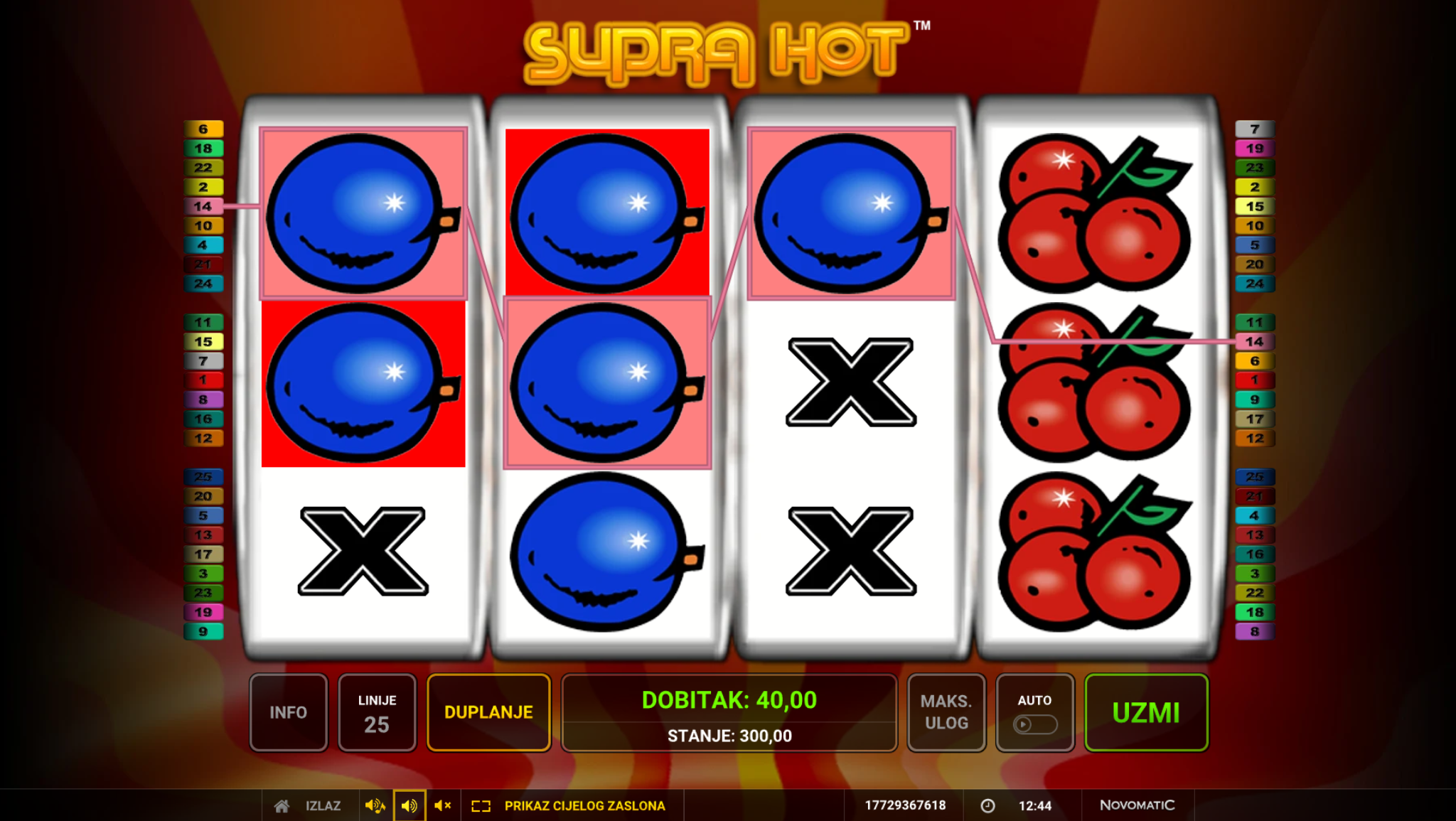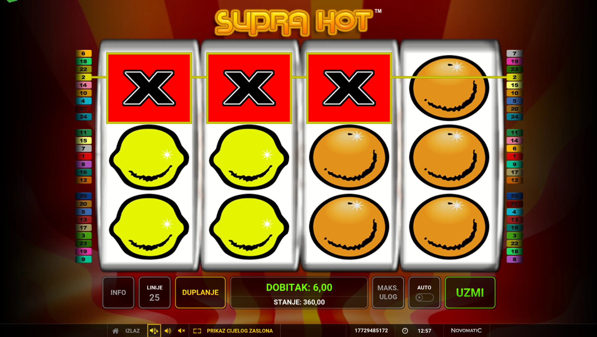 Ljubitelj si klasičnih i jednostavnih voćih slotova? Na pravom si mjestu jer Supra Hot pruža sve to, a i mnogo više. Primamljivo ilustrirano voće jednostavnog dizajna, kao i način igranja učiniti će dozu zabave i zanimacije nedostižnom! Kako uzbuđenju tu nebi bio kraj, pobrinuti će se užarene sedmice i igranje pretvoriti u super uzbudljivo te bogato po pitanju dobitaka! Kao jedan od najpopularnijih slotova, Supra Hot odličan je izbor za sve igrače koji vole izvrstan omjer rizika i dobitaka.