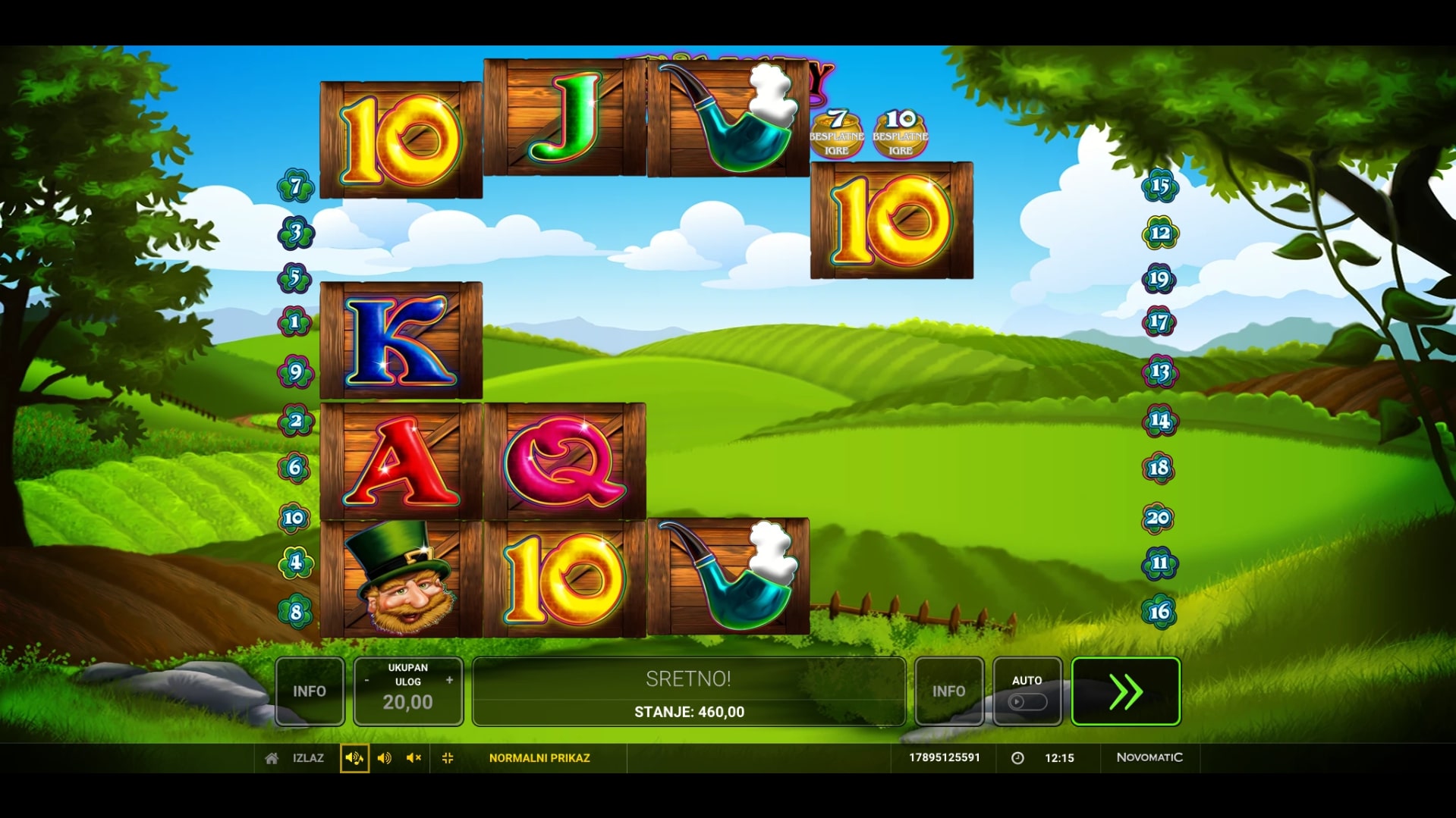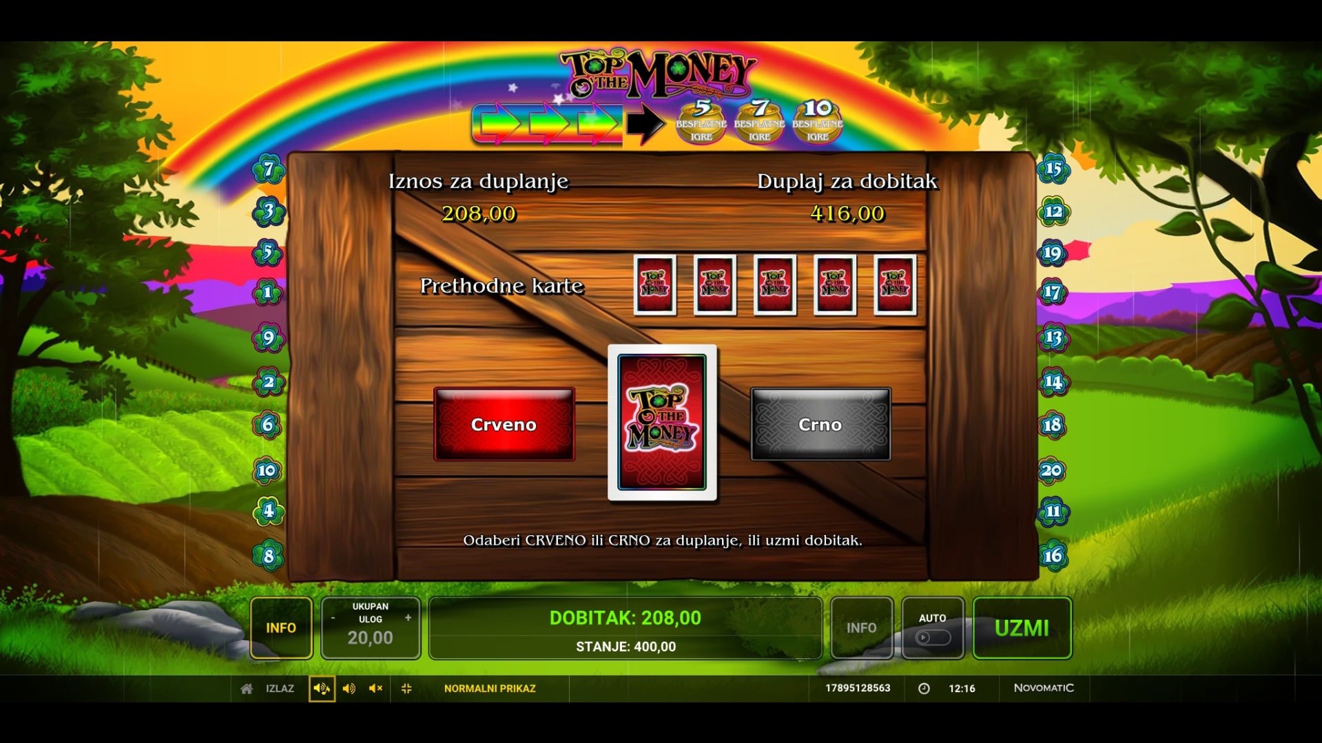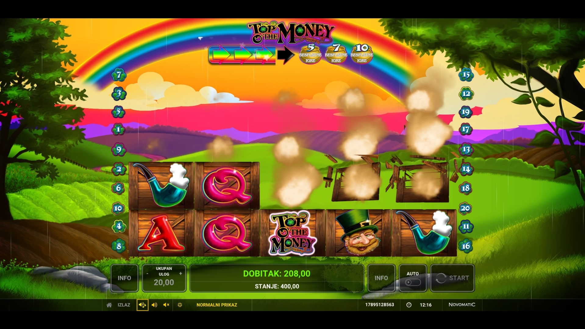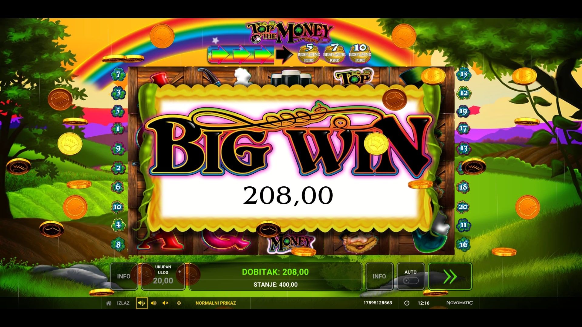 Top o' the Money slot je igra tematskog karaktera koja vodi igrača ispod duge u svijet zlata i vrhunskih dobitaka. Najviše isplaćuju violine, piva, lule, vilenjaci i Top o' the Money simbol, dok djetelina s četiri lista pomaže u stvaranju dobitaka zamjenom drugih simbola. Igra uz to Freefall značajku, odnosno nakon isplate dobitni simboli nestaju, a na njihovo mjesto padaju novi sve dok ne ponestane dobitnih kombinacija. Zaigraj Top o' the Money te osvoji fantastične nagrade!