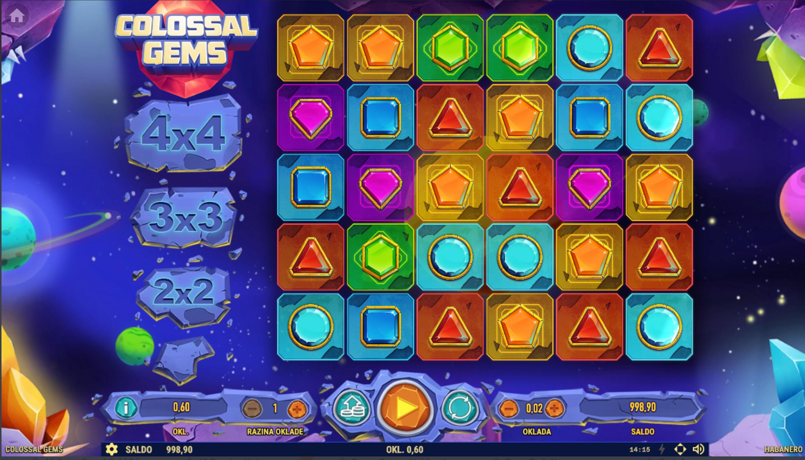 Colossal Gems je video slot razvijen od strane Habanero, smješten u svemirski svijet dragulja. Igra se odvija na 6 kolona i 5 reda, s 30 isplatnih linija. Osnovni cilj je složiti dobitne kombinacije od lijeva prema desnu, koristeći simbole koji se pojavljuju na aktivnim linijama. Igra uključuje značajke poput besplatnih vrtnji, respinova i divovskih simbola dragulja.