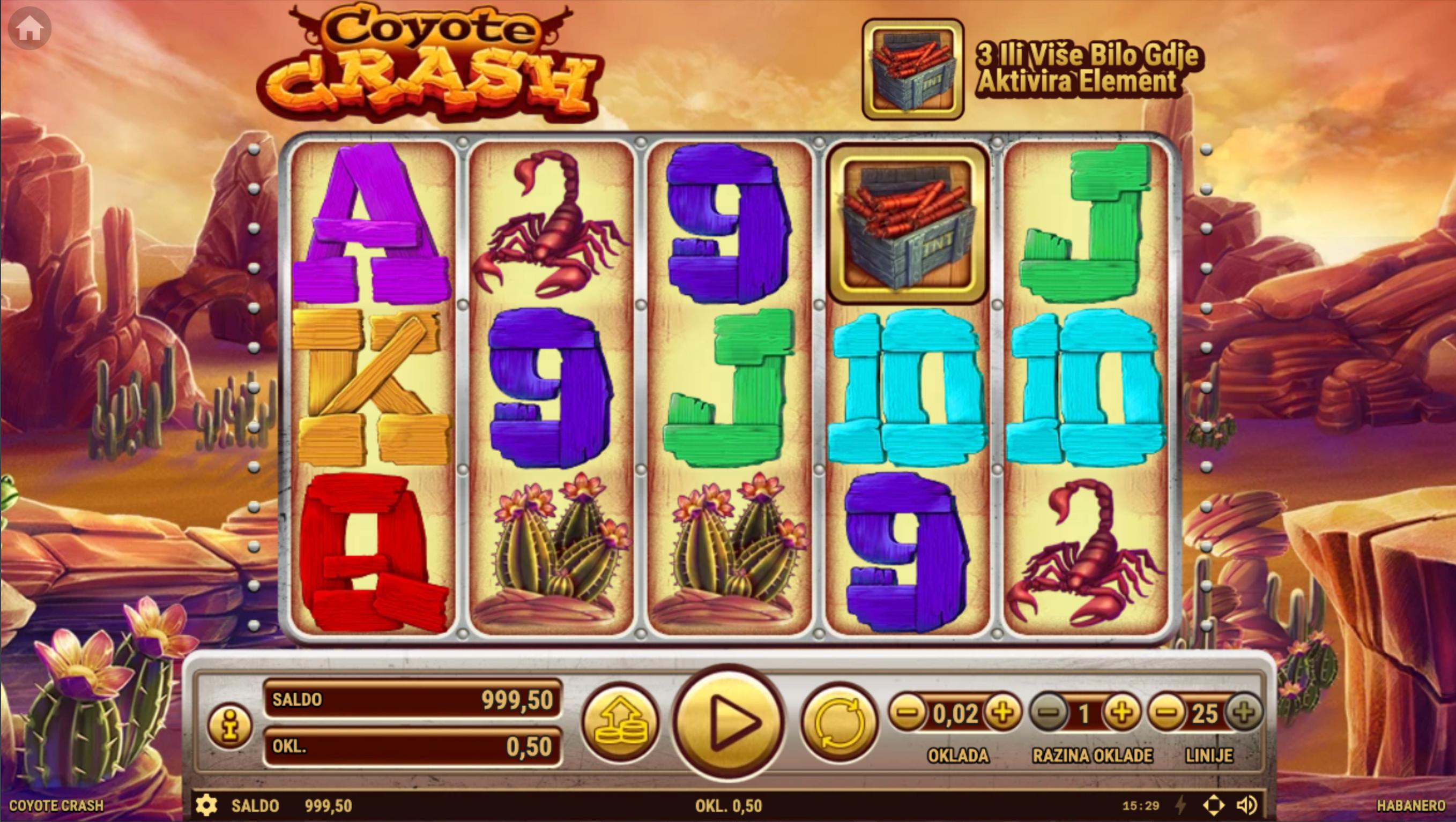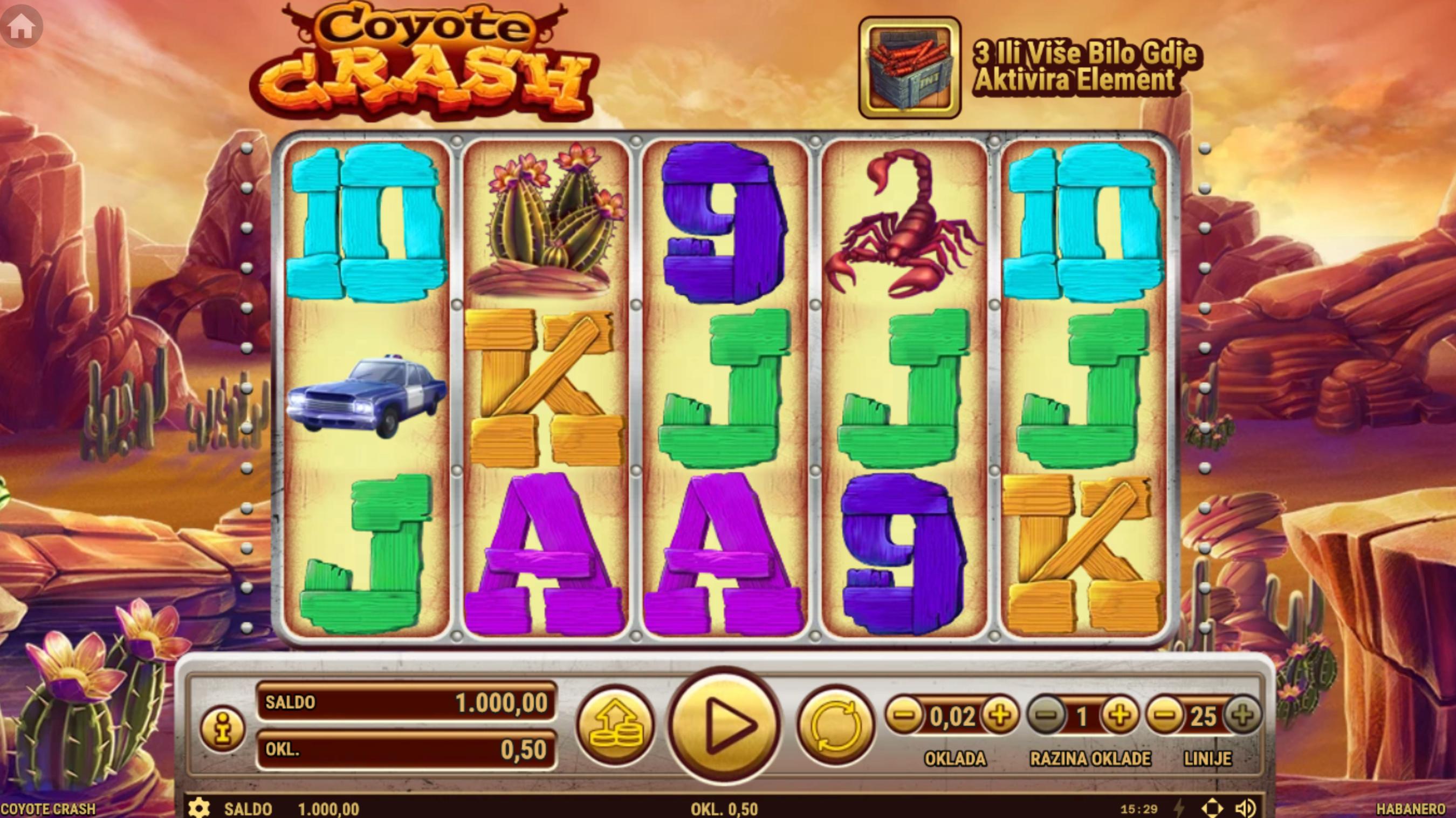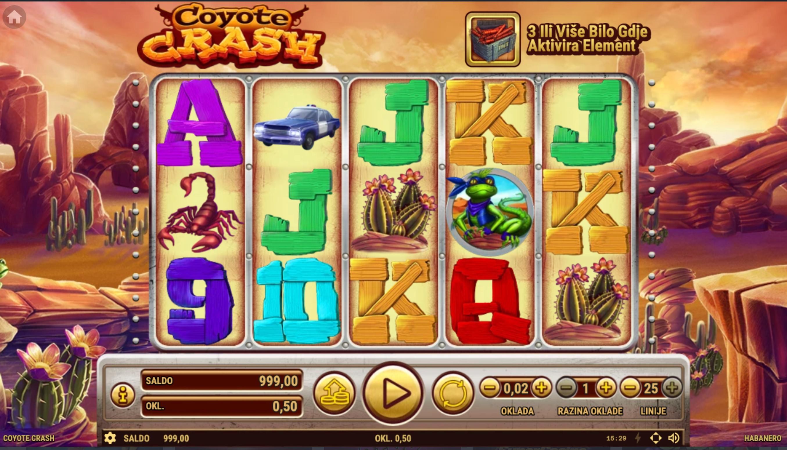 Coyote Crash je slot igra koju je razvio Habanero, smještena u svijet divljeg zapada s animiranim likovima. Igra se odvija na mreži od 5 koluta i 25 dobitnih linija. Grafika igre prikazuje razne likove poput coyotea, skorpiona, kaktusa i policajca u obliku medvjeda, smještene u pustinjsku scenografiju s kaktusima i kamenim formacijama. Zvukovi igre uključuju zabavnu glazbu koja pojačava atmosferu pustolovine.