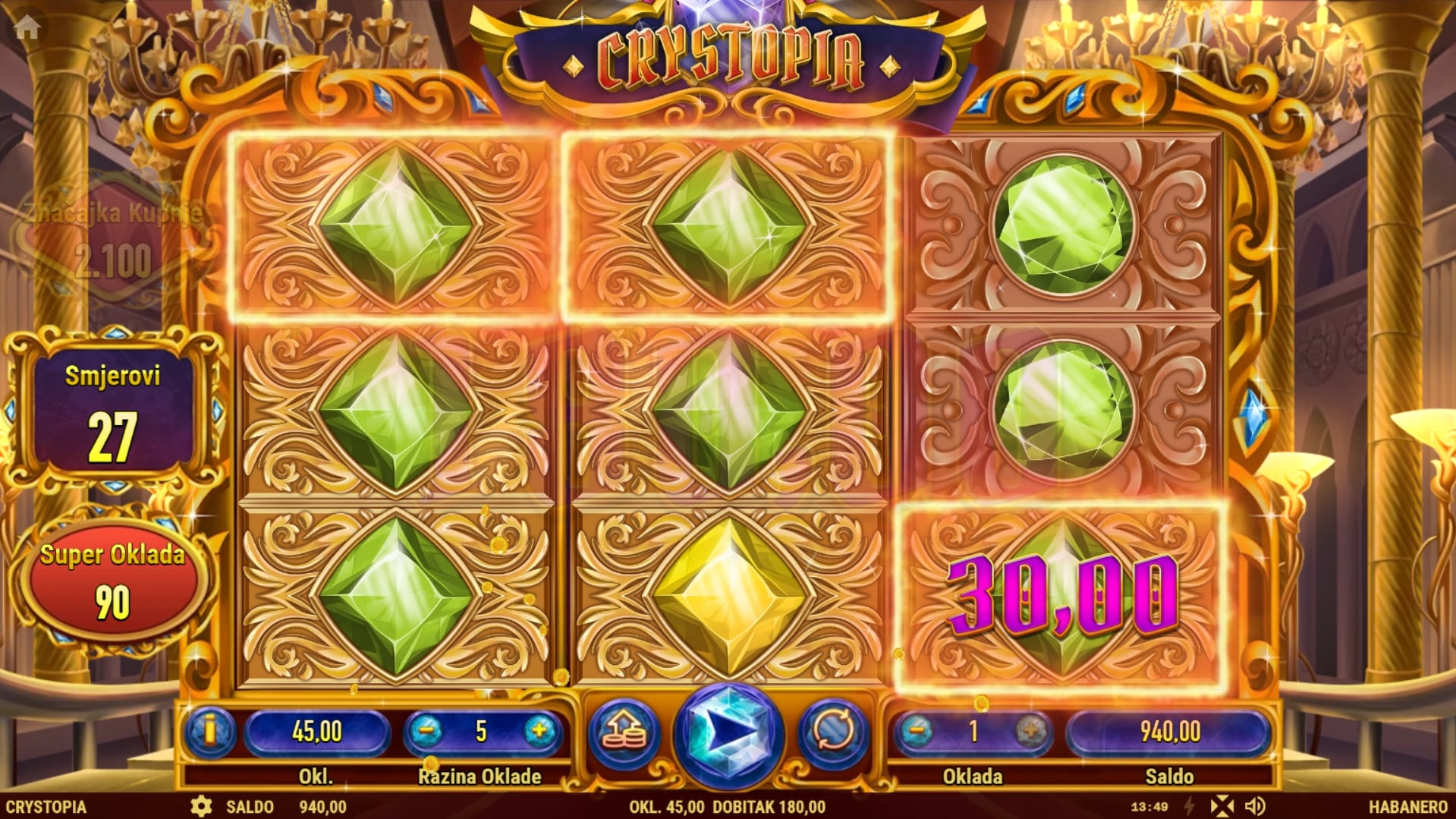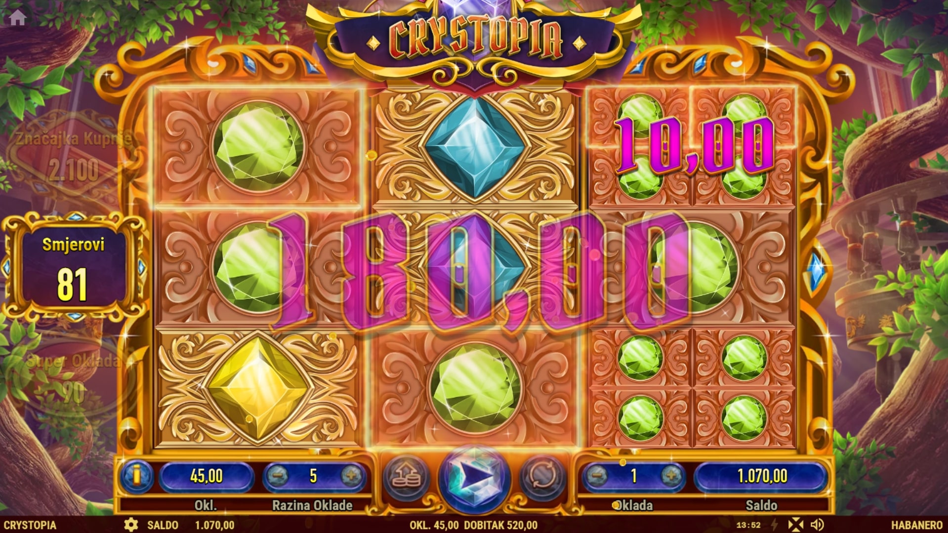 Crystopia slot je igra koja vodi igrača u svijet dragog kamenja koje zrači luksuzom i vrhunskim dobicima. Najviše isplaćuju četvrtasti simboli dragog kamenja, dok posebni dragulj obilježen zavjesama služi kao alfa i omega igre. On može zamijeniti druge simbole, ali i odvesti igrača do besplatnih vrtnji. Igra uz to sadrži značajku simbola podjele koja može simbol prepoloviti na dva ili četiri dijela kako bi se povećali dobici. Zaigraj slot Crystopia za najbolje nagrade!