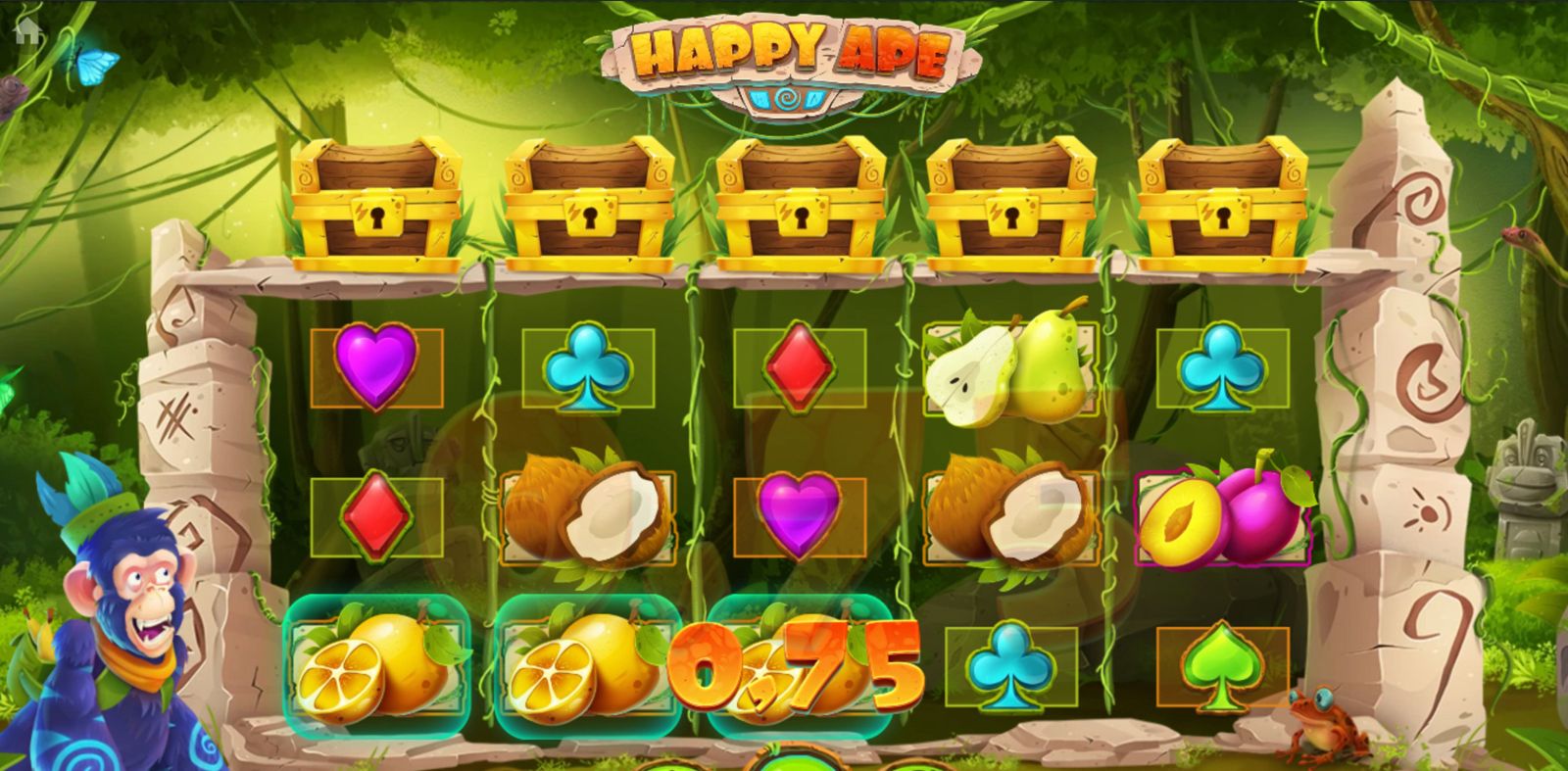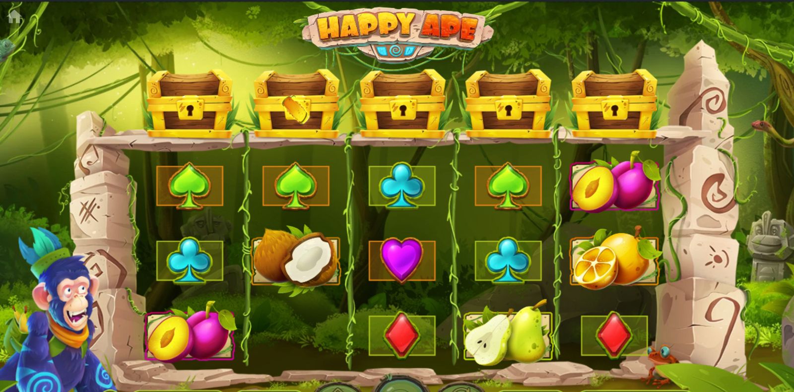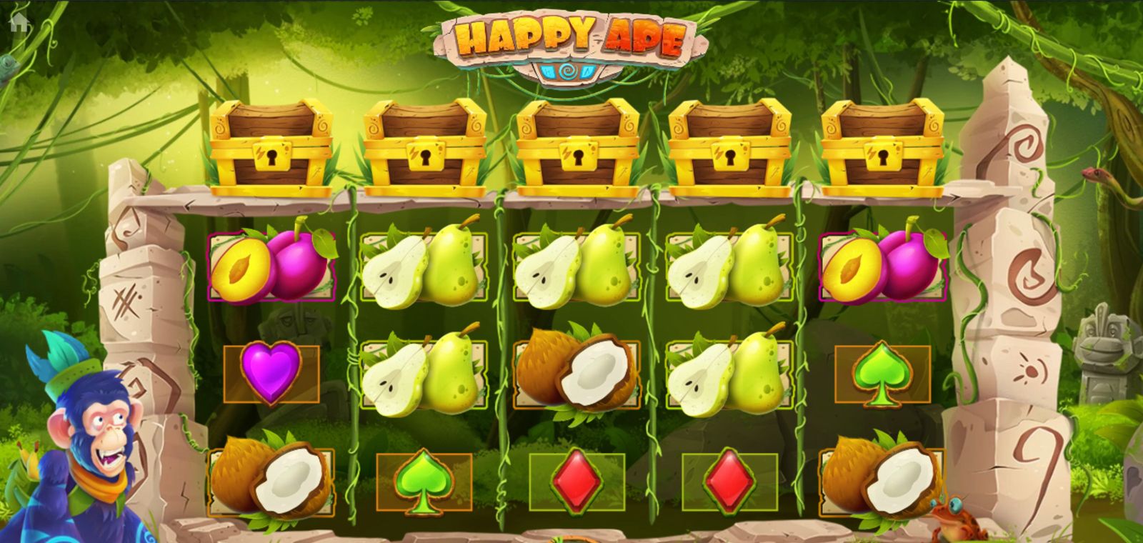 Happy Ape je video slot od Habanero smješten u šarenu džunglu punu banani, zlatnih majmuna i skrivenih blaga. S 5 koluta i 15 isplatnih linija, igra nudi bogatstvo bonus značajki koje uključuju besplatne vrtnje, Wild simbole, multiplikatore i nasumične nagrade iz kutija s blagom. Dizajn igre je živahno animiran, a zvučni efekti dočaravaju atmosferu tropske avanture.