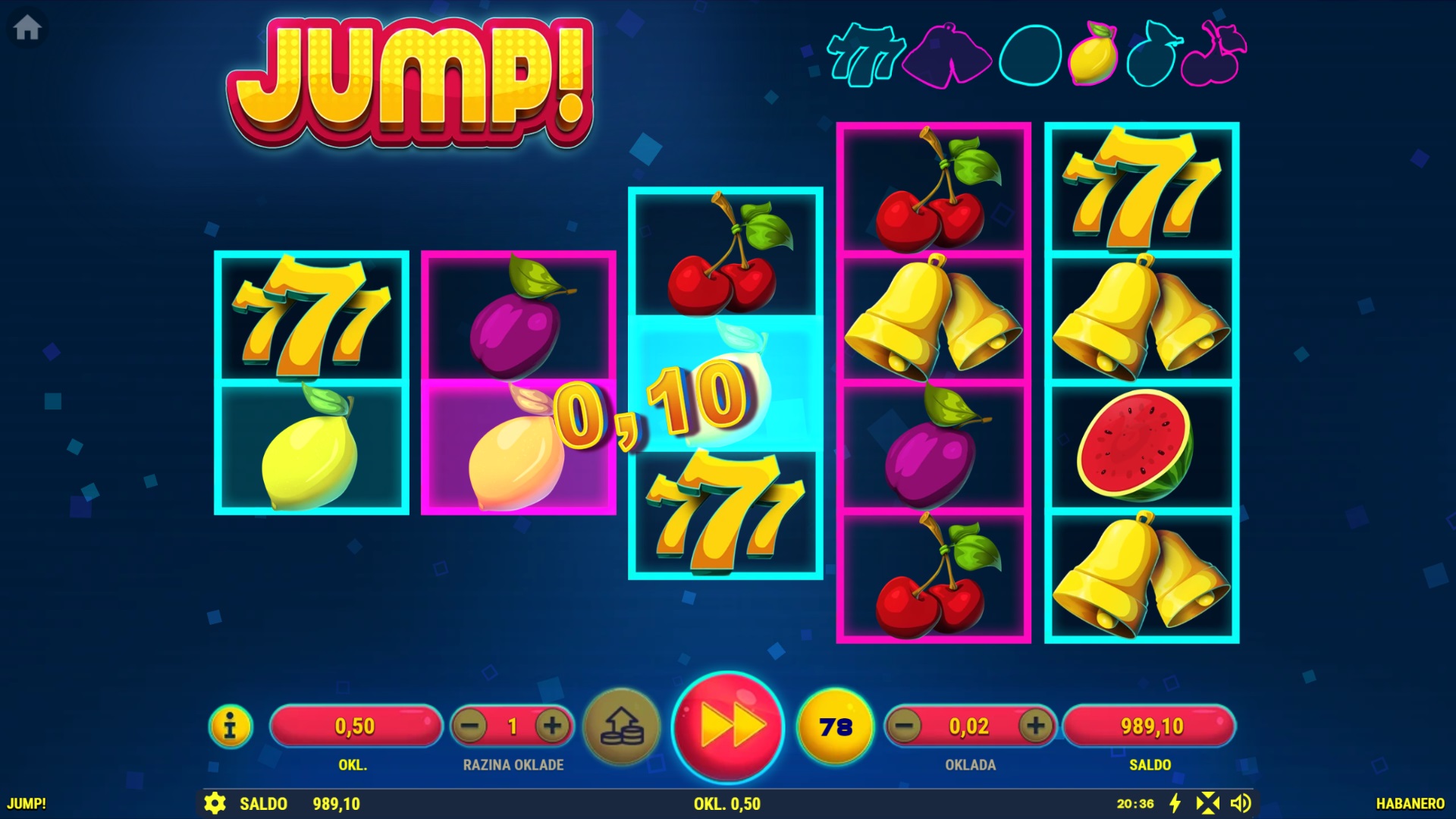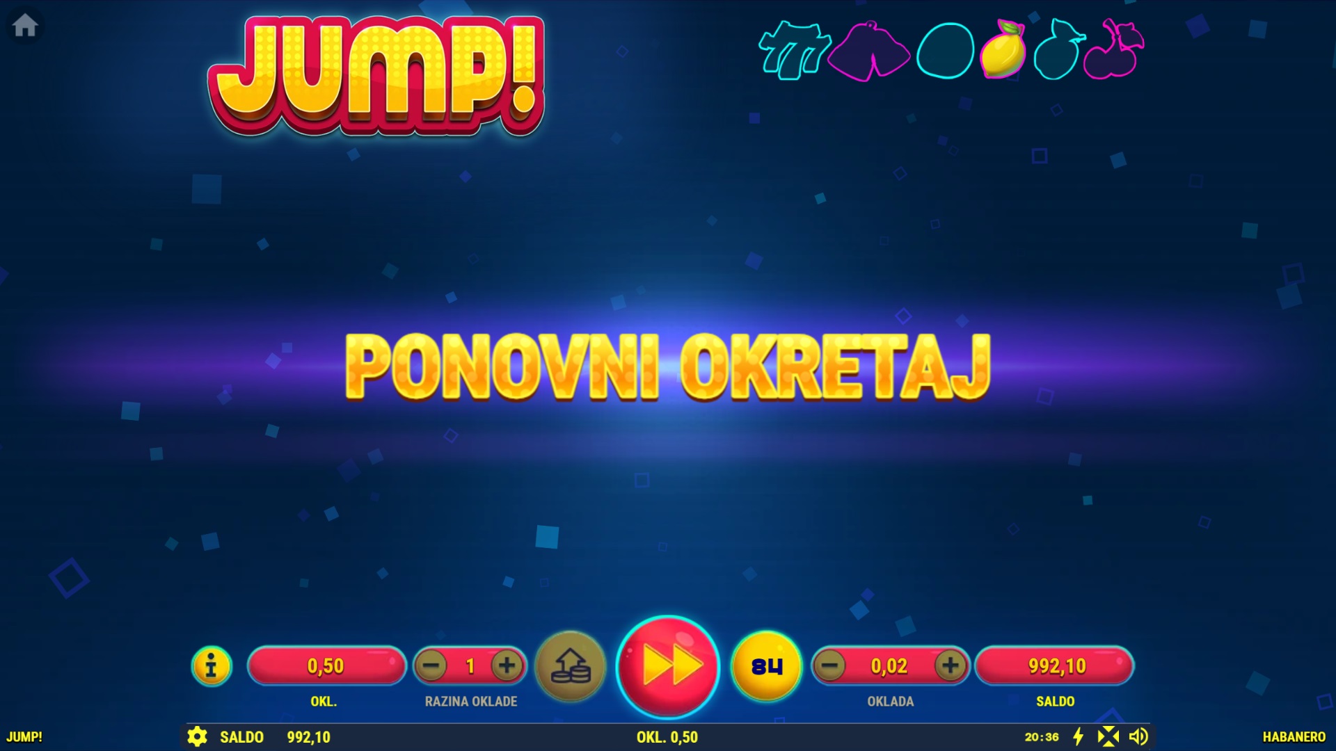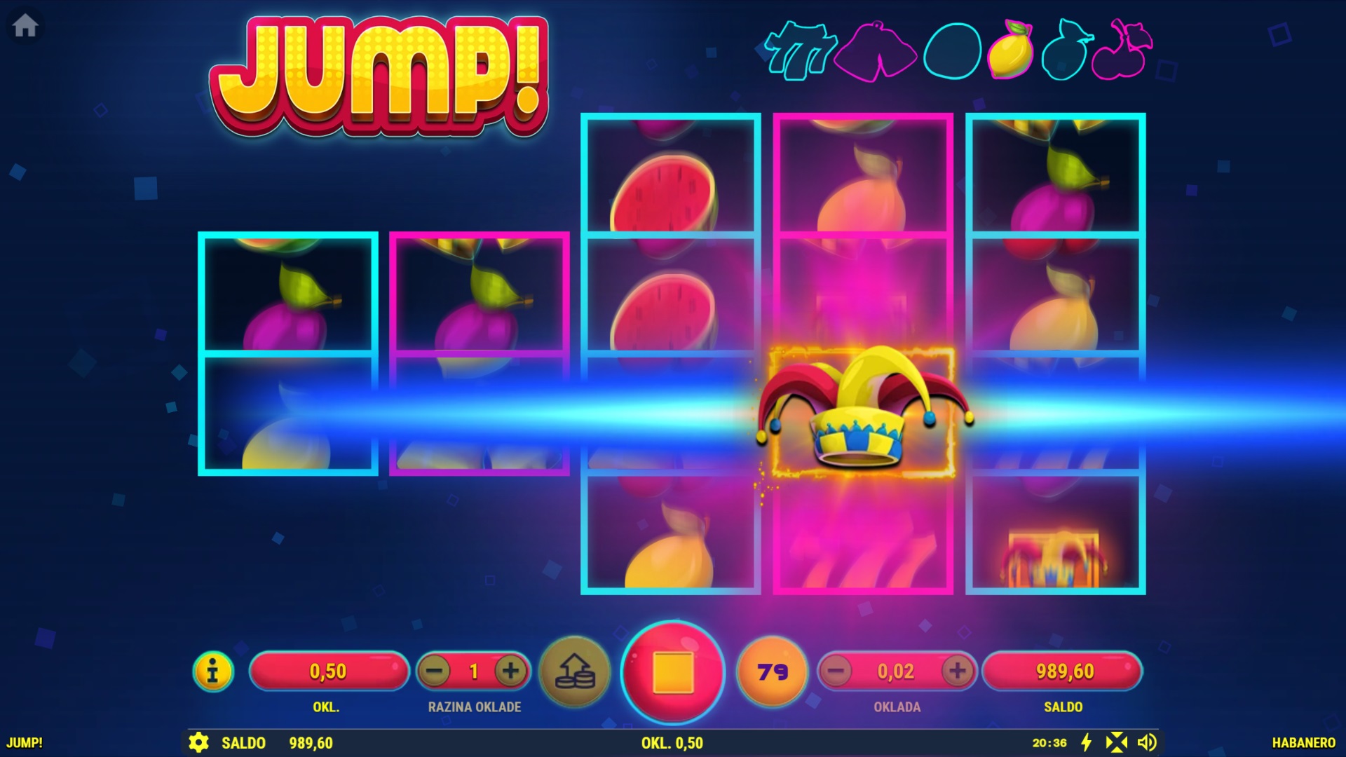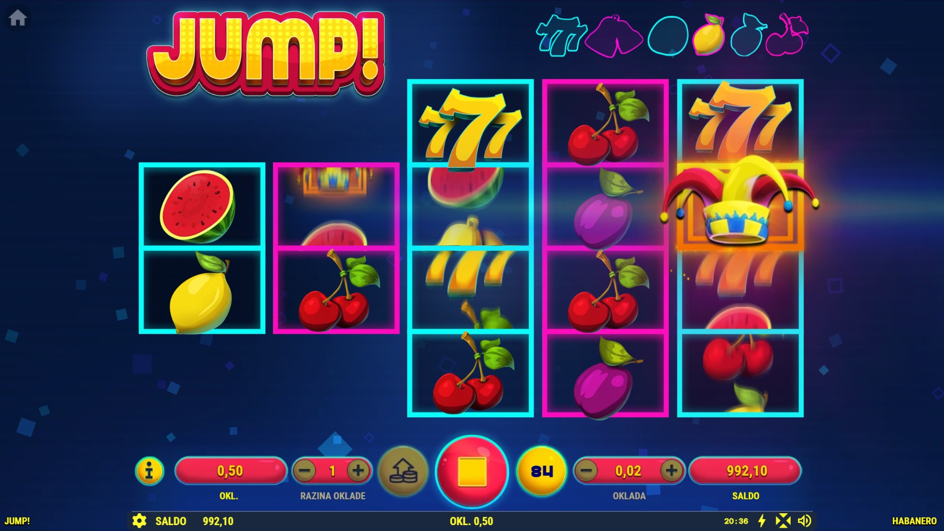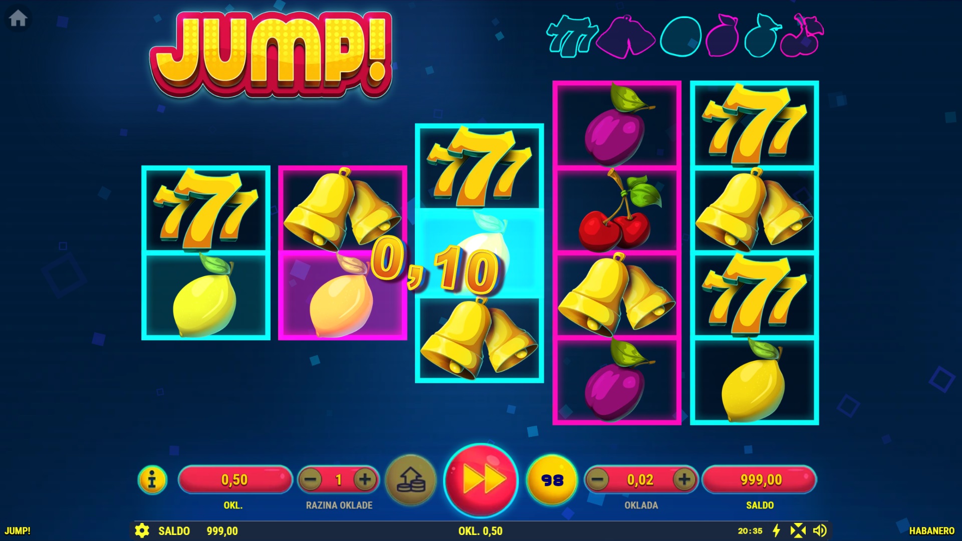 Jump! je uzbudljiva slot igra koja će te vratiti u vrijeme kad je igranje bilo brzo i zabavno, a glavni cilj bio skupljanje kovanica! S pet Re-Spinova i Jumping Joker simbolom, ova igra nudi nevjerojatne nagrade, uključujući 7 besplatnih igara. Jump! nudi do 1024 načina za dobitak, a sa svakim okretajem povećavaš svoje šanse. Igra je prepuna šarenih simbola i dodatnih prilika za dobitak, a zahvaljujući jednostavnom gameplayu, pruža jednako uzbuđenje novim i iskusnim igračima.
