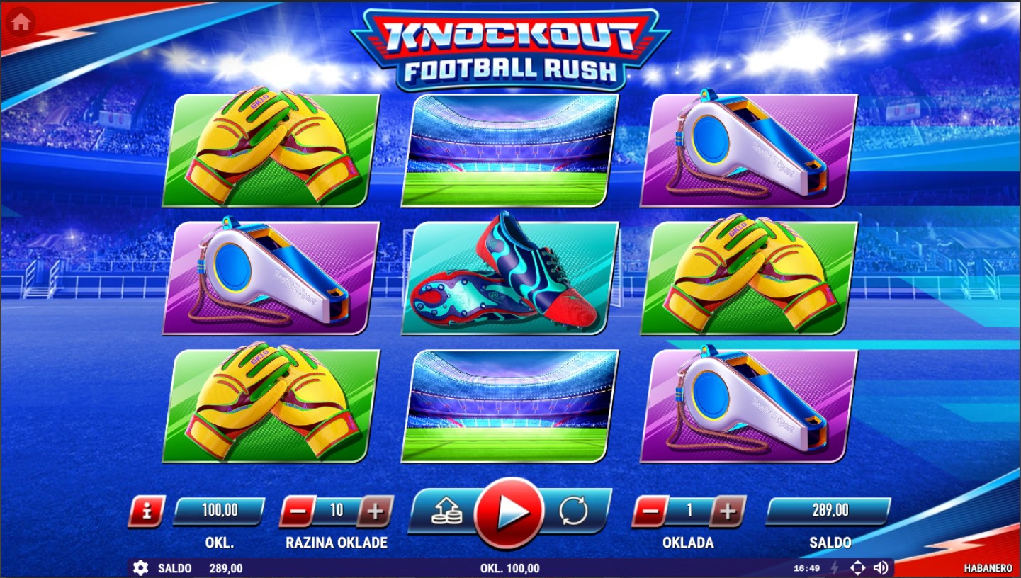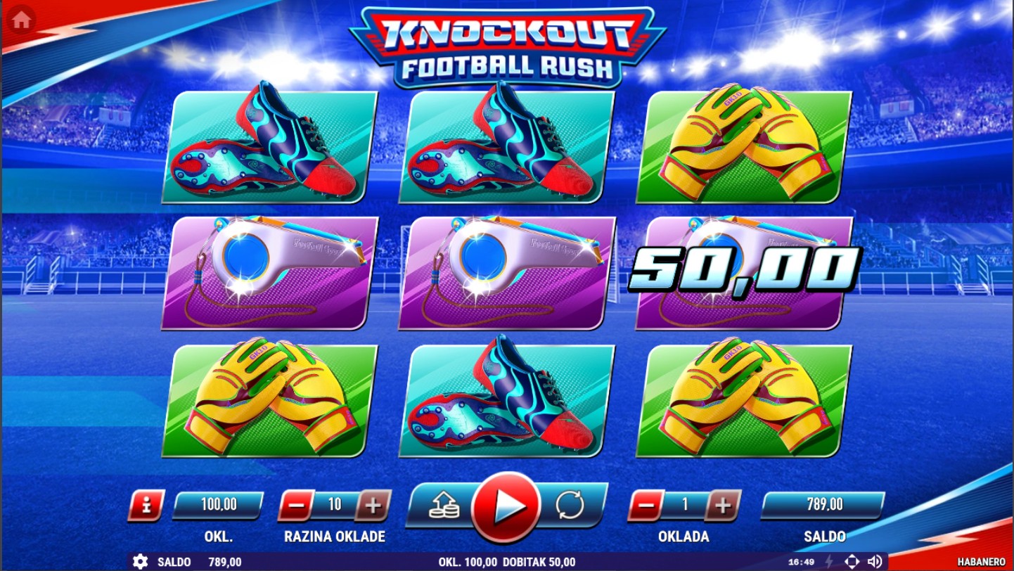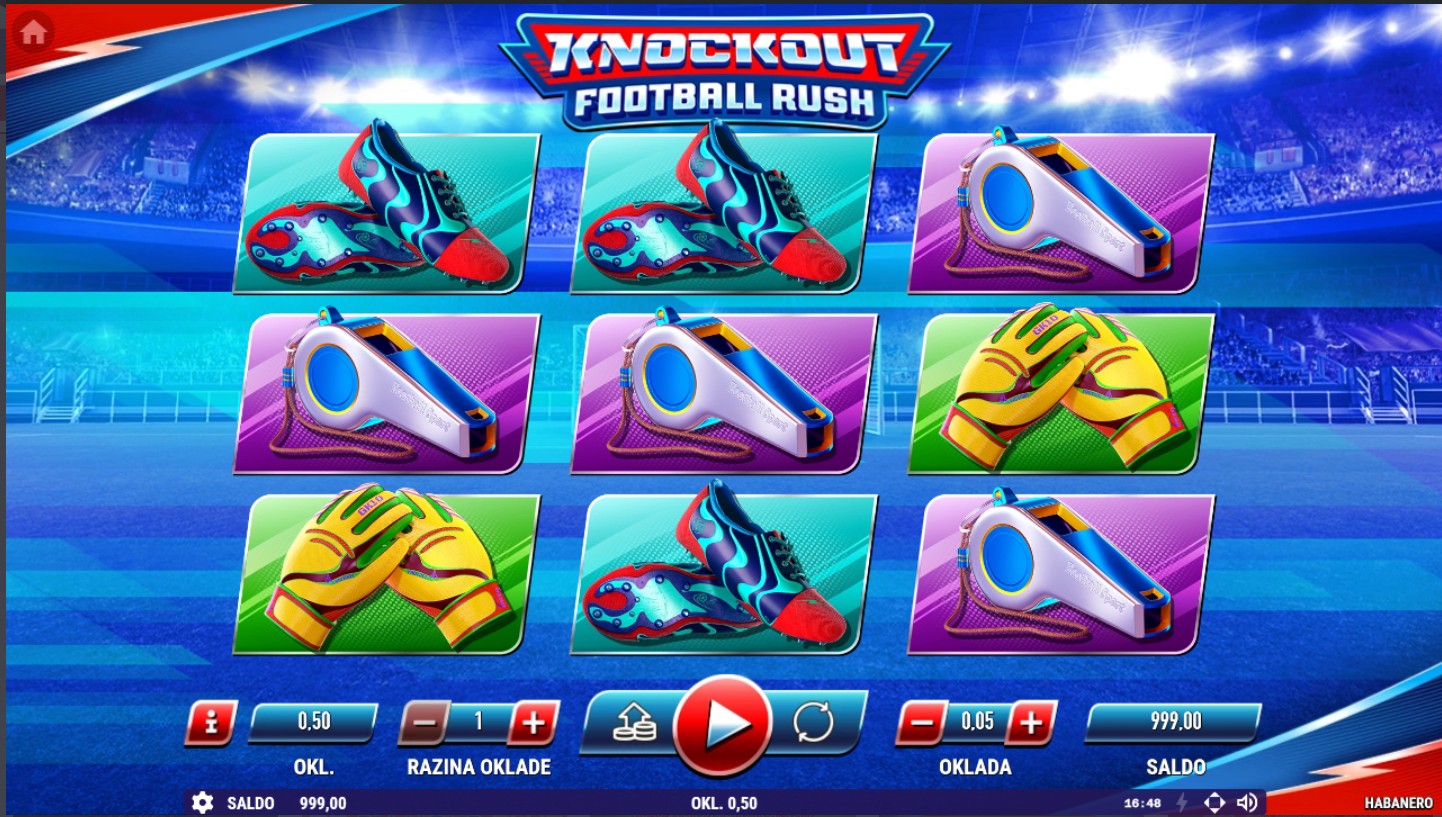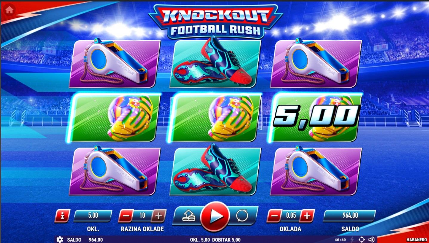 Knockout Football Rush vodi te na uzbudljivo nogometno igralište, gdje svaki spin donosi akciju, napetost i priliku za velike dobitke. Ova slot igra providera Habanero igra se na 5 bubnjeva i 25 fiksnih isplatnih linija, a posebne značajke i dinamična animacija čine igru napetom od prve do posljednje vrtnje. Posebne značajke uključuju Wild simbole, koji zamjenjuju sve ostale simbole i pomažu u stvaranju dobitnih kombinacija, te Scatter simbole, koji aktiviraju besplatne vrtnje i dodatne nagrade. Tijekom besplatnih vrtnji mogu se pojaviti multiplikatori koji povećavaju isplatu dobitaka, dok nasumične bonus funkcije donose dodatno uzbuđenje i šanse za velike nagrade.