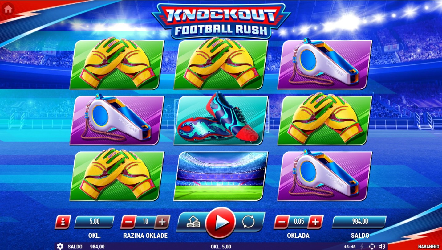 Knockout Football Rush vodi te u u uzbudljivi nogometni svijet na 5 bubnjeva i 25 fiksnih isplatnih linija. Složi dobitne kombinacije simbola s lijeva na desno kako bi osvojio nagrade, a posebne značajke podižu uzbuđenje. Wild simboli zamjenjuju sve ostale simbole i pomažu u stvaranju dobitnih kombinacija, dok Scatter simboli aktiviraju besplatne vrtnje, tijekom kojih se dobici mogu množiti s dodatnim multiplikatorima. Tijekom igre mogu se aktivirati i nasumične bonus značajke, koje dodaju dodatne Wild simbole ili dodatne besplatne vrtnje, čime svaka vrtnja postaje napeta i zabavna. Igra kombinira brzu akciju, šanse za velike nagrade i nogometnu atmosferu, idealnu za sve ljubitelje sportskih slotova.