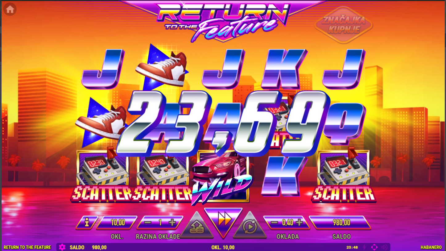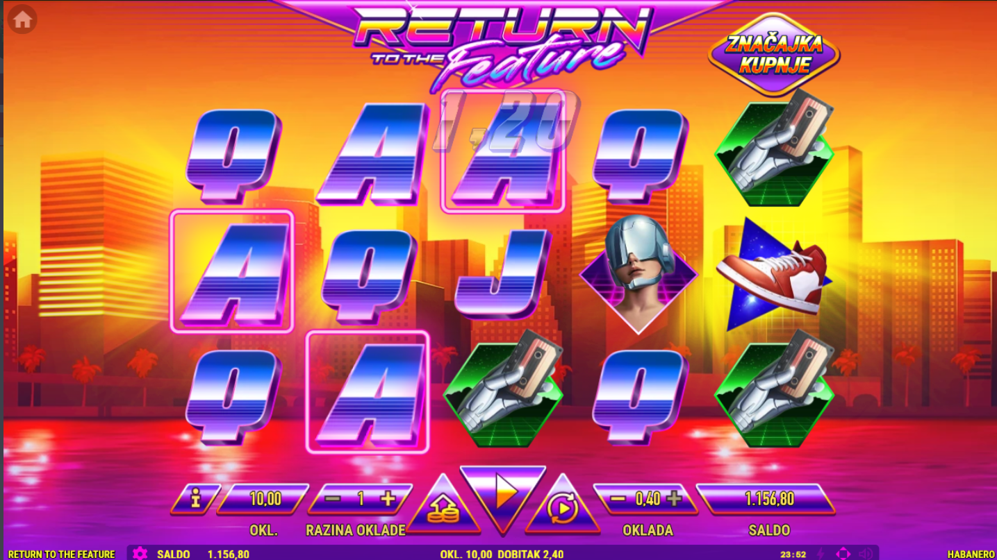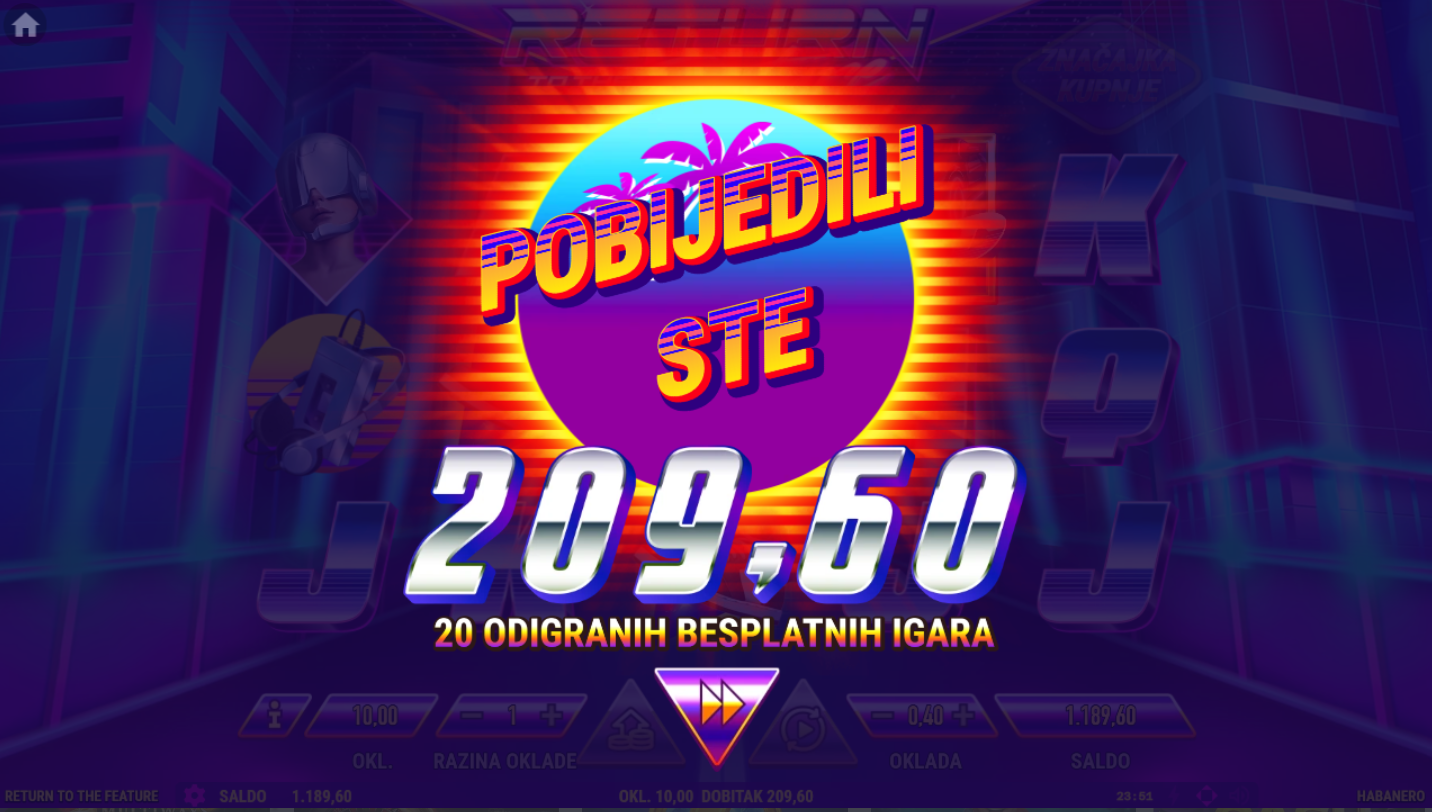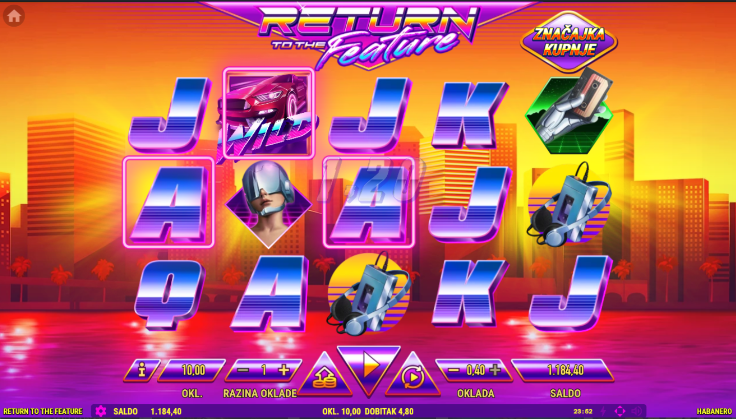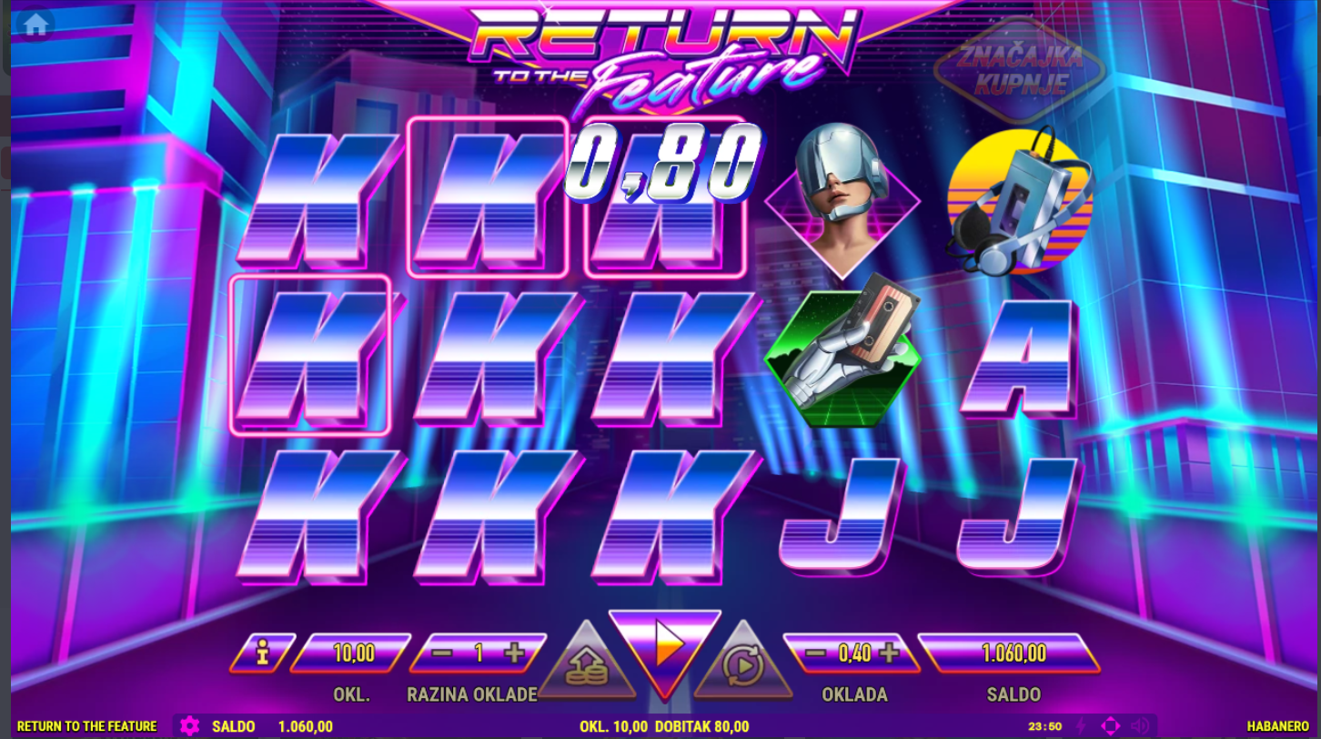 Return To The Feature od Habanero donosi šareni sviejt osamdesetih i retro vibra u modernom ruhu. Ova igra je puna neonskih boja, futurističkih automobila i instrumenata. Na kolutima su simboli koji podsjećaju na eru arkadnih igara i glamuroznih klubova. Dinamične animacije stvaraju dojam filmskog hita iz tog vremena!