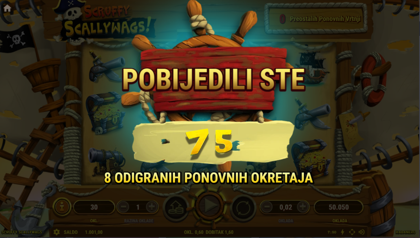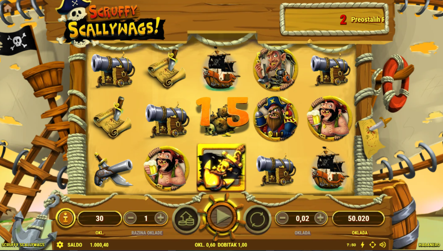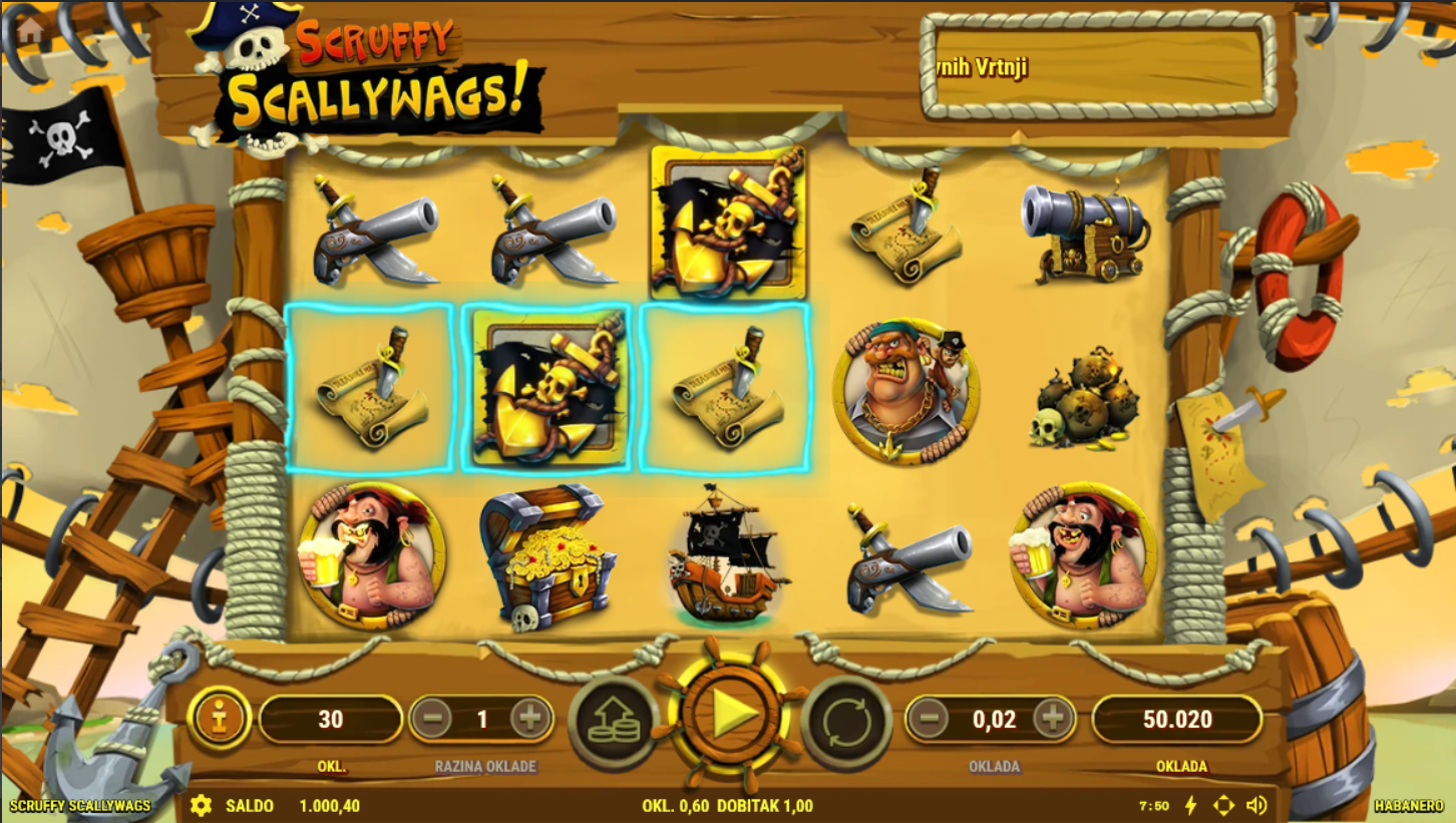 Scruffy Scallywags je piratski slot od Habanera koji donosi veselu atmosferu na palubi gusarskog broda. Igra se na 5 kolona i 30 fiksnih linija. Simboli uključuju piratske likove, sanduke s blagom, kompase i boce ruma. Šarena grafika i humoristična tematika daju igri razigran i zabavan ton.