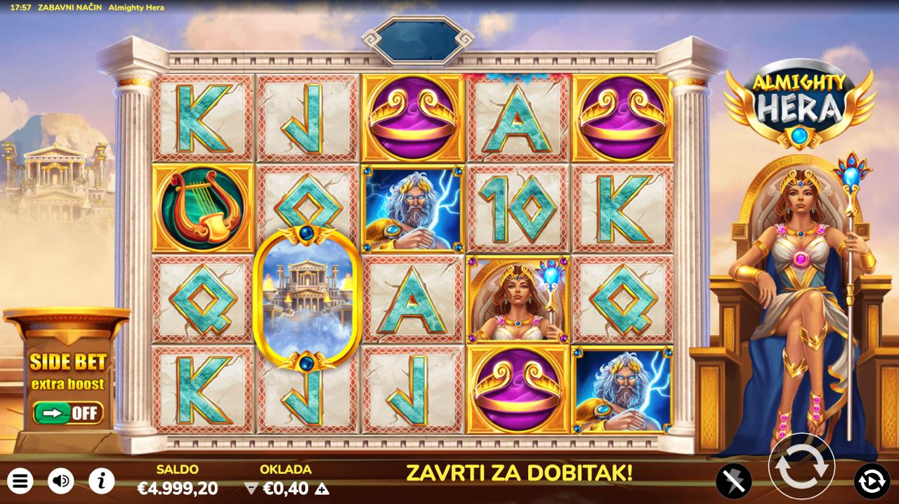 ALMIGHTY HERA je slot igra providera Oryx koja donosi klasičnu tematiku grčke mitologije, s fokusom na moćnu Heru kao glavnu figuru. Minimalni ulog iznosi 0,40 €, dok je maksimalni 12,50 €, što omogućuje i opuštenu i nešto dinamičniju igru. Iako nema jackpot, igra nudi standardne isplatne linije i prepoznatljive simboličke elemente mitološkog svijeta. Ako voliš jednostavne slotove s mitološkim dodirom — ALMIGHTY HERA je dobar izbor.