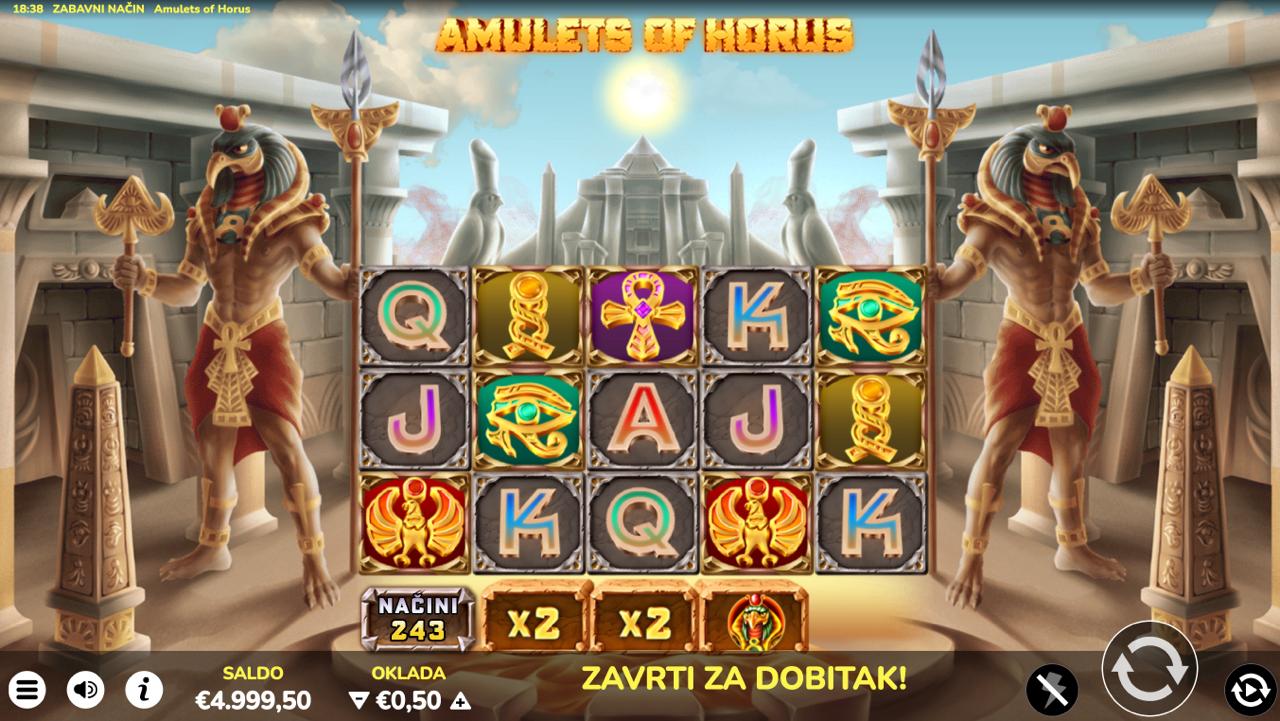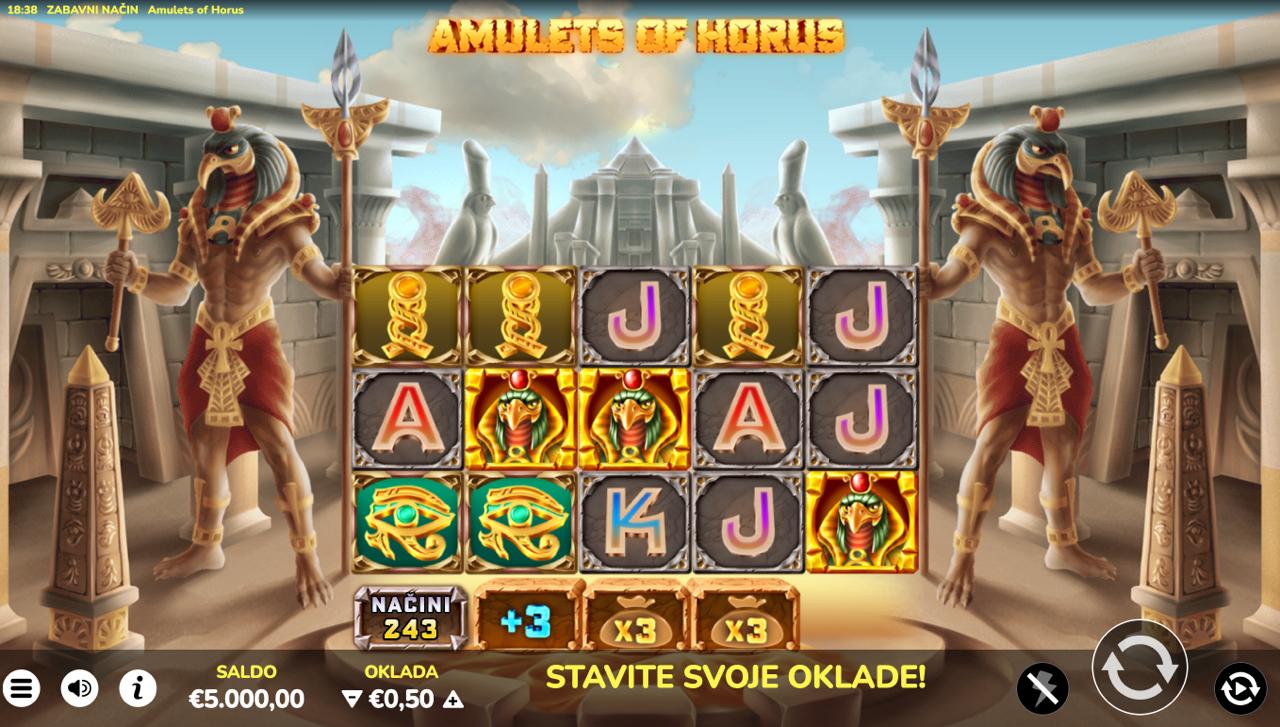 AMULETS OF HORUS je slot igra providera Oryx s temom drevnog Egipta — simboli amuleta, hijeroglifa i egipatskih motiva pružaju mističnu atmosferu i priliku za isplatu. Minimalni ulog iznosi 0,10 €, a maksimalni 12,50 €, što igru čini pristupačnom i igračima s manjim budžetom. Igra nema jackpot — dobitci se ostvaruju kroz standardne isplatne linije i osnovnu slot logiku. Ako tražiš slot s mistikom i klasičnim gameplayem — AMULETS OF HORUS može biti dobar izbor.