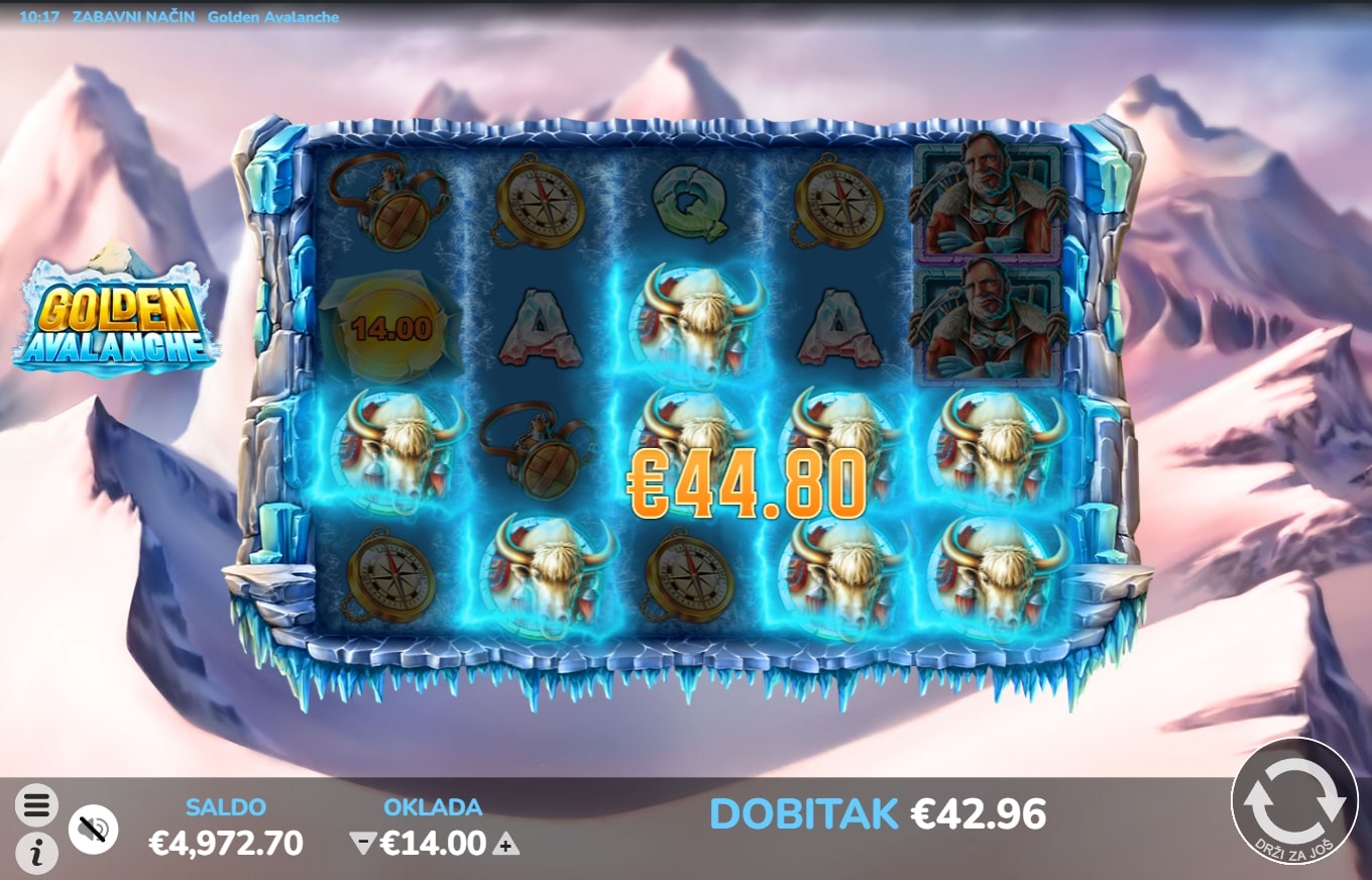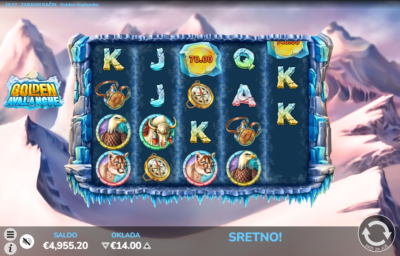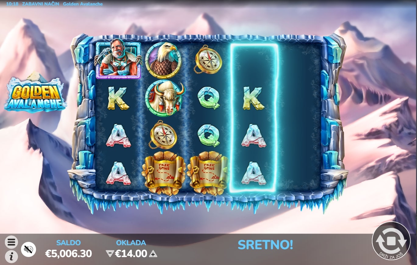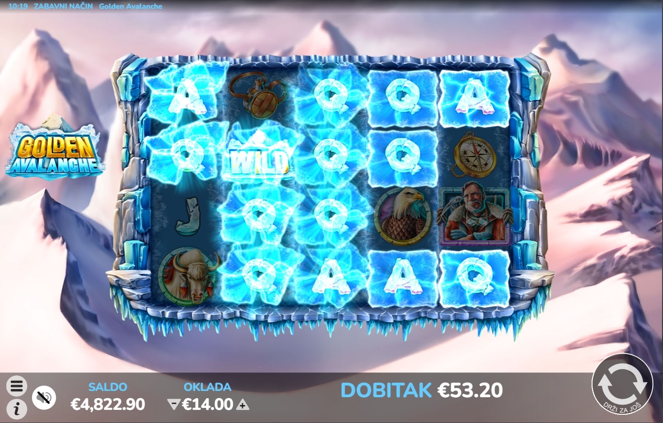 Golden Avalanche slot je igra tematskog karaktera koja vodi igrača u snježnije krajeve u potrazi za vrhunskim dobicima. Igrom dominiraju simboli s ilustracijama flore i faune hladnih te bijelih planina, dok Wild mijenja druge simbole u potrazi za dobicima. Besplatne vrtnje aktiviraju se nizanjem simbola karte, a igra također sadrži značajku padanja, što znači kako dobitni simboli isplaćuju pa nestaju te na njihovo mjesto padaju novi simboli sve dok ne ponestane dobitnih linija. Zaigraj Golden Avalanche te osvoji vatrene nagrade!