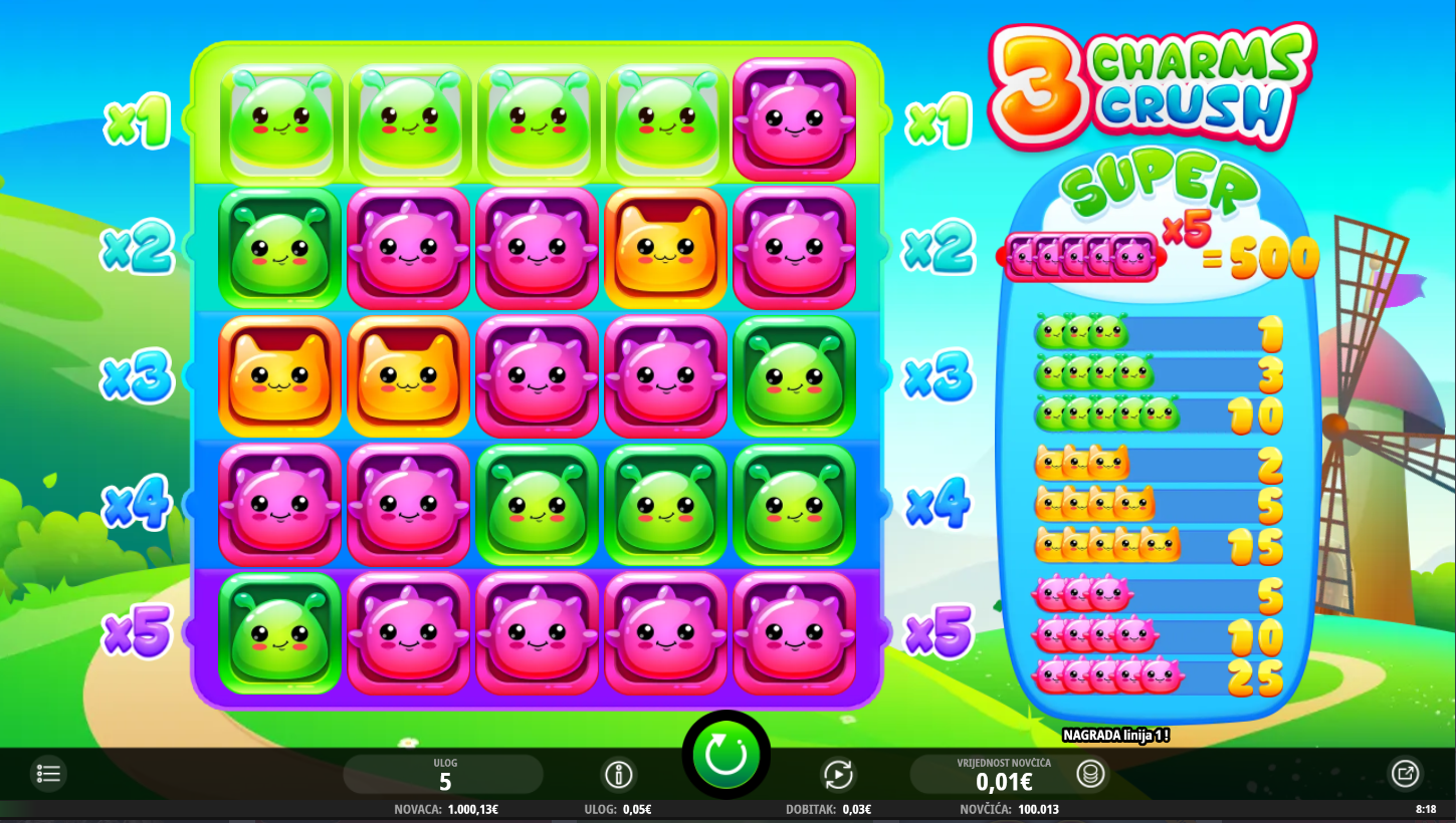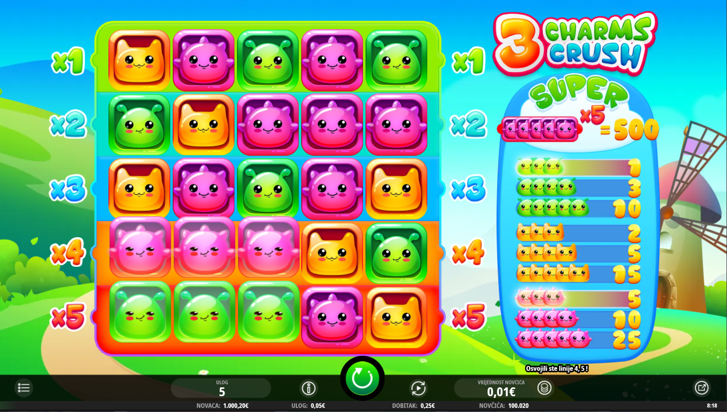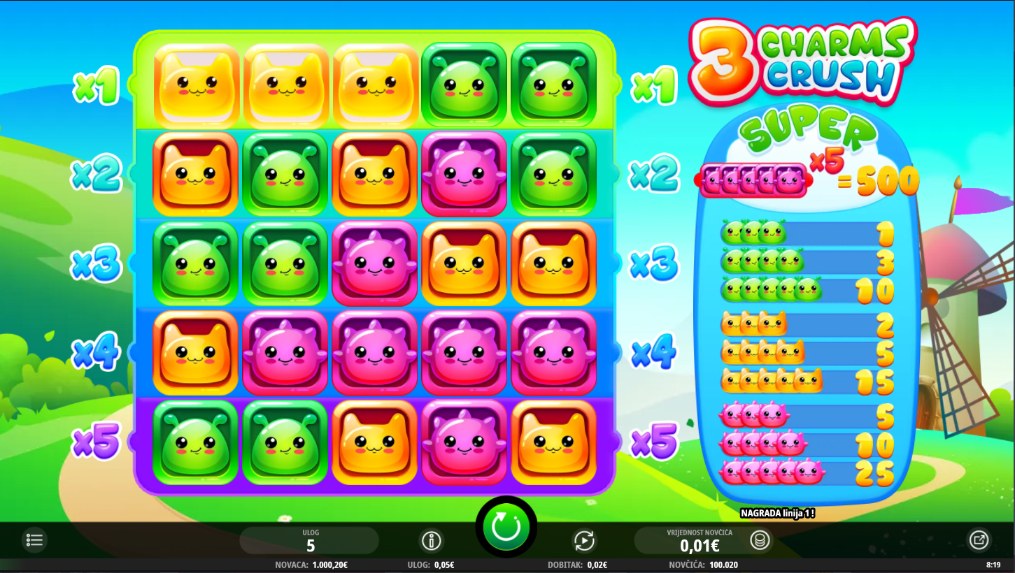 3 Charms Crush je šareni slot iSoftBeta koji spaja jednostavnost s veselom grafikom. Igra se odvija na 5 kolona i 5 dobitnih linija, s tri simpatična čarobna lika u glavnim ulogama. Nema složenih bonusa ni posebnih simbola, čista i brza zabava. Sve se vrti oko slaganja simbola i množenja dobitaka.