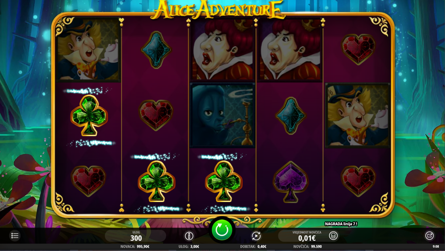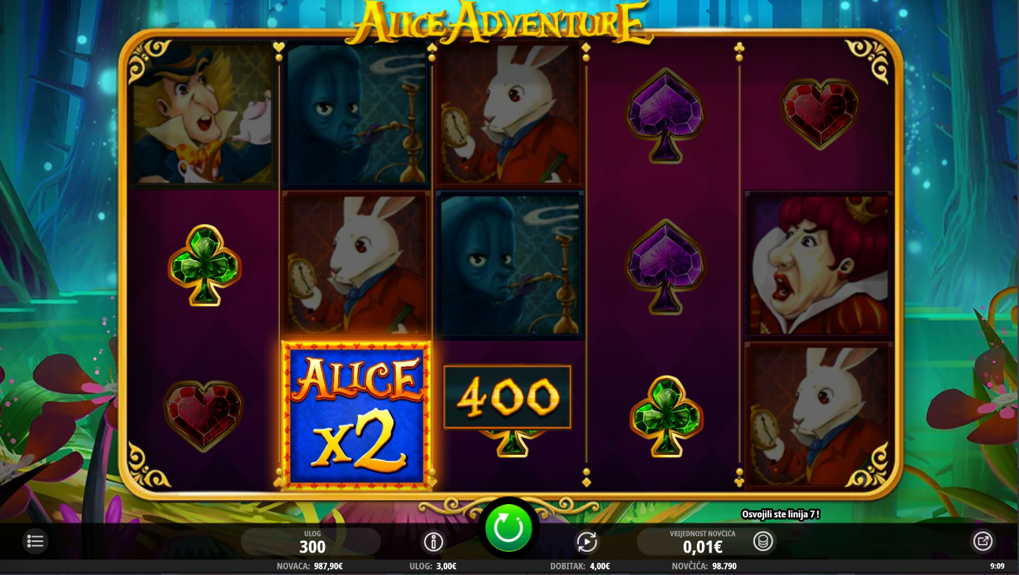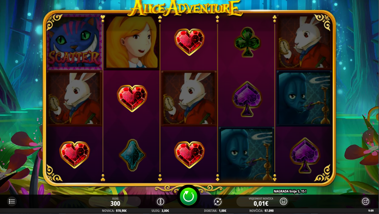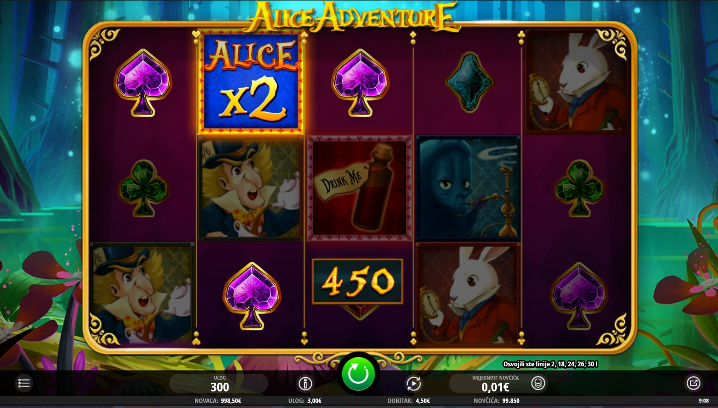 Alice Adventure je slot od iSoftBet-a inspiriran poznatom pričom o Alisi u zemlji čudesa. Igra se na 5 kolona, 3 reda i 30 fiksnih dobitnih linija. Simboli uključuju Alisu, Ludog šeširdžiju, Kraljicu srca i druge bajkovite likove. Šarena grafika i vesela glazba stvaraju čarobnu i fantastičnu atmosferu.