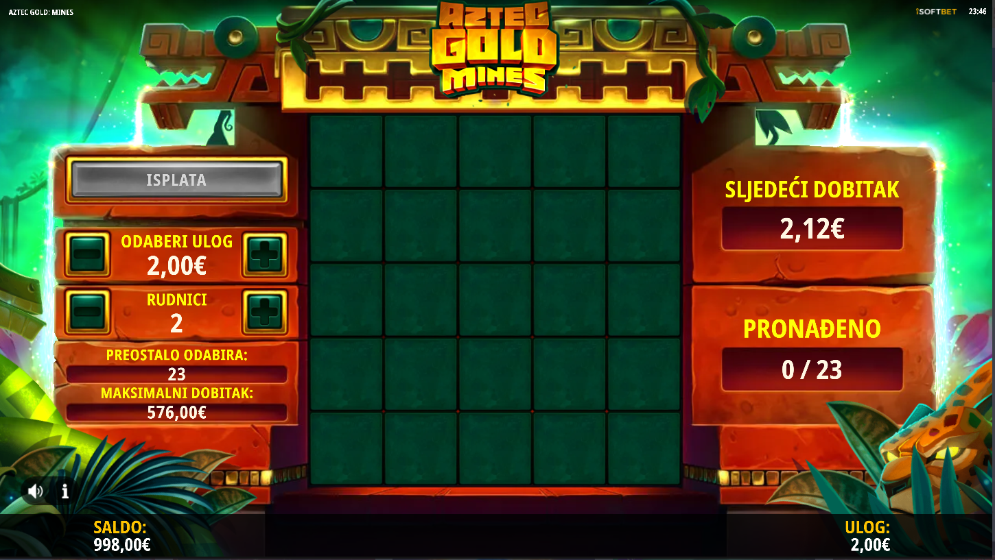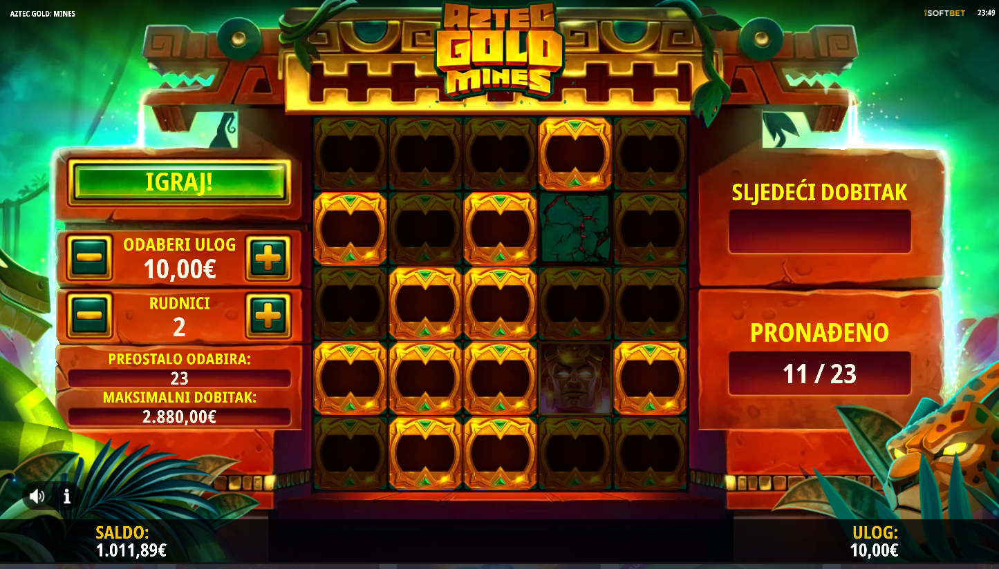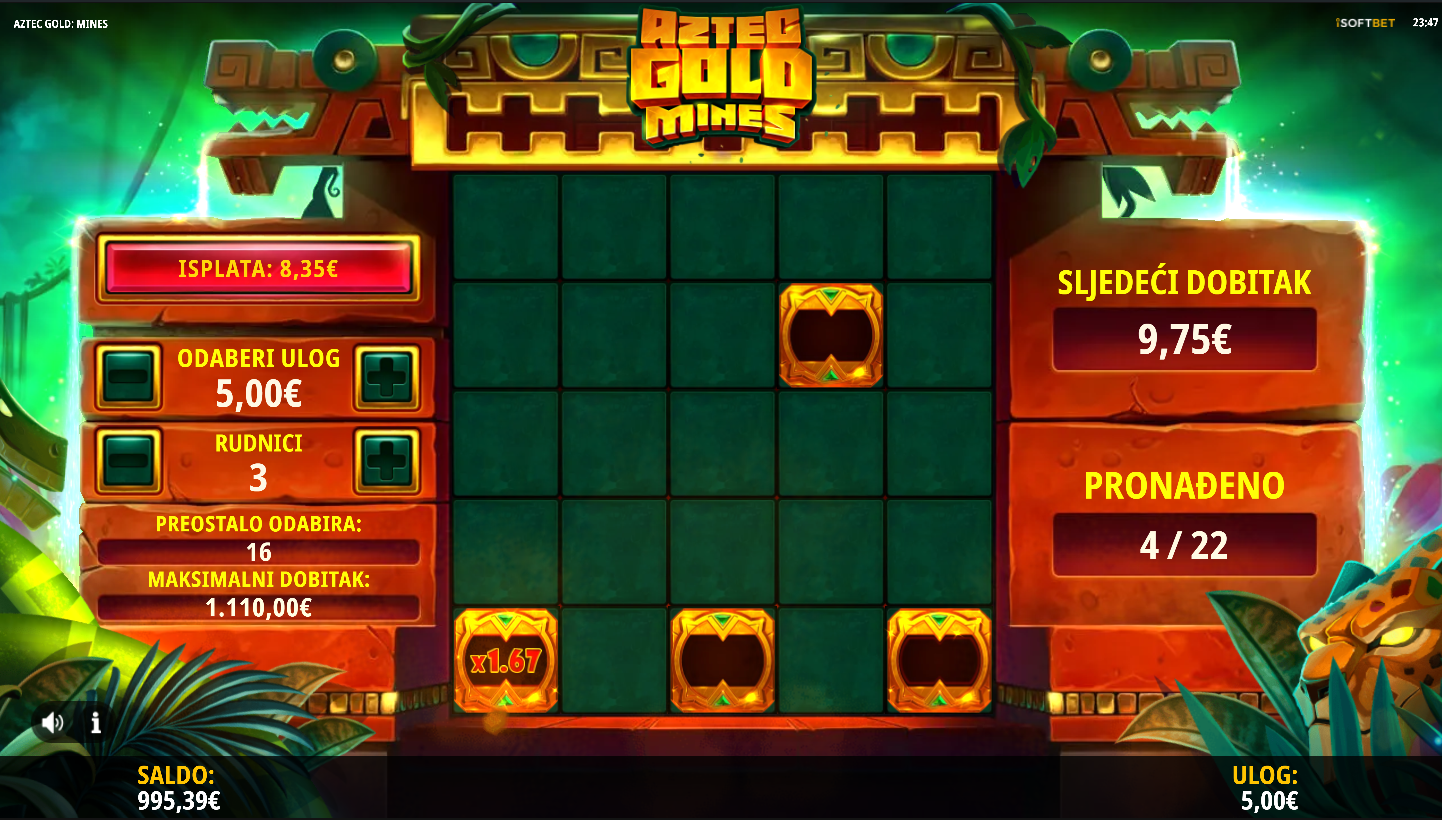 iSoftBet zajedno s Aztec Gold Mines te vode u srce džungle gdje sam biraš koliko mina želiš izbjeći na mreži 5×5. Kako biraš manje mina, RTP ide i do 98.88?%, dok veći broj mina donosi veći rizik i potencijalno veće mnoštvo multiplikatora. Nema klasičnog slota ni bubnjeva, igra je više poput interaktivnog lova na blago u kojem svaki odabir može pretvoriti igru u zlatni prah ili kraj avanture.