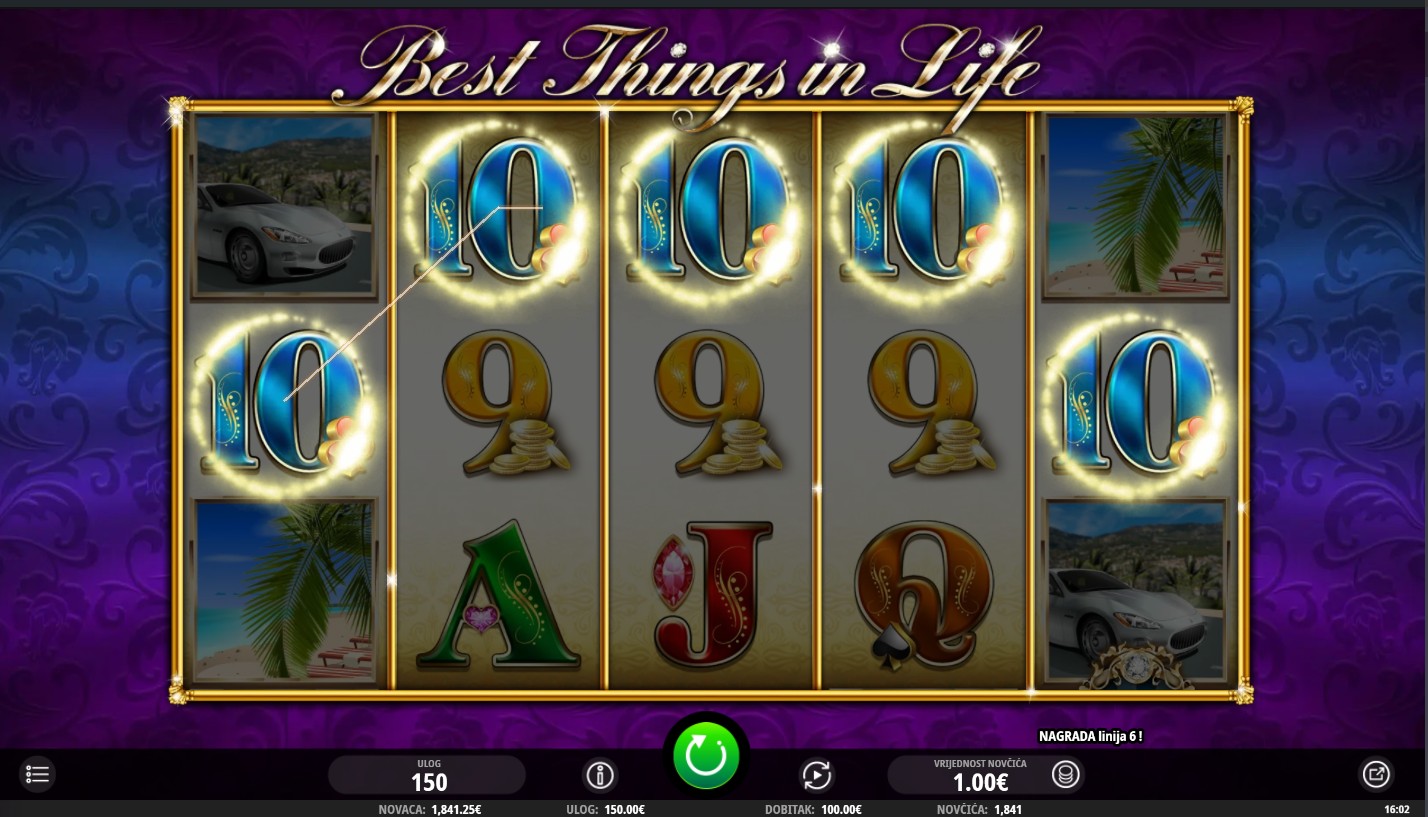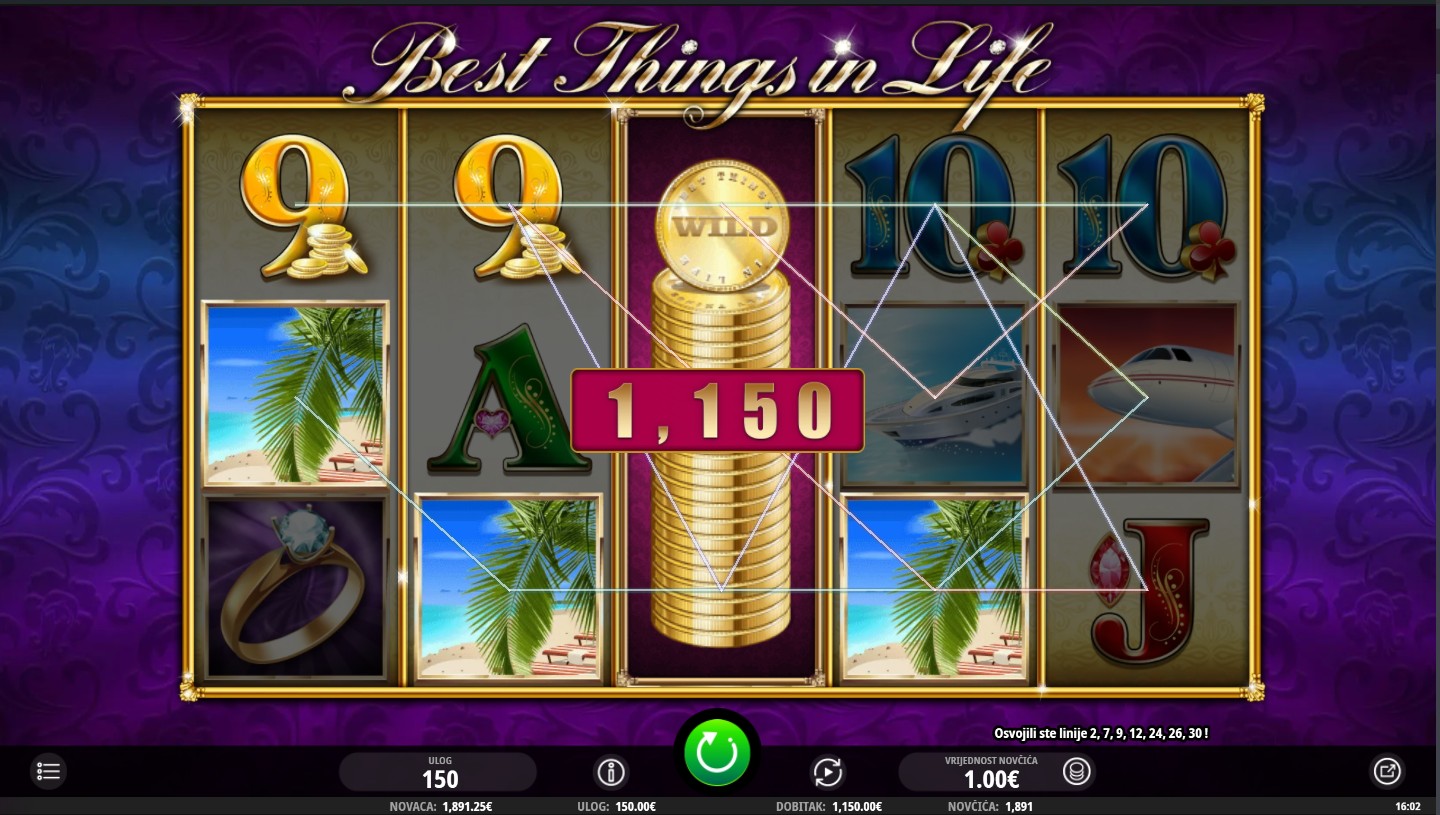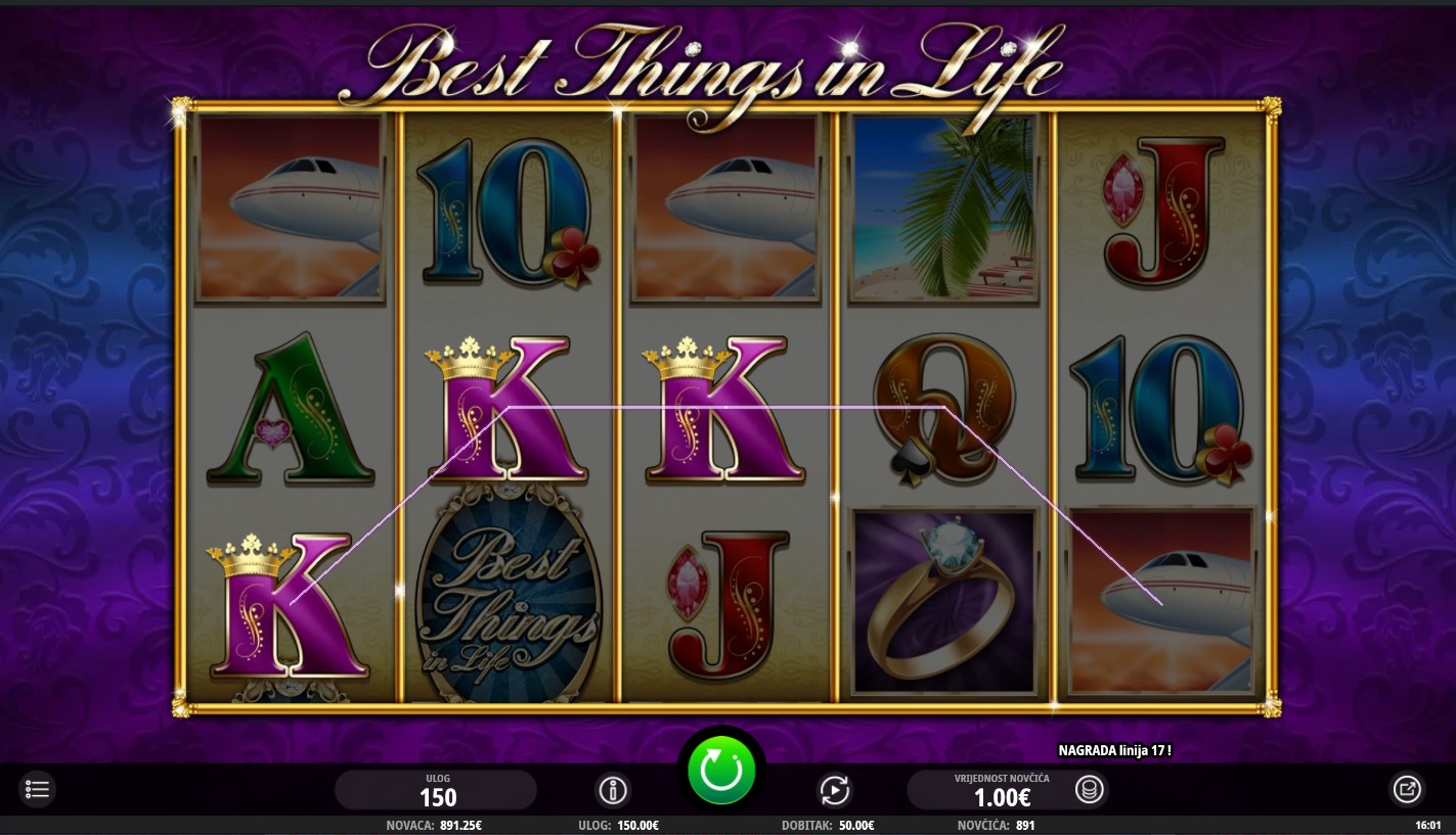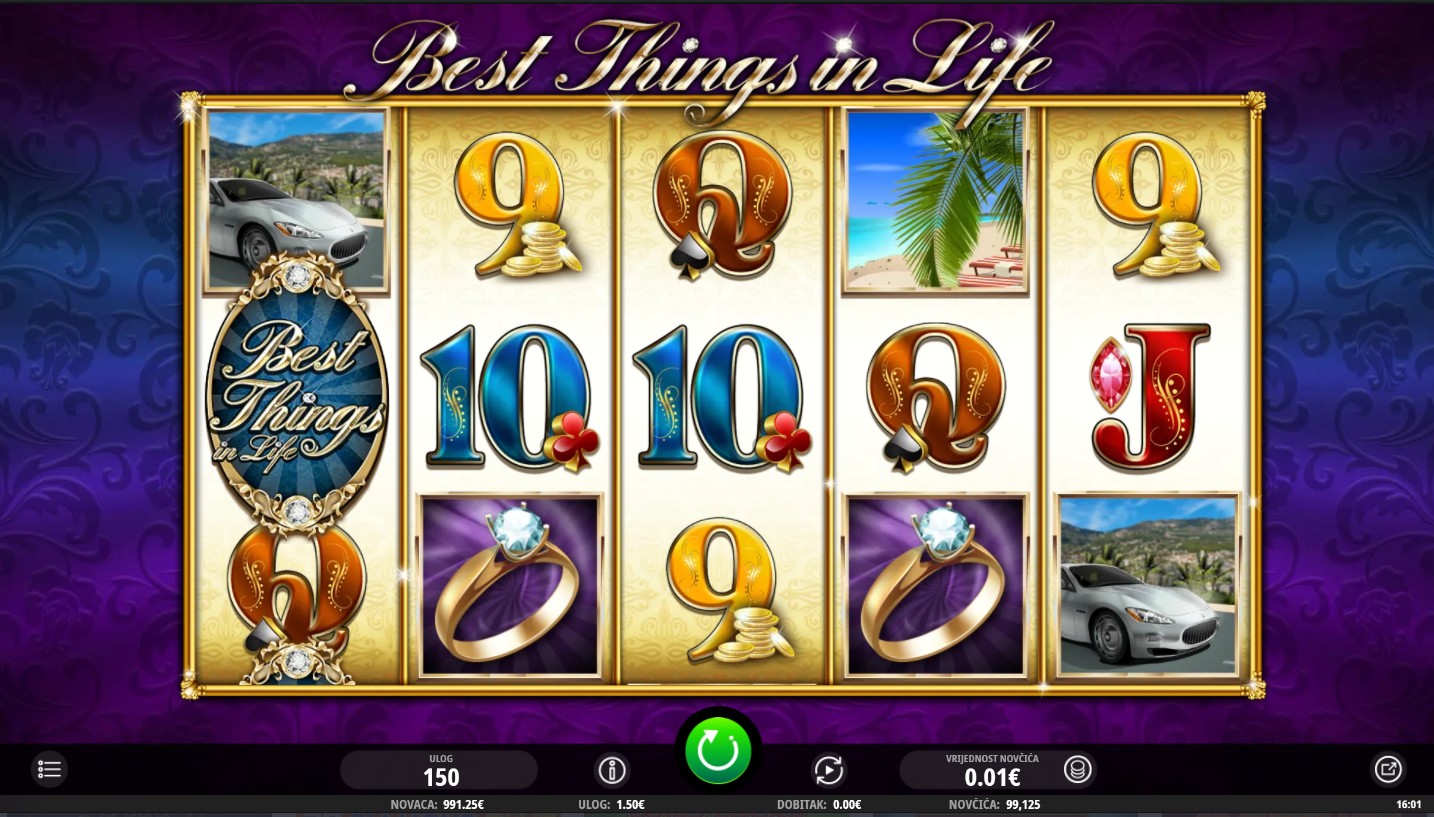 Best things in life vodi te u zabavnu igru na 5 bubnjeva i 30 fiksnih linija gdje trebaš složiti dobitne kombinacije simbola slijeva nadesno. Iskoristi Wild simbol za zamjenu simbola i proširenje dobitaka, a Scatter simbol aktivira besplatne vrtnje s multiplikatorima koji rastu do 5x. Svaki spin donosi ravnotežu između česte akcije i napetih trenutaka s bonus značajkama.
