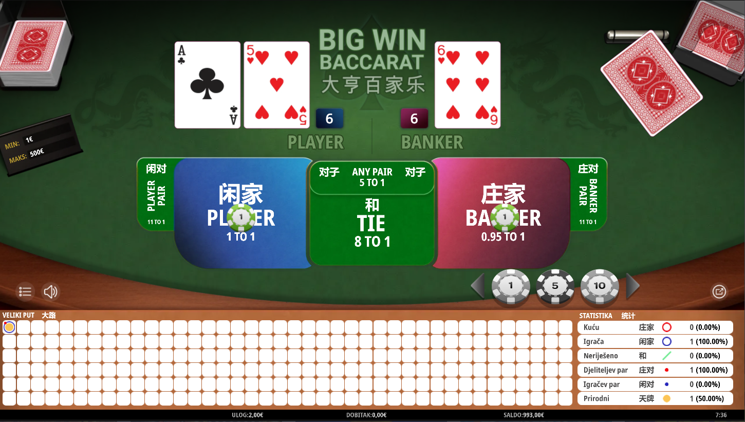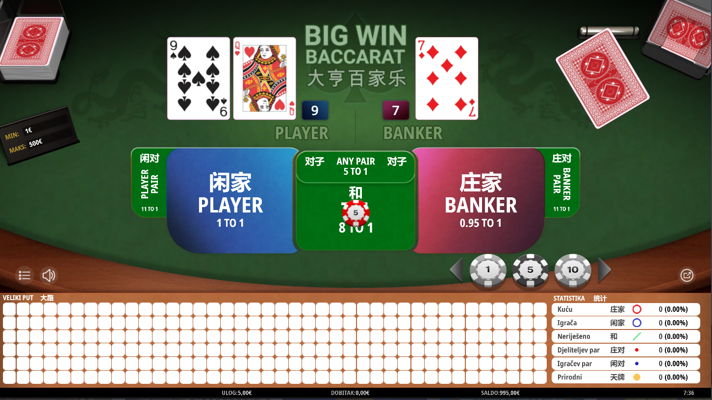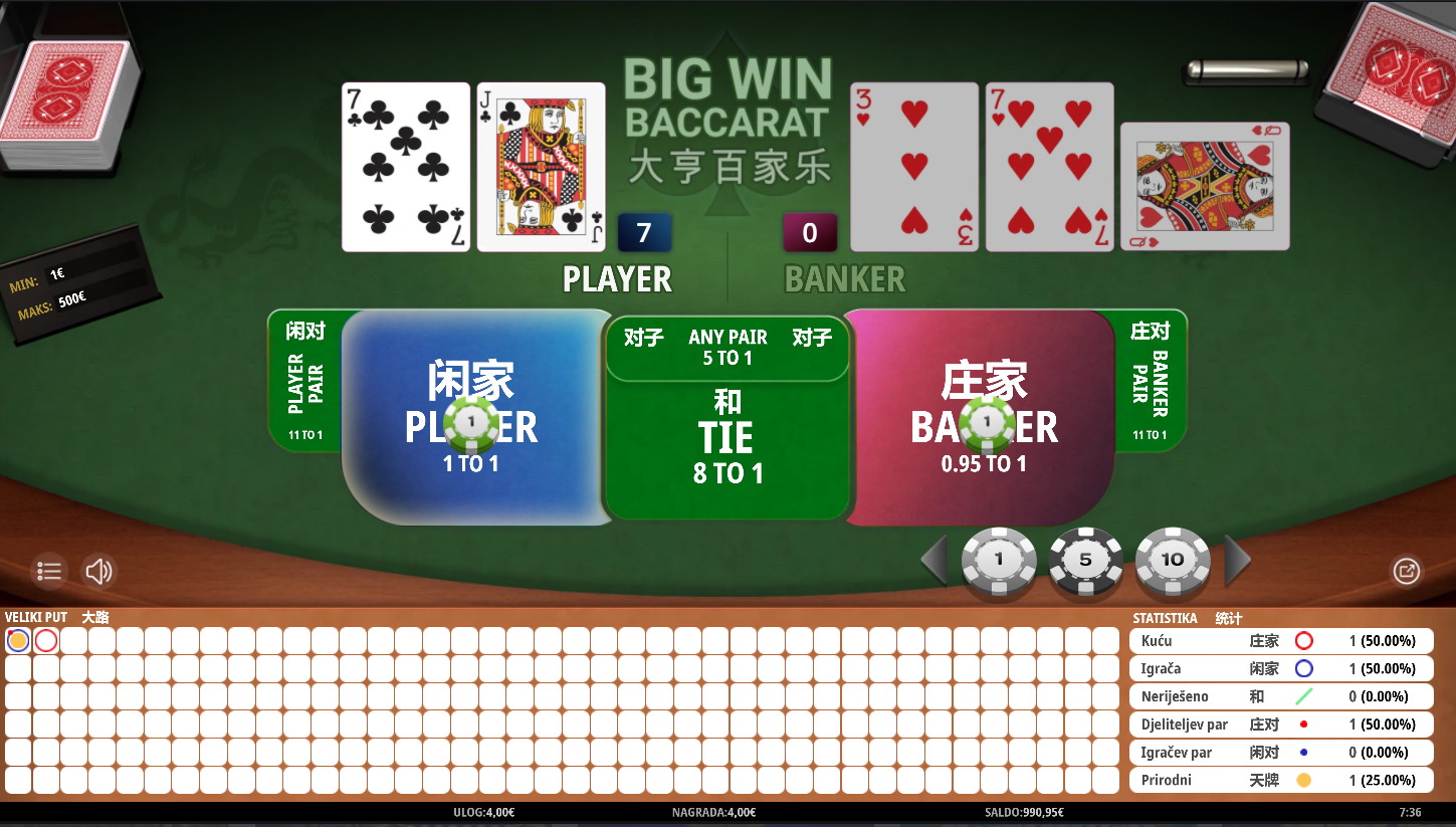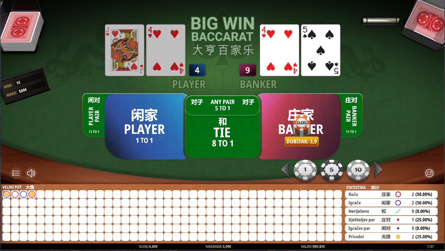 4. Koji su minimalni i maksimalni ulozi u igri Big Win Baccarat?