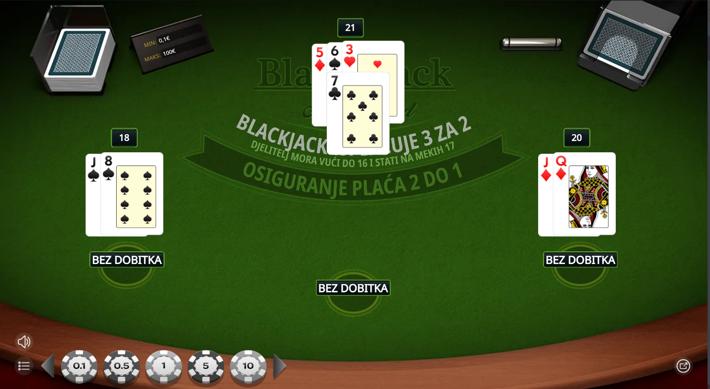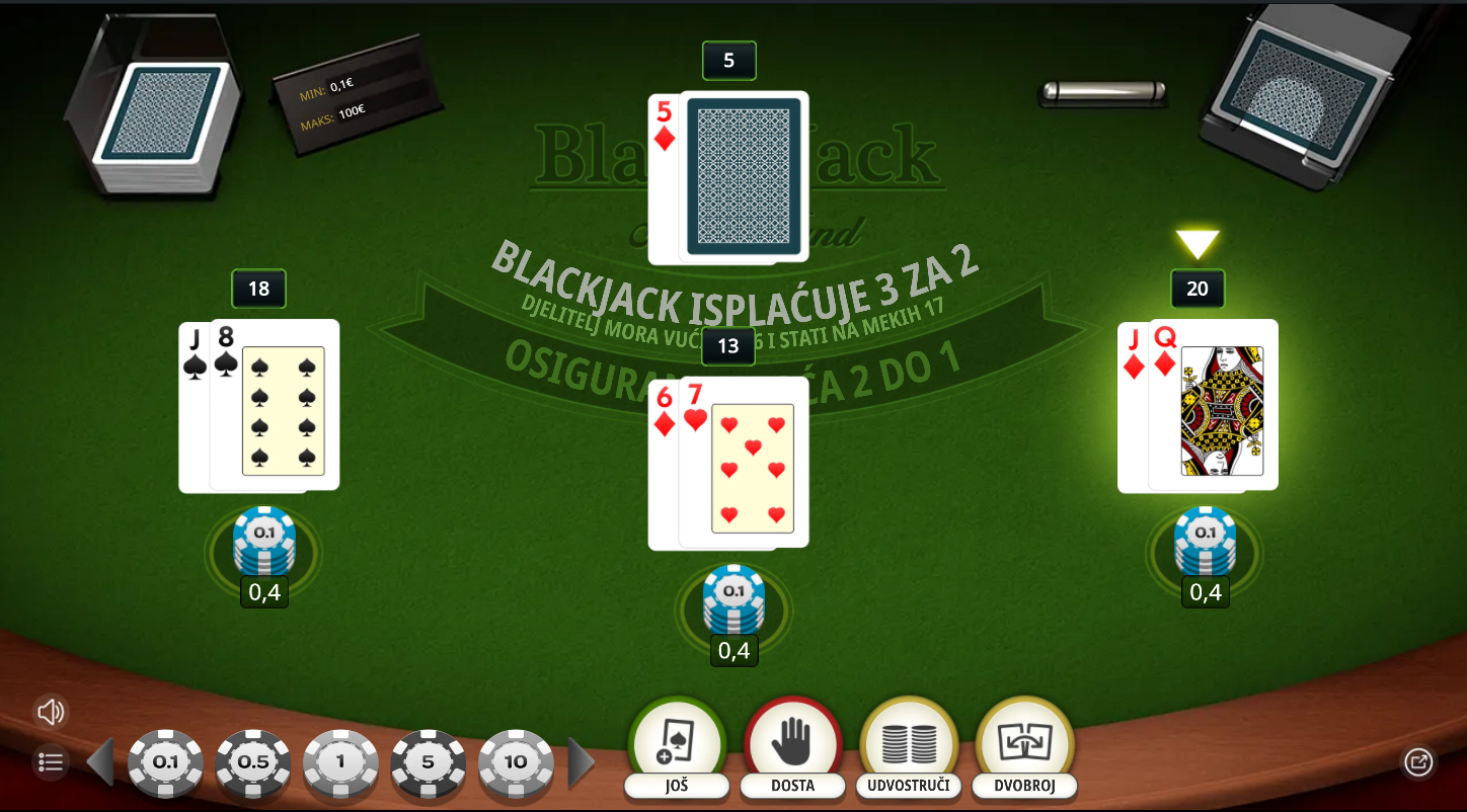 Postavi ulog, odaberi broj ruku i kreni! Svaka ruka igra se zasebno, pa možeš riskirati s jednom, a igrati sigurno s drugom jer ovo je tvoj potez i tvoja taktika. Uz više dostupnih opcija, sve se odvija brzo i pregledno. Nakon što odigraš sve ruke, djelitelj otkriva svoje karte, i tu kreće prava napetost. Idealan blackjack za one koji žele više kontrole i više akcije u jednoj rundi.