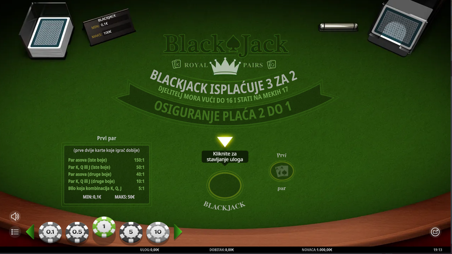 4. Koji su minimalni i maksimalni ulozi u igri Blackjack Royal Pairs?