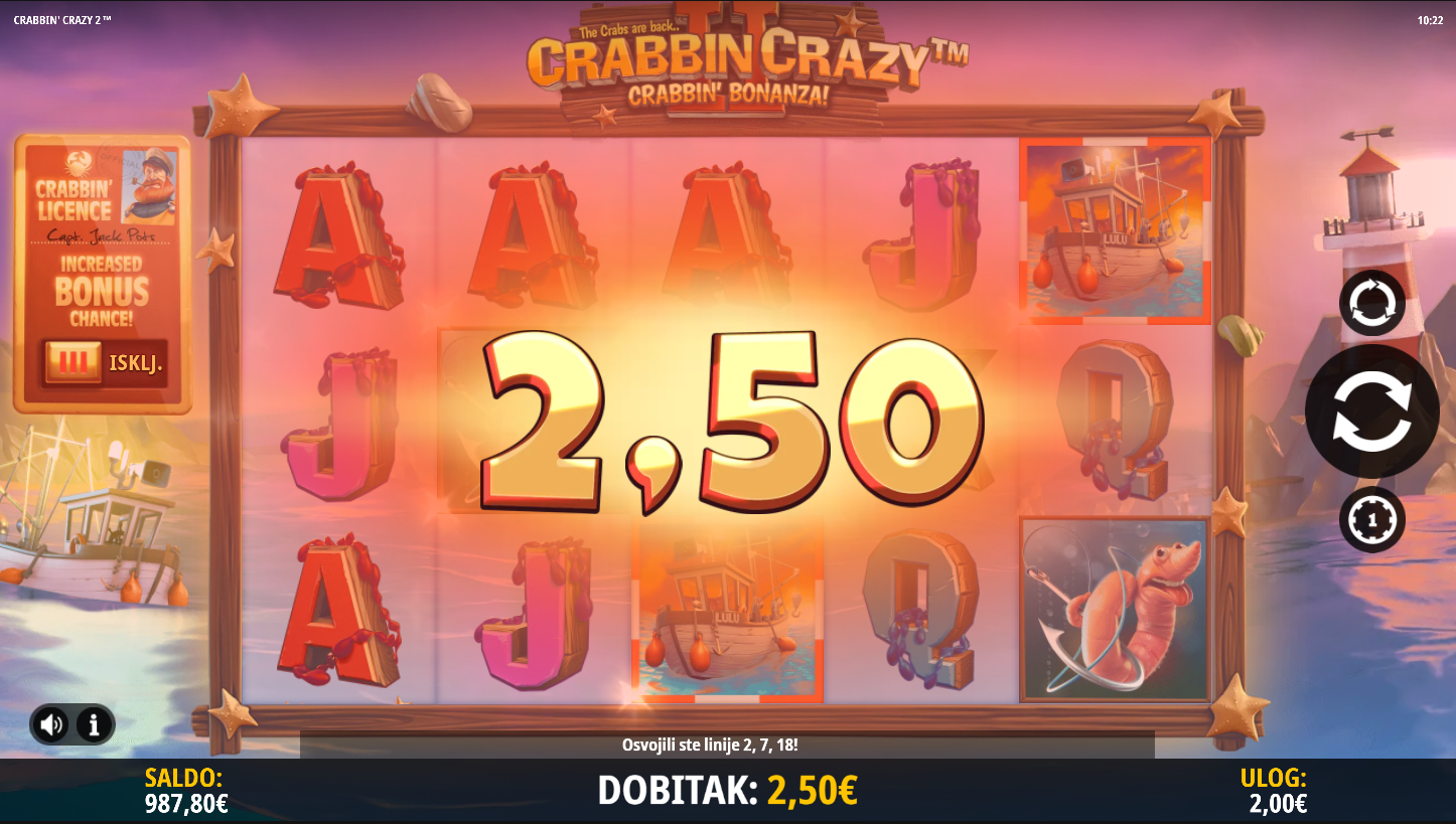 iSoftBet donosi Crabbin' Crazy 2 ™,veselu morsku avanturu, gdje rakovi, ribari i kante s iznenađenjima vladaju svakim kolutom. Igra izgleda kao crtani film, s pregršt boja, karipskom glazbom i morskim šarmom. Simpatični detalji i nasumične značajke pretvaraju svaku igru u laganu, zabavnu vožnju punu obrata. Ako voliš vedru atmosferu, veseli tempo i more neočekivanih situacija, ova igra će ti leći kao brod na bonaci.