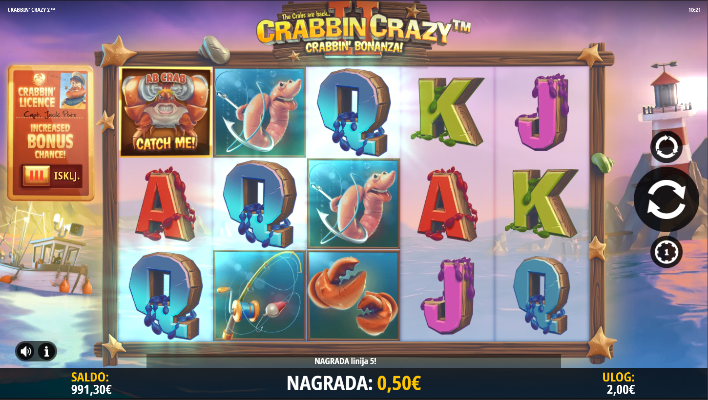 Crabbin' Crazy 2 ™ dolazi s RTP-om od 95.93% i nižom do srednjom volatilnošću, što znači da te očekuju česti dobici uz lagani ritam igre. Nema drame, ali zato ima puno akcije, morskih iznenađenja i bonus trenutaka. Idealno je za igrače koji žele zabavnu i opuštenu igru, uz mogućnost da povremeno ulove nešto veće. Svaki spin može biti novi ulov, a kad krene bonus, val zabave ne prestaje.