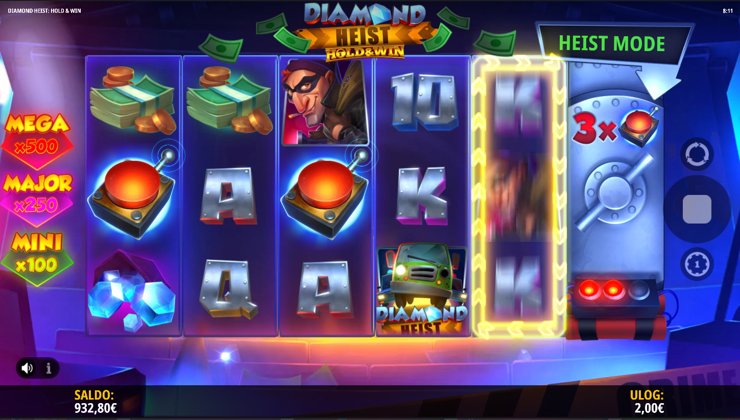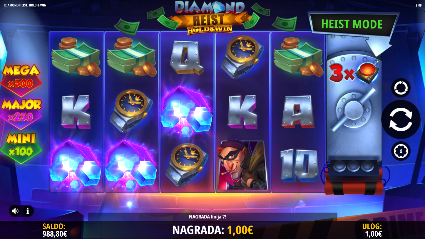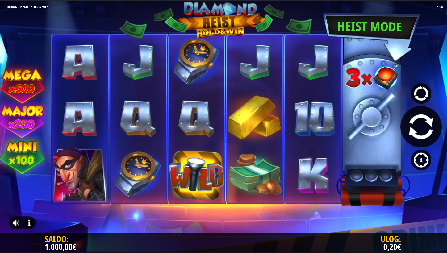 Diamond Heist: Hold & Win nudi RTP od 96% i srednje-visoku volatilnost, što znači da te čeka uzbudljiv balans između stabilne igre i adrenalinskih trenutaka. Svaki spin ima šanse za isplatu, ali pravo uzbuđenje tek te čeka u bonus rundama.